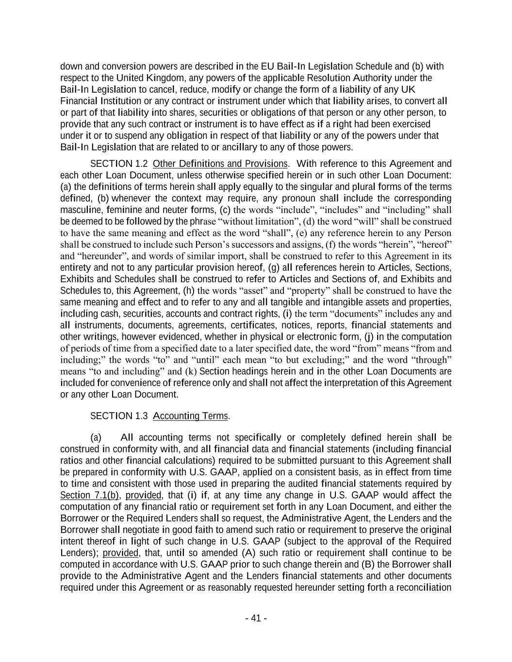 - 41 - down and conversion powers are described in the EU Bail-In Legislation Schedule and (b) with respect to the United Kingdom, any powers of the applicable Resolution Authority under the Bail-In Legislation to cancel, reduce, modify or change the form of a liability of any UK Financial Institution or any contract or instrument under which that liability arises, to convert all or part of that liability into shares, securities or obligations of that person or any other person, to provide that any such contract or instrument is to have effect as if a right had been exercised under it or to suspend any obligation in respect of that liability or any of the powers under that Bail-In Legislation that are related to or ancillary to any of those powers. SECTION 1.2 Other Definitions and Provisions. With reference to this Agreement and each other Loan Document, unless otherwise specified herein or in such other Loan Document: (a) the definitions of terms herein shall apply equally to the singular and plural forms of the terms defined, (b) whenever the context may require, any pronoun shall include the corresponding masculine, feminine and neuter forms, (c) the words “include”, “includes” and “including” shall be deemed to be followed by the phrase “without limitation”, (d) the word “will” shall be construed to have the same meaning and effect as the word “shall”, (e) any reference herein to any Person shall be construed to include such Person’s successors and assigns, (f) the words “herein”, “hereof” and “hereunder”, and words of similar import, shall be construed to refer to this Agreement in its entirety and not to any particular provision hereof, (g) all references herein to Articles, Sections, Exhibits and Schedules shall be construed to refer to Articles and Sections of, and Exhibits and Schedules to, this Agreement, (h) the words “asset” and “property” shall be construed to have the same meaning and effect and to refer to any and all tangible and intangible assets and properties, including cash, securities, accounts and contract rights, (i) the term “documents” includes any and all instruments, documents, agreements, certificates, notices, reports, financial statements and other writings, however evidenced, whether in physical or electronic form, (j) in the computation of periods of time from a specified date to a later specified date, the word “from” means “from and including;” the words “to” and “until” each mean “to but excluding;” and the word “through” means “to and including” and (k) Section headings herein and in the other Loan Documents are included for convenience of reference only and shall not affect the interpretation of this Agreement or any other Loan Document. SECTION 1.3 Accounting Terms. (a) All accounting terms not specifically or completely defined herein shall be construed in conformity with, and all financial data and financial statements (including financial ratios and other financial calculations) required to be submitted pursuant to this Agreement shall be prepared in conformity with U.S. GAAP, applied on a consistent basis, as in effect from time to time and consistent with those used in preparing the audited financial statements required by Section 7.1(b), provided, that (i) if, at any time any change in U.S. GAAP would affect the computation of any financial ratio or requirement set forth in any Loan Document, and either the Borrower or the Required Lenders shall so request, the Administrative Agent, the Lenders and the Borrower shall negotiate in good faith to amend such ratio or requirement to preserve the original intent thereof in light of such change in U.S. GAAP (subject to the approval of the Required Lenders); provided, that, until so amended (A) such ratio or requirement shall continue to be computed in accordance with U.S. GAAP prior to such change therein and (B) the Borrower shall provide to the Administrative Agent and the Lenders financial statements and other documents required under this Agreement or as reasonably requested hereunder setting forth a reconciliation