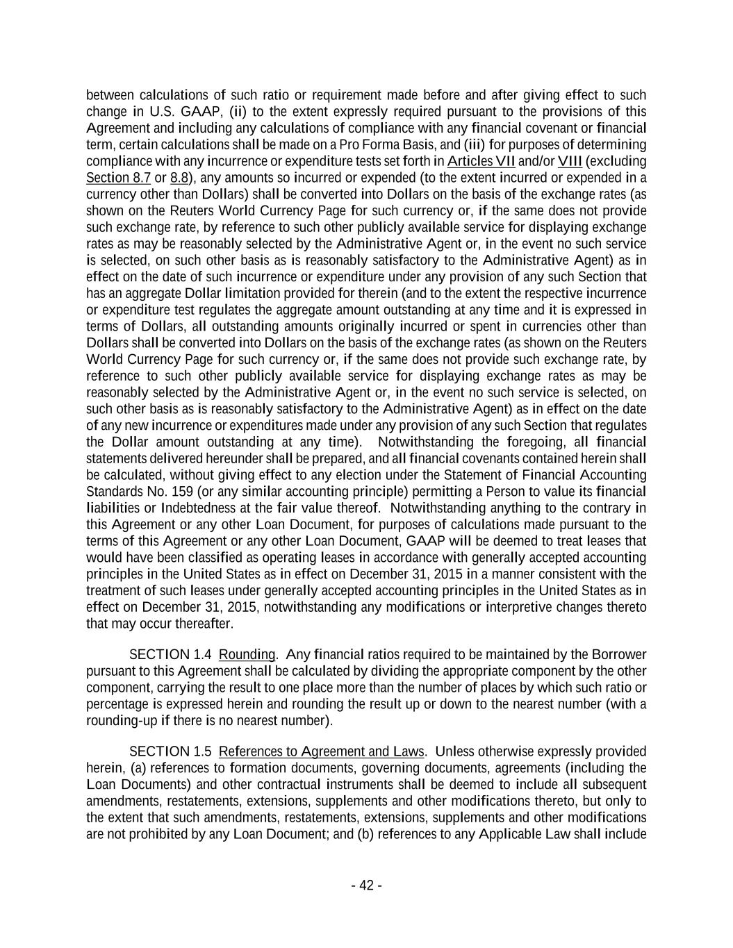 - 42 - between calculations of such ratio or requirement made before and after giving effect to such change in U.S. GAAP, (ii) to the extent expressly required pursuant to the provisions of this Agreement and including any calculations of compliance with any financial covenant or financial term, certain calculations shall be made on a Pro Forma Basis, and (iii) for purposes of determining compliance with any incurrence or expenditure tests set forth in Articles VII and/or VIII (excluding Section 8.7 or 8.8), any amounts so incurred or expended (to the extent incurred or expended in a currency other than Dollars) shall be converted into Dollars on the basis of the exchange rates (as shown on the Reuters World Currency Page for such currency or, if the same does not provide such exchange rate, by reference to such other publicly available service for displaying exchange rates as may be reasonably selected by the Administrative Agent or, in the event no such service is selected, on such other basis as is reasonably satisfactory to the Administrative Agent) as in effect on the date of such incurrence or expenditure under any provision of any such Section that has an aggregate Dollar limitation provided for therein (and to the extent the respective incurrence or expenditure test regulates the aggregate amount outstanding at any time and it is expressed in terms of Dollars, all outstanding amounts originally incurred or spent in currencies other than Dollars shall be converted into Dollars on the basis of the exchange rates (as shown on the Reuters World Currency Page for such currency or, if the same does not provide such exchange rate, by reference to such other publicly available service for displaying exchange rates as may be reasonably selected by the Administrative Agent or, in the event no such service is selected, on such other basis as is reasonably satisfactory to the Administrative Agent) as in effect on the date of any new incurrence or expenditures made under any provision of any such Section that regulates the Dollar amount outstanding at any time). Notwithstanding the foregoing, all financial statements delivered hereunder shall be prepared, and all financial covenants contained herein shall be calculated, without giving effect to any election under the Statement of Financial Accounting Standards No. 159 (or any similar accounting principle) permitting a Person to value its financial liabilities or Indebtedness at the fair value thereof. Notwithstanding anything to the contrary in this Agreement or any other Loan Document, for purposes of calculations made pursuant to the terms of this Agreement or any other Loan Document, GAAP will be deemed to treat leases that would have been classified as operating leases in accordance with generally accepted accounting principles in the United States as in effect on December 31, 2015 in a manner consistent with the treatment of such leases under generally accepted accounting principles in the United States as in effect on December 31, 2015, notwithstanding any modifications or interpretive changes thereto that may occur thereafter. SECTION 1.4 Rounding. Any financial ratios required to be maintained by the Borrower pursuant to this Agreement shall be calculated by dividing the appropriate component by the other component, carrying the result to one place more than the number of places by which such ratio or percentage is expressed herein and rounding the result up or down to the nearest number (with a rounding-up if there is no nearest number). SECTION 1.5 References to Agreement and Laws. Unless otherwise expressly provided herein, (a) references to formation documents, governing documents, agreements (including the Loan Documents) and other contractual instruments shall be deemed to include all subsequent amendments, restatements, extensions, supplements and other modifications thereto, but only to the extent that such amendments, restatements, extensions, supplements and other modifications are not prohibited by any Loan Document; and (b) references to any Applicable Law shall include