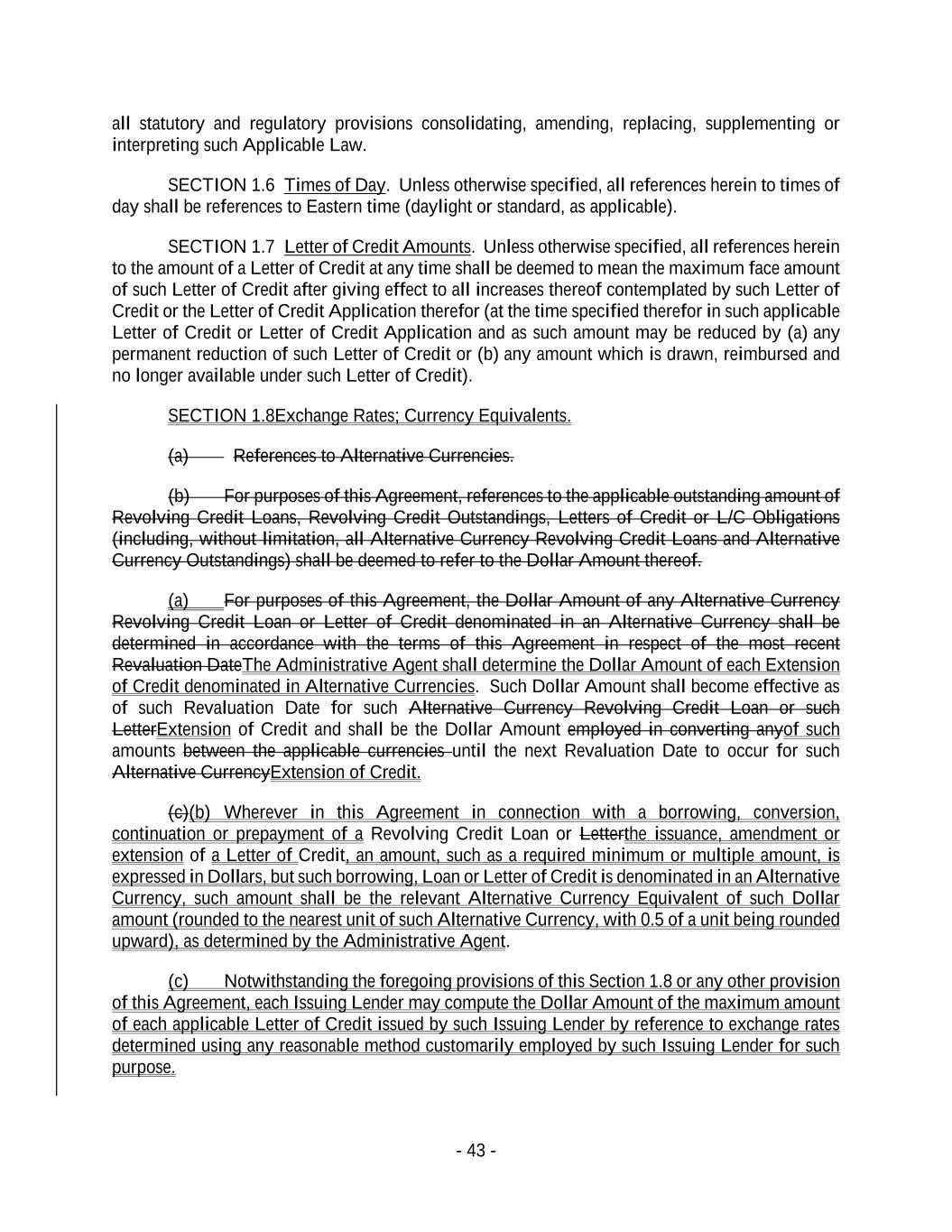 - 43 - all statutory and regulatory provisions consolidating, amending, replacing, supplementing or interpreting such Applicable Law. SECTION 1.6 Times of Day. Unless otherwise specified, all references herein to times of day shall be references to Eastern time (daylight or standard, as applicable). SECTION 1.7 Letter of Credit Amounts. Unless otherwise specified, all references herein to the amount of a Letter of Credit at any time shall be deemed to mean the maximum face amount of such Letter of Credit after giving effect to all increases thereof contemplated by such Letter of Credit or the Letter of Credit Application therefor (at the time specified therefor in such applicable Letter of Credit or Letter of Credit Application and as such amount may be reduced by (a) any permanent reduction of such Letter of Credit or (b) any amount which is drawn, reimbursed and no longer available under such Letter of Credit). SECTION 1.8Exchange Rates; Currency Equivalents. (a) References to Alternative Currencies. (b) For purposes of this Agreement, references to the applicable outstanding amount of Revolving Credit Loans, Revolving Credit Outstandings, Letters of Credit or L/C Obligations (including, without limitation, all Alternative Currency Revolving Credit Loans and Alternative Currency Outstandings) shall be deemed to refer to the Dollar Amount thereof. (a) For purposes of this Agreement, the Dollar Amount of any Alternative Currency Revolving Credit Loan or Letter of Credit denominated in an Alternative Currency shall be determined in accordance with the terms of this Agreement in respect of the most recent Revaluation DateThe Administrative Agent shall determine the Dollar Amount of each Extension of Credit denominated in Alternative Currencies. Such Dollar Amount shall become effective as of such Revaluation Date for such Alternative Currency Revolving Credit Loan or such LetterExtension of Credit and shall be the Dollar Amount employed in converting anyof such amounts between the applicable currencies until the next Revaluation Date to occur for such Alternative CurrencyExtension of Credit. (c)(b) Wherever in this Agreement in connection with a borrowing, conversion, continuation or prepayment of a Revolving Credit Loan or Letterthe issuance, amendment or extension of a Letter of Credit, an amount, such as a required minimum or multiple amount, is expressed in Dollars, but such borrowing, Loan or Letter of Credit is denominated in an Alternative Currency, such amount shall be the relevant Alternative Currency Equivalent of such Dollar amount (rounded to the nearest unit of such Alternative Currency, with 0.5 of a unit being rounded upward), as determined by the Administrative Agent. (c) Notwithstanding the foregoing provisions of this Section 1.8 or any other provision of this Agreement, each Issuing Lender may compute the Dollar Amount of the maximum amount of each applicable Letter of Credit issued by such Issuing Lender by reference to exchange rates determined using any reasonable method customarily employed by such Issuing Lender for such purpose.