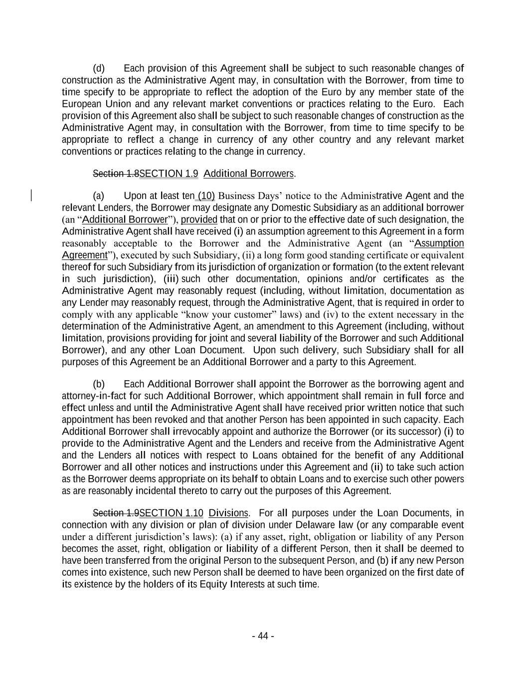- 44 - (d) Each provision of this Agreement shall be subject to such reasonable changes of construction as the Administrative Agent may, in consultation with the Borrower, from time to time specify to be appropriate to reflect the adoption of the Euro by any member state of the European Union and any relevant market conventions or practices relating to the Euro. Each provision of this Agreement also shall be subject to such reasonable changes of construction as the Administrative Agent may, in consultation with the Borrower, from time to time specify to be appropriate to reflect a change in currency of any other country and any relevant market conventions or practices relating to the change in currency. Section 1.8SECTION 1.9 Additional Borrowers. (a) Upon at least ten (10) Business Days’ notice to the Administrative Agent and the relevant Lenders, the Borrower may designate any Domestic Subsidiary as an additional borrower (an “Additional Borrower”), provided that on or prior to the effective date of such designation, the Administrative Agent shall have received (i) an assumption agreement to this Agreement in a form reasonably acceptable to the Borrower and the Administrative Agent (an “Assumption Agreement”), executed by such Subsidiary, (ii) a long form good standing certificate or equivalent thereof for such Subsidiary from its jurisdiction of organization or formation (to the extent relevant in such jurisdiction), (iii) such other documentation, opinions and/or certificates as the Administrative Agent may reasonably request (including, without limitation, documentation as any Lender may reasonably request, through the Administrative Agent, that is required in order to comply with any applicable “know your customer” laws) and (iv) to the extent necessary in the determination of the Administrative Agent, an amendment to this Agreement (including, without limitation, provisions providing for joint and several liability of the Borrower and such Additional Borrower), and any other Loan Document. Upon such delivery, such Subsidiary shall for all purposes of this Agreement be an Additional Borrower and a party to this Agreement. (b) Each Additional Borrower shall appoint the Borrower as the borrowing agent and attorney-in-fact for such Additional Borrower, which appointment shall remain in full force and effect unless and until the Administrative Agent shall have received prior written notice that such appointment has been revoked and that another Person has been appointed in such capacity. Each Additional Borrower shall irrevocably appoint and authorize the Borrower (or its successor) (i) to provide to the Administrative Agent and the Lenders and receive from the Administrative Agent and the Lenders all notices with respect to Loans obtained for the benefit of any Additional Borrower and all other notices and instructions under this Agreement and (ii) to take such action as the Borrower deems appropriate on its behalf to obtain Loans and to exercise such other powers as are reasonably incidental thereto to carry out the purposes of this Agreement. Section 1.9SECTION 1.10 Divisions. For all purposes under the Loan Documents, in connection with any division or plan of division under Delaware law (or any comparable event under a different jurisdiction’s laws): (a) if any asset, right, obligation or liability of any Person becomes the asset, right, obligation or liability of a different Person, then it shall be deemed to have been transferred from the original Person to the subsequent Person, and (b) if any new Person comes into existence, such new Person shall be deemed to have been organized on the first date of its existence by the holders of its Equity Interests at such time.