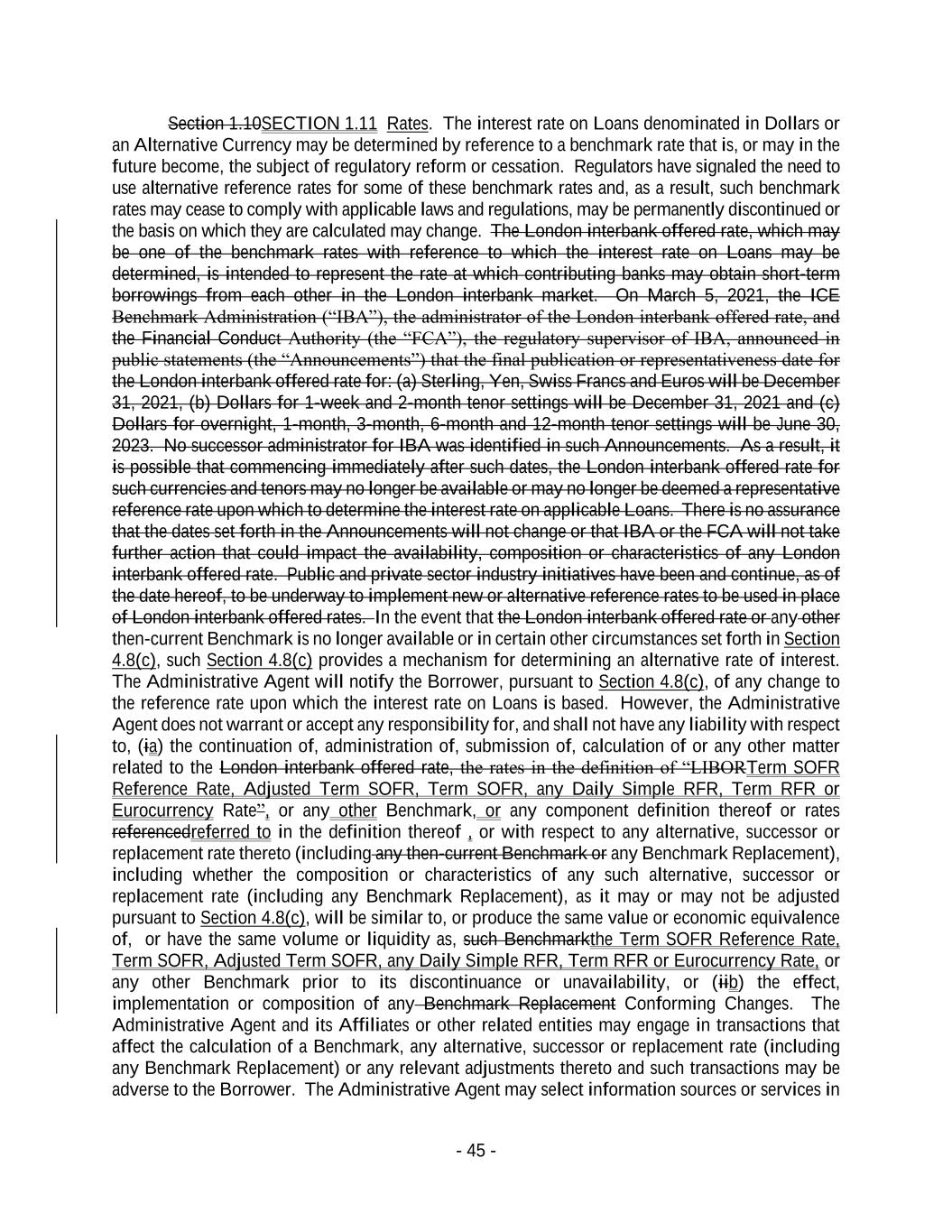 - 45 - Section 1.10SECTION 1.11 Rates. The interest rate on Loans denominated in Dollars or an Alternative Currency may be determined by reference to a benchmark rate that is, or may in the future become, the subject of regulatory reform or cessation. Regulators have signaled the need to use alternative reference rates for some of these benchmark rates and, as a result, such benchmark rates may cease to comply with applicable laws and regulations, may be permanently discontinued or the basis on which they are calculated may change. The London interbank offered rate, which may be one of the benchmark rates with reference to which the interest rate on Loans may be determined, is intended to represent the rate at which contributing banks may obtain short-term borrowings from each other in the London interbank market. On March 5, 2021, the ICE Benchmark Administration (“IBA”), the administrator of the London interbank offered rate, and the Financial Conduct Authority (the “FCA”), the regulatory supervisor of IBA, announced in public statements (the “Announcements”) that the final publication or representativeness date for the London interbank offered rate for: (a) Sterling, Yen, Swiss Francs and Euros will be December 31, 2021, (b) Dollars for 1-week and 2-month tenor settings will be December 31, 2021 and (c) Dollars for overnight, 1-month, 3-month, 6-month and 12-month tenor settings will be June 30, 2023. No successor administrator for IBA was identified in such Announcements. As a result, it is possible that commencing immediately after such dates, the London interbank offered rate for such currencies and tenors may no longer be available or may no longer be deemed a representative reference rate upon which to determine the interest rate on applicable Loans. There is no assurance that the dates set forth in the Announcements will not change or that IBA or the FCA will not take further action that could impact the availability, composition or characteristics of any London interbank offered rate. Public and private sector industry initiatives have been and continue, as of the date hereof, to be underway to implement new or alternative reference rates to be used in place of London interbank offered rates. In the event that the London interbank offered rate or any other then-current Benchmark is no longer available or in certain other circumstances set forth in Section 4.8(c), such Section 4.8(c) provides a mechanism for determining an alternative rate of interest. The Administrative Agent will notify the Borrower, pursuant to Section 4.8(c), of any change to the reference rate upon which the interest rate on Loans is based. However, the Administrative Agent does not warrant or accept any responsibility for, and shall not have any liability with respect to, (ia) the continuation of, administration of, submission of, calculation of or any other matter related to the London interbank offered rate, the rates in the definition of “LIBORTerm SOFR Reference Rate, Adjusted Term SOFR, Term SOFR, any Daily Simple RFR, Term RFR or Eurocurrency Rate”, or any other Benchmark, or any component definition thereof or rates referencedreferred to in the definition thereof , or with respect to any alternative, successor or replacement rate thereto (including any then-current Benchmark or any Benchmark Replacement), including whether the composition or characteristics of any such alternative, successor or replacement rate (including any Benchmark Replacement), as it may or may not be adjusted pursuant to Section 4.8(c), will be similar to, or produce the same value or economic equivalence of, or have the same volume or liquidity as, such Benchmarkthe Term SOFR Reference Rate, Term SOFR, Adjusted Term SOFR, any Daily Simple RFR, Term RFR or Eurocurrency Rate, or any other Benchmark prior to its discontinuance or unavailability, or (iib) the effect, implementation or composition of any Benchmark Replacement Conforming Changes. The Administrative Agent and its Affiliates or other related entities may engage in transactions that affect the calculation of a Benchmark, any alternative, successor or replacement rate (including any Benchmark Replacement) or any relevant adjustments thereto and such transactions may be adverse to the Borrower. The Administrative Agent may select information sources or services in