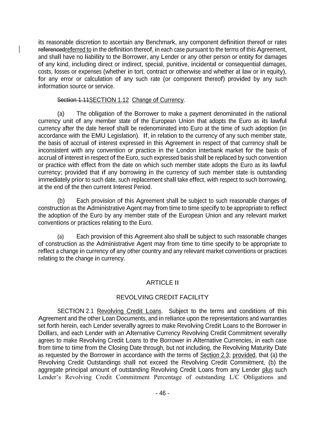 - 46 - its reasonable discretion to ascertain any Benchmark, any component definition thereof or rates referencedreferred to in the definition thereof, in each case pursuant to the terms of this Agreement, and shall have no liability to the Borrower, any Lender or any other person or entity for damages of any kind, including direct or indirect, special, punitive, incidental or consequential damages, costs, losses or expenses (whether in tort, contract or otherwise and whether at law or in equity), for any error or calculation of any such rate (or component thereof) provided by any such information source or service. Section 1.11SECTION 1.12 Change of Currency. (a) The obligation of the Borrower to make a payment denominated in the national currency unit of any member state of the European Union that adopts the Euro as its lawful currency after the date hereof shall be redenominated into Euro at the time of such adoption (in accordance with the EMU Legislation). If, in relation to the currency of any such member state, the basis of accrual of interest expressed in this Agreement in respect of that currency shall be inconsistent with any convention or practice in the London interbank market for the basis of accrual of interest in respect of the Euro, such expressed basis shall be replaced by such convention or practice with effect from the date on which such member state adopts the Euro as its lawful currency; provided that if any borrowing in the currency of such member state is outstanding immediately prior to such date, such replacement shall take effect, with respect to such borrowing, at the end of the then current Interest Period. (b) Each provision of this Agreement shall be subject to such reasonable changes of construction as the Administrative Agent may from time to time specify to be appropriate to reflect the adoption of the Euro by any member state of the European Union and any relevant market conventions or practices relating to the Euro. (a) Each provision of this Agreement also shall be subject to such reasonable changes of construction as the Administrative Agent may from time to time specify to be appropriate to reflect a change in currency of any other country and any relevant market conventions or practices relating to the change in currency. ARTICLE II REVOLVING CREDIT FACILITY SECTION 2.1 Revolving Credit Loans. Subject to the terms and conditions of this Agreement and the other Loan Documents, and in reliance upon the representations and warranties set forth herein, each Lender severally agrees to make Revolving Credit Loans to the Borrower in Dollars, and each Lender with an Alternative Currency Revolving Credit Commitment severally agrees to make Revolving Credit Loans to the Borrower in Alternative Currencies, in each case from time to time from the Closing Date through, but not including, the Revolving Maturity Date as requested by the Borrower in accordance with the terms of Section 2.3; provided, that (a) the Revolving Credit Outstandings shall not exceed the Revolving Credit Commitment, (b) the aggregate principal amount of outstanding Revolving Credit Loans from any Lender plus such Lender’s Revolving Credit Commitment Percentage of outstanding L/C Obligations and