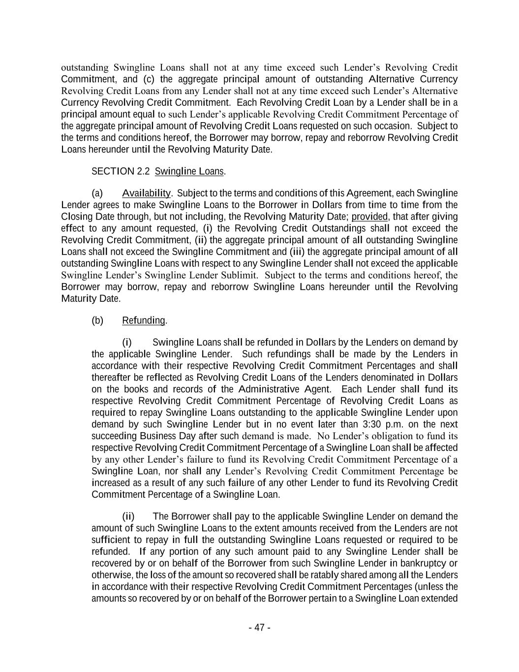 - 47 - outstanding Swingline Loans shall not at any time exceed such Lender’s Revolving Credit Commitment, and (c) the aggregate principal amount of outstanding Alternative Currency Revolving Credit Loans from any Lender shall not at any time exceed such Lender’s Alternative Currency Revolving Credit Commitment. Each Revolving Credit Loan by a Lender shall be in a principal amount equal to such Lender’s applicable Revolving Credit Commitment Percentage of the aggregate principal amount of Revolving Credit Loans requested on such occasion. Subject to the terms and conditions hereof, the Borrower may borrow, repay and reborrow Revolving Credit Loans hereunder until the Revolving Maturity Date. SECTION 2.2 Swingline Loans. (a) Availability. Subject to the terms and conditions of this Agreement, each Swingline Lender agrees to make Swingline Loans to the Borrower in Dollars from time to time from the Closing Date through, but not including, the Revolving Maturity Date; provided, that after giving effect to any amount requested, (i) the Revolving Credit Outstandings shall not exceed the Revolving Credit Commitment, (ii) the aggregate principal amount of all outstanding Swingline Loans shall not exceed the Swingline Commitment and (iii) the aggregate principal amount of all outstanding Swingline Loans with respect to any Swingline Lender shall not exceed the applicable Swingline Lender’s Swingline Lender Sublimit. Subject to the terms and conditions hereof, the Borrower may borrow, repay and reborrow Swingline Loans hereunder until the Revolving Maturity Date. (b) Refunding. (i) Swingline Loans shall be refunded in Dollars by the Lenders on demand by the applicable Swingline Lender. Such refundings shall be made by the Lenders in accordance with their respective Revolving Credit Commitment Percentages and shall thereafter be reflected as Revolving Credit Loans of the Lenders denominated in Dollars on the books and records of the Administrative Agent. Each Lender shall fund its respective Revolving Credit Commitment Percentage of Revolving Credit Loans as required to repay Swingline Loans outstanding to the applicable Swingline Lender upon demand by such Swingline Lender but in no event later than 3:30 p.m. on the next succeeding Business Day after such demand is made. No Lender’s obligation to fund its respective Revolving Credit Commitment Percentage of a Swingline Loan shall be affected by any other Lender’s failure to fund its Revolving Credit Commitment Percentage of a Swingline Loan, nor shall any Lender’s Revolving Credit Commitment Percentage be increased as a result of any such failure of any other Lender to fund its Revolving Credit Commitment Percentage of a Swingline Loan. (ii) The Borrower shall pay to the applicable Swingline Lender on demand the amount of such Swingline Loans to the extent amounts received from the Lenders are not sufficient to repay in full the outstanding Swingline Loans requested or required to be refunded. If any portion of any such amount paid to any Swingline Lender shall be recovered by or on behalf of the Borrower from such Swingline Lender in bankruptcy or otherwise, the loss of the amount so recovered shall be ratably shared among all the Lenders in accordance with their respective Revolving Credit Commitment Percentages (unless the amounts so recovered by or on behalf of the Borrower pertain to a Swingline Loan extended