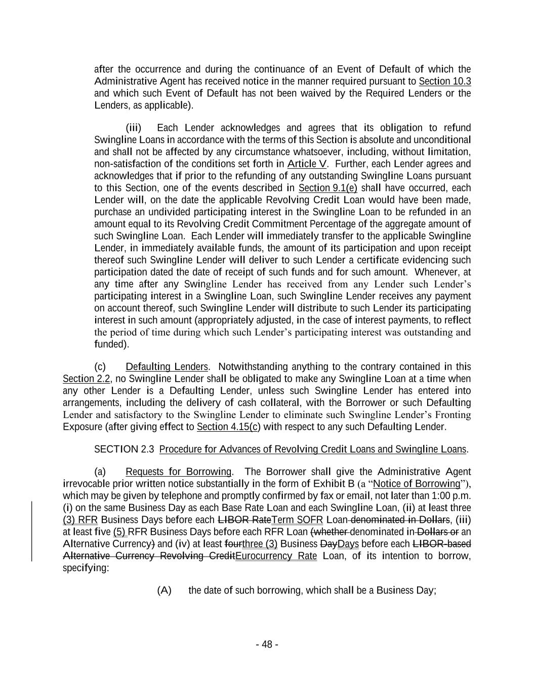 - 48 - after the occurrence and during the continuance of an Event of Default of which the Administrative Agent has received notice in the manner required pursuant to Section 10.3 and which such Event of Default has not been waived by the Required Lenders or the Lenders, as applicable). (iii) Each Lender acknowledges and agrees that its obligation to refund Swingline Loans in accordance with the terms of this Section is absolute and unconditional and shall not be affected by any circumstance whatsoever, including, without limitation, non-satisfaction of the conditions set forth in Article V. Further, each Lender agrees and acknowledges that if prior to the refunding of any outstanding Swingline Loans pursuant to this Section, one of the events described in Section 9.1(e) shall have occurred, each Lender will, on the date the applicable Revolving Credit Loan would have been made, purchase an undivided participating interest in the Swingline Loan to be refunded in an amount equal to its Revolving Credit Commitment Percentage of the aggregate amount of such Swingline Loan. Each Lender will immediately transfer to the applicable Swingline Lender, in immediately available funds, the amount of its participation and upon receipt thereof such Swingline Lender will deliver to such Lender a certificate evidencing such participation dated the date of receipt of such funds and for such amount. Whenever, at any time after any Swingline Lender has received from any Lender such Lender’s participating interest in a Swingline Loan, such Swingline Lender receives any payment on account thereof, such Swingline Lender will distribute to such Lender its participating interest in such amount (appropriately adjusted, in the case of interest payments, to reflect the period of time during which such Lender’s participating interest was outstanding and funded). (c) Defaulting Lenders. Notwithstanding anything to the contrary contained in this Section 2.2, no Swingline Lender shall be obligated to make any Swingline Loan at a time when any other Lender is a Defaulting Lender, unless such Swingline Lender has entered into arrangements, including the delivery of cash collateral, with the Borrower or such Defaulting Lender and satisfactory to the Swingline Lender to eliminate such Swingline Lender’s Fronting Exposure (after giving effect to Section 4.15(c) with respect to any such Defaulting Lender. SECTION 2.3 Procedure for Advances of Revolving Credit Loans and Swingline Loans. (a) Requests for Borrowing. The Borrower shall give the Administrative Agent irrevocable prior written notice substantially in the form of Exhibit B (a “Notice of Borrowing”), which may be given by telephone and promptly confirmed by fax or email, not later than 1:00 p.m. (i) on the same Business Day as each Base Rate Loan and each Swingline Loan, (ii) at least three (3) RFR Business Days before each LIBOR RateTerm SOFR Loan denominated in Dollars, (iii) at least five (5) RFR Business Days before each RFR Loan (whether denominated in Dollars or an Alternative Currency) and (iv) at least fourthree (3) Business DayDays before each LIBOR-based Alternative Currency Revolving CreditEurocurrency Rate Loan, of its intention to borrow, specifying: (A) the date of such borrowing, which shall be a Business Day;