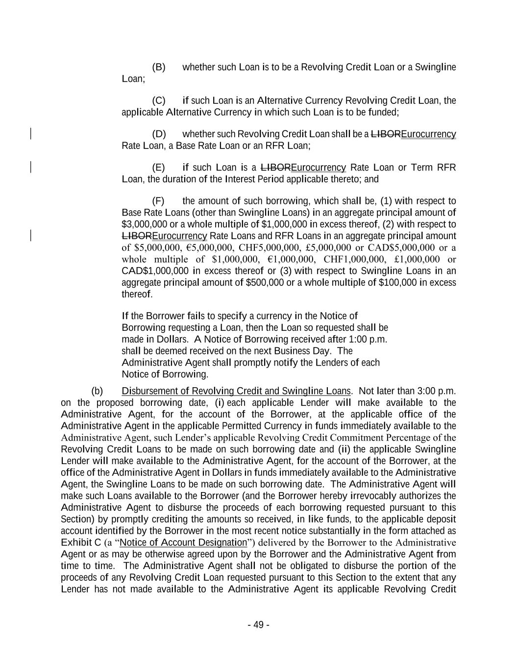 - 49 - (B) whether such Loan is to be a Revolving Credit Loan or a Swingline Loan; (C) if such Loan is an Alternative Currency Revolving Credit Loan, the applicable Alternative Currency in which such Loan is to be funded; (D) whether such Revolving Credit Loan shall be a LIBOREurocurrency Rate Loan, a Base Rate Loan or an RFR Loan; (E) if such Loan is a LIBOREurocurrency Rate Loan or Term RFR Loan, the duration of the Interest Period applicable thereto; and (F) the amount of such borrowing, which shall be, (1) with respect to Base Rate Loans (other than Swingline Loans) in an aggregate principal amount of $3,000,000 or a whole multiple of $1,000,000 in excess thereof, (2) with respect to LIBOREurocurrency Rate Loans and RFR Loans in an aggregate principal amount of $5,000,000, €5,000,000, CHF5,000,000, £5,000,000 or CAD$5,000,000 or a whole multiple of $1,000,000, €1,000,000, CHF1,000,000, £1,000,000 or CAD$1,000,000 in excess thereof or (3) with respect to Swingline Loans in an aggregate principal amount of $500,000 or a whole multiple of $100,000 in excess thereof. If the Borrower fails to specify a currency in the Notice of Borrowing requesting a Loan, then the Loan so requested shall be made in Dollars. A Notice of Borrowing received after 1:00 p.m. shall be deemed received on the next Business Day. The Administrative Agent shall promptly notify the Lenders of each Notice of Borrowing. (b) Disbursement of Revolving Credit and Swingline Loans. Not later than 3:00 p.m. on the proposed borrowing date, (i) each applicable Lender will make available to the Administrative Agent, for the account of the Borrower, at the applicable office of the Administrative Agent in the applicable Permitted Currency in funds immediately available to the Administrative Agent, such Lender’s applicable Revolving Credit Commitment Percentage of the Revolving Credit Loans to be made on such borrowing date and (ii) the applicable Swingline Lender will make available to the Administrative Agent, for the account of the Borrower, at the office of the Administrative Agent in Dollars in funds immediately available to the Administrative Agent, the Swingline Loans to be made on such borrowing date. The Administrative Agent will make such Loans available to the Borrower (and the Borrower hereby irrevocably authorizes the Administrative Agent to disburse the proceeds of each borrowing requested pursuant to this Section) by promptly crediting the amounts so received, in like funds, to the applicable deposit account identified by the Borrower in the most recent notice substantially in the form attached as Exhibit C (a “Notice of Account Designation”) delivered by the Borrower to the Administrative Agent or as may be otherwise agreed upon by the Borrower and the Administrative Agent from time to time. The Administrative Agent shall not be obligated to disburse the portion of the proceeds of any Revolving Credit Loan requested pursuant to this Section to the extent that any Lender has not made available to the Administrative Agent its applicable Revolving Credit