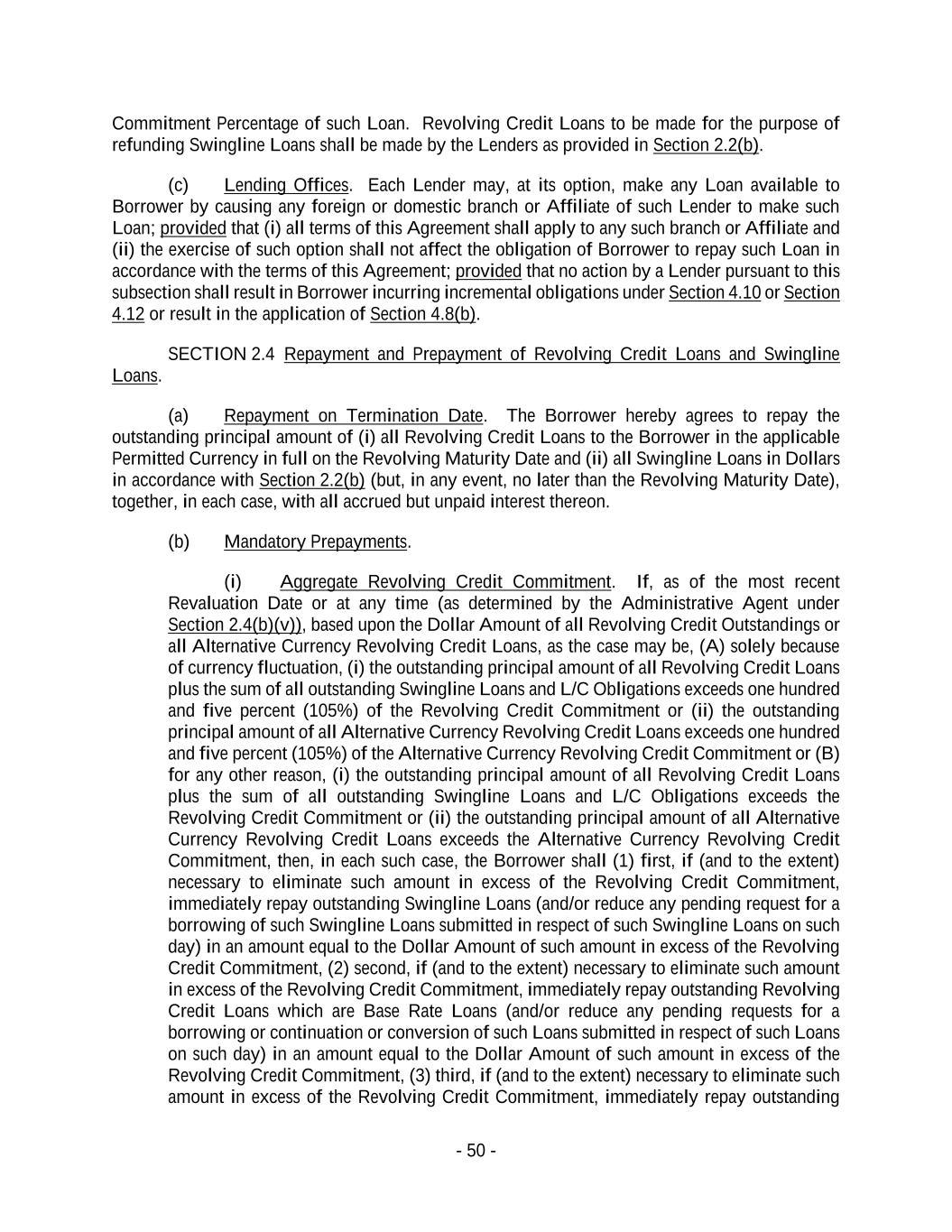 - 50 - Commitment Percentage of such Loan. Revolving Credit Loans to be made for the purpose of refunding Swingline Loans shall be made by the Lenders as provided in Section 2.2(b). (c) Lending Offices. Each Lender may, at its option, make any Loan available to Borrower by causing any foreign or domestic branch or Affiliate of such Lender to make such Loan; provided that (i) all terms of this Agreement shall apply to any such branch or Affiliate and (ii) the exercise of such option shall not affect the obligation of Borrower to repay such Loan in accordance with the terms of this Agreement; provided that no action by a Lender pursuant to this subsection shall result in Borrower incurring incremental obligations under Section 4.10 or Section 4.12 or result in the application of Section 4.8(b). SECTION 2.4 Repayment and Prepayment of Revolving Credit Loans and Swingline Loans. (a) Repayment on Termination Date. The Borrower hereby agrees to repay the outstanding principal amount of (i) all Revolving Credit Loans to the Borrower in the applicable Permitted Currency in full on the Revolving Maturity Date and (ii) all Swingline Loans in Dollars in accordance with Section 2.2(b) (but, in any event, no later than the Revolving Maturity Date), together, in each case, with all accrued but unpaid interest thereon. (b) Mandatory Prepayments. (i) Aggregate Revolving Credit Commitment. If, as of the most recent Revaluation Date or at any time (as determined by the Administrative Agent under Section 2.4(b)(v)), based upon the Dollar Amount of all Revolving Credit Outstandings or all Alternative Currency Revolving Credit Loans, as the case may be, (A) solely because of currency fluctuation, (i) the outstanding principal amount of all Revolving Credit Loans plus the sum of all outstanding Swingline Loans and L/C Obligations exceeds one hundred and five percent (105%) of the Revolving Credit Commitment or (ii) the outstanding principal amount of all Alternative Currency Revolving Credit Loans exceeds one hundred and five percent (105%) of the Alternative Currency Revolving Credit Commitment or (B) for any other reason, (i) the outstanding principal amount of all Revolving Credit Loans plus the sum of all outstanding Swingline Loans and L/C Obligations exceeds the Revolving Credit Commitment or (ii) the outstanding principal amount of all Alternative Currency Revolving Credit Loans exceeds the Alternative Currency Revolving Credit Commitment, then, in each such case, the Borrower shall (1) first, if (and to the extent) necessary to eliminate such amount in excess of the Revolving Credit Commitment, immediately repay outstanding Swingline Loans (and/or reduce any pending request for a borrowing of such Swingline Loans submitted in respect of such Swingline Loans on such day) in an amount equal to the Dollar Amount of such amount in excess of the Revolving Credit Commitment, (2) second, if (and to the extent) necessary to eliminate such amount in excess of the Revolving Credit Commitment, immediately repay outstanding Revolving Credit Loans which are Base Rate Loans (and/or reduce any pending requests for a borrowing or continuation or conversion of such Loans submitted in respect of such Loans on such day) in an amount equal to the Dollar Amount of such amount in excess of the Revolving Credit Commitment, (3) third, if (and to the extent) necessary to eliminate such amount in excess of the Revolving Credit Commitment, immediately repay outstanding