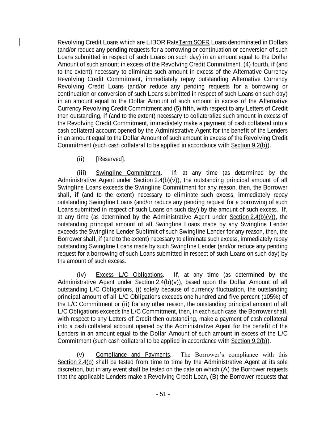 - 51 - Revolving Credit Loans which are LIBOR RateTerm SOFR Loans denominated in Dollars (and/or reduce any pending requests for a borrowing or continuation or conversion of such Loans submitted in respect of such Loans on such day) in an amount equal to the Dollar Amount of such amount in excess of the Revolving Credit Commitment, (4) fourth, if (and to the extent) necessary to eliminate such amount in excess of the Alternative Currency Revolving Credit Commitment, immediately repay outstanding Alternative Currency Revolving Credit Loans (and/or reduce any pending requests for a borrowing or continuation or conversion of such Loans submitted in respect of such Loans on such day) in an amount equal to the Dollar Amount of such amount in excess of the Alternative Currency Revolving Credit Commitment and (5) fifth, with respect to any Letters of Credit then outstanding, if (and to the extent) necessary to collateralize such amount in excess of the Revolving Credit Commitment, immediately make a payment of cash collateral into a cash collateral account opened by the Administrative Agent for the benefit of the Lenders in an amount equal to the Dollar Amount of such amount in excess of the Revolving Credit Commitment (such cash collateral to be applied in accordance with Section 9.2(b)). (ii) [Reserved]. (iii) Swingline Commitment. If, at any time (as determined by the Administrative Agent under Section 2.4(b)(v)), the outstanding principal amount of all Swingline Loans exceeds the Swingline Commitment for any reason, then, the Borrower shall, if (and to the extent) necessary to eliminate such excess, immediately repay outstanding Swingline Loans (and/or reduce any pending request for a borrowing of such Loans submitted in respect of such Loans on such day) by the amount of such excess. If, at any time (as determined by the Administrative Agent under Section 2.4(b)(v)), the outstanding principal amount of all Swingline Loans made by any Swingline Lender exceeds the Swingline Lender Sublimit of such Swingline Lender for any reason, then, the Borrower shall, if (and to the extent) necessary to eliminate such excess, immediately repay outstanding Swingline Loans made by such Swingline Lender (and/or reduce any pending request for a borrowing of such Loans submitted in respect of such Loans on such day) by the amount of such excess. (iv) Excess L/C Obligations. If, at any time (as determined by the Administrative Agent under Section 2.4(b)(v)), based upon the Dollar Amount of all outstanding L/C Obligations, (i) solely because of currency fluctuation, the outstanding principal amount of all L/C Obligations exceeds one hundred and five percent (105%) of the L/C Commitment or (ii) for any other reason, the outstanding principal amount of all L/C Obligations exceeds the L/C Commitment, then, in each such case, the Borrower shall, with respect to any Letters of Credit then outstanding, make a payment of cash collateral into a cash collateral account opened by the Administrative Agent for the benefit of the Lenders in an amount equal to the Dollar Amount of such amount in excess of the L/C Commitment (such cash collateral to be applied in accordance with Section 9.2(b)). (v) Compliance and Payments. The Borrower’s compliance with this Section 2.4(b) shall be tested from time to time by the Administrative Agent at its sole discretion, but in any event shall be tested on the date on which (A) the Borrower requests that the applicable Lenders make a Revolving Credit Loan, (B) the Borrower requests that