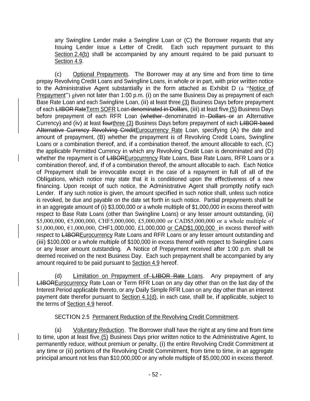 - 52 - any Swingline Lender make a Swingline Loan or (C) the Borrower requests that any Issuing Lender issue a Letter of Credit. Each such repayment pursuant to this Section 2.4(b) shall be accompanied by any amount required to be paid pursuant to Section 4.9. (c) Optional Prepayments. The Borrower may at any time and from time to time prepay Revolving Credit Loans and Swingline Loans, in whole or in part, with prior written notice to the Administrative Agent substantially in the form attached as Exhibit D (a “Notice of Prepayment”) given not later than 1:00 p.m. (i) on the same Business Day as prepayment of each Base Rate Loan and each Swingline Loan, (ii) at least three (3) Business Days before prepayment of each LIBOR RateTerm SOFR Loan denominated in Dollars, (iii) at least five (5) Business Days before prepayment of each RFR Loan (whether denominated in Dollars or an Alternative Currency) and (iv) at least fourthree (3) Business Days before prepayment of each LIBOR-based Alternative Currency Revolving CreditEurocurrency Rate Loan, specifying (A) the date and amount of prepayment, (B) whether the prepayment is of Revolving Credit Loans, Swingline Loans or a combination thereof, and, if a combination thereof, the amount allocable to each, (C) the applicable Permitted Currency in which any Revolving Credit Loan is denominated and (D) whether the repayment is of LIBOREurocurrency Rate Loans, Base Rate Loans, RFR Loans or a combination thereof, and, if of a combination thereof, the amount allocable to each. Each Notice of Prepayment shall be irrevocable except in the case of a repayment in full of all of the Obligations, which notice may state that it is conditioned upon the effectiveness of a new financing. Upon receipt of such notice, the Administrative Agent shall promptly notify each Lender. If any such notice is given, the amount specified in such notice shall, unless such notice is revoked, be due and payable on the date set forth in such notice. Partial prepayments shall be in an aggregate amount of (i) $3,000,000 or a whole multiple of $1,000,000 in excess thereof with respect to Base Rate Loans (other than Swingline Loans) or any lesser amount outstanding, (ii) $5,000,000, €5,000,000, CHF5,000,000, £5,000,000 or CAD$5,000,000 or a whole multiple of $1,000,000, €1,000,000, CHF1,000,000, £1,000,000 or CAD$1,000,000 in excess thereof with respect to LIBOREurocurrency Rate Loans and RFR Loans or any lesser amount outstanding and (iii) $100,000 or a whole multiple of $100,000 in excess thereof with respect to Swingline Loans or any lesser amount outstanding. A Notice of Prepayment received after 1:00 p.m. shall be deemed received on the next Business Day. Each such prepayment shall be accompanied by any amount required to be paid pursuant to Section 4.9 hereof. (d) Limitation on Prepayment of LIBOR Rate Loans. Any prepayment of any LIBOREurocurrency Rate Loan or Term RFR Loan on any day other than on the last day of the Interest Period applicable thereto, or any Daily Simple RFR Loan on any day other than an interest payment date therefor pursuant to Section 4.1(d), in each case, shall be, if applicable, subject to the terms of Section 4.9 hereof. SECTION 2.5 Permanent Reduction of the Revolving Credit Commitment. (a) Voluntary Reduction. The Borrower shall have the right at any time and from time to time, upon at least five (5) Business Days prior written notice to the Administrative Agent, to permanently reduce, without premium or penalty, (i) the entire Revolving Credit Commitment at any time or (ii) portions of the Revolving Credit Commitment, from time to time, in an aggregate principal amount not less than $10,000,000 or any whole multiple of $5,000,000 in excess thereof.