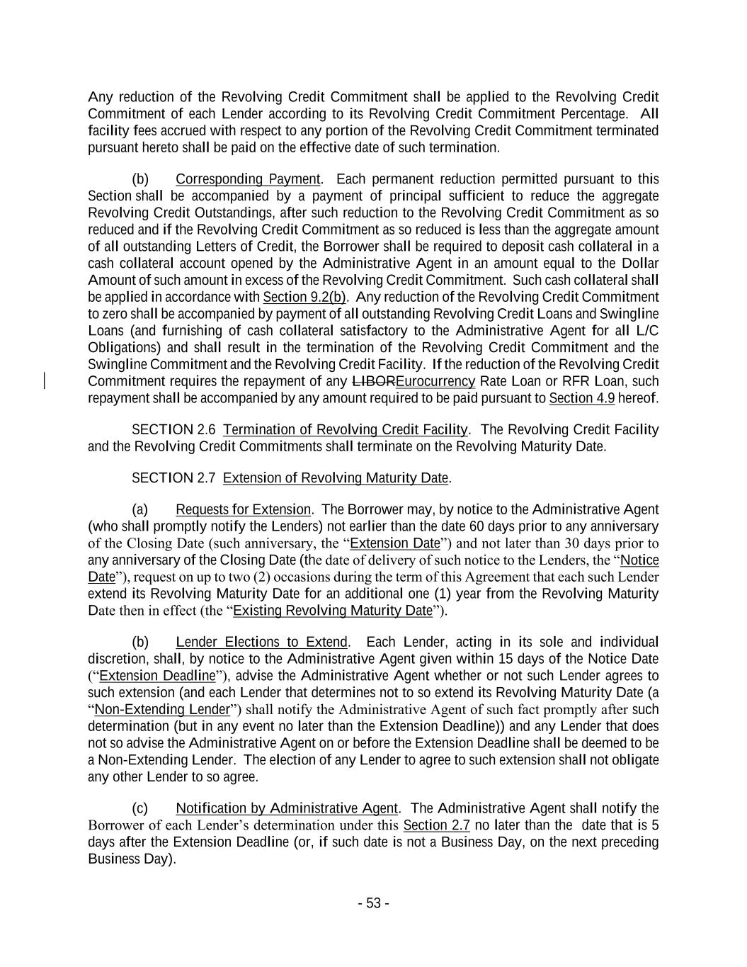 - 53 - Any reduction of the Revolving Credit Commitment shall be applied to the Revolving Credit Commitment of each Lender according to its Revolving Credit Commitment Percentage. All facility fees accrued with respect to any portion of the Revolving Credit Commitment terminated pursuant hereto shall be paid on the effective date of such termination. (b) Corresponding Payment. Each permanent reduction permitted pursuant to this Section shall be accompanied by a payment of principal sufficient to reduce the aggregate Revolving Credit Outstandings, after such reduction to the Revolving Credit Commitment as so reduced and if the Revolving Credit Commitment as so reduced is less than the aggregate amount of all outstanding Letters of Credit, the Borrower shall be required to deposit cash collateral in a cash collateral account opened by the Administrative Agent in an amount equal to the Dollar Amount of such amount in excess of the Revolving Credit Commitment. Such cash collateral shall be applied in accordance with Section 9.2(b). Any reduction of the Revolving Credit Commitment to zero shall be accompanied by payment of all outstanding Revolving Credit Loans and Swingline Loans (and furnishing of cash collateral satisfactory to the Administrative Agent for all L/C Obligations) and shall result in the termination of the Revolving Credit Commitment and the Swingline Commitment and the Revolving Credit Facility. If the reduction of the Revolving Credit Commitment requires the repayment of any LIBOREurocurrency Rate Loan or RFR Loan, such repayment shall be accompanied by any amount required to be paid pursuant to Section 4.9 hereof. SECTION 2.6 Termination of Revolving Credit Facility. The Revolving Credit Facility and the Revolving Credit Commitments shall terminate on the Revolving Maturity Date. SECTION 2.7 Extension of Revolving Maturity Date. (a) Requests for Extension. The Borrower may, by notice to the Administrative Agent (who shall promptly notify the Lenders) not earlier than the date 60 days prior to any anniversary of the Closing Date (such anniversary, the “Extension Date”) and not later than 30 days prior to any anniversary of the Closing Date (the date of delivery of such notice to the Lenders, the “Notice Date”), request on up to two (2) occasions during the term of this Agreement that each such Lender extend its Revolving Maturity Date for an additional one (1) year from the Revolving Maturity Date then in effect (the “Existing Revolving Maturity Date”). (b) Lender Elections to Extend. Each Lender, acting in its sole and individual discretion, shall, by notice to the Administrative Agent given within 15 days of the Notice Date (“Extension Deadline”), advise the Administrative Agent whether or not such Lender agrees to such extension (and each Lender that determines not to so extend its Revolving Maturity Date (a “Non-Extending Lender”) shall notify the Administrative Agent of such fact promptly after such determination (but in any event no later than the Extension Deadline)) and any Lender that does not so advise the Administrative Agent on or before the Extension Deadline shall be deemed to be a Non-Extending Lender. The election of any Lender to agree to such extension shall not obligate any other Lender to so agree. (c) Notification by Administrative Agent. The Administrative Agent shall notify the Borrower of each Lender’s determination under this Section 2.7 no later than the date that is 5 days after the Extension Deadline (or, if such date is not a Business Day, on the next preceding Business Day).