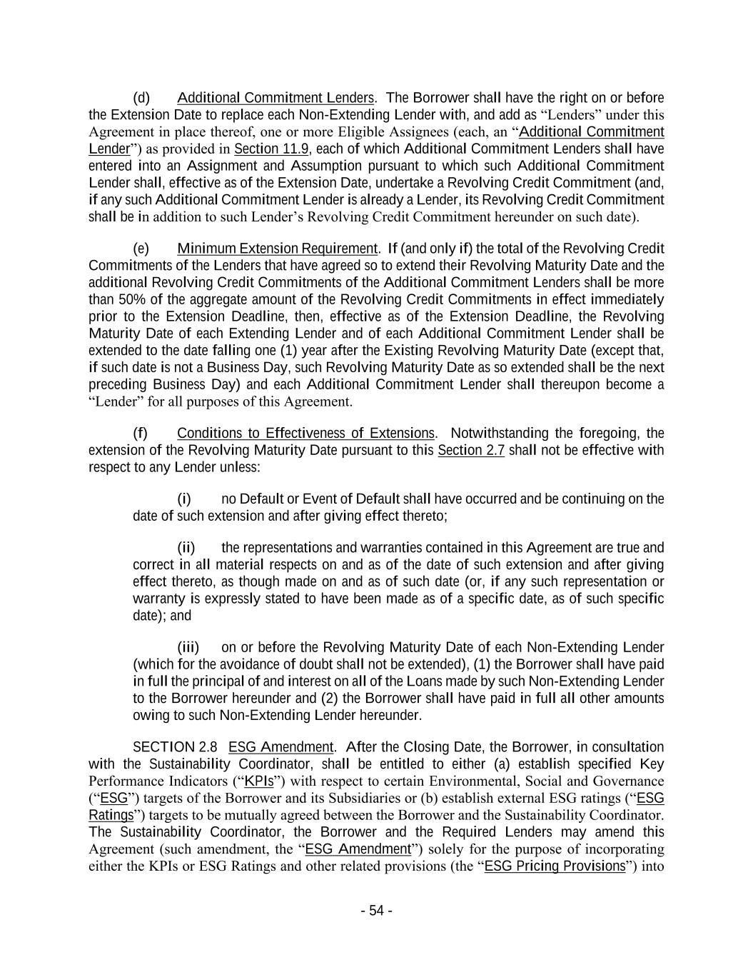 - 54 - (d) Additional Commitment Lenders. The Borrower shall have the right on or before the Extension Date to replace each Non-Extending Lender with, and add as “Lenders” under this Agreement in place thereof, one or more Eligible Assignees (each, an “Additional Commitment Lender”) as provided in Section 11.9, each of which Additional Commitment Lenders shall have entered into an Assignment and Assumption pursuant to which such Additional Commitment Lender shall, effective as of the Extension Date, undertake a Revolving Credit Commitment (and, if any such Additional Commitment Lender is already a Lender, its Revolving Credit Commitment shall be in addition to such Lender’s Revolving Credit Commitment hereunder on such date). (e) Minimum Extension Requirement. If (and only if) the total of the Revolving Credit Commitments of the Lenders that have agreed so to extend their Revolving Maturity Date and the additional Revolving Credit Commitments of the Additional Commitment Lenders shall be more than 50% of the aggregate amount of the Revolving Credit Commitments in effect immediately prior to the Extension Deadline, then, effective as of the Extension Deadline, the Revolving Maturity Date of each Extending Lender and of each Additional Commitment Lender shall be extended to the date falling one (1) year after the Existing Revolving Maturity Date (except that, if such date is not a Business Day, such Revolving Maturity Date as so extended shall be the next preceding Business Day) and each Additional Commitment Lender shall thereupon become a “Lender” for all purposes of this Agreement. (f) Conditions to Effectiveness of Extensions. Notwithstanding the foregoing, the extension of the Revolving Maturity Date pursuant to this Section 2.7 shall not be effective with respect to any Lender unless: (i) no Default or Event of Default shall have occurred and be continuing on the date of such extension and after giving effect thereto; (ii) the representations and warranties contained in this Agreement are true and correct in all material respects on and as of the date of such extension and after giving effect thereto, as though made on and as of such date (or, if any such representation or warranty is expressly stated to have been made as of a specific date, as of such specific date); and (iii) on or before the Revolving Maturity Date of each Non-Extending Lender (which for the avoidance of doubt shall not be extended), (1) the Borrower shall have paid in full the principal of and interest on all of the Loans made by such Non-Extending Lender to the Borrower hereunder and (2) the Borrower shall have paid in full all other amounts owing to such Non-Extending Lender hereunder. SECTION 2.8 ESG Amendment. After the Closing Date, the Borrower, in consultation with the Sustainability Coordinator, shall be entitled to either (a) establish specified Key Performance Indicators (“KPIs”) with respect to certain Environmental, Social and Governance (“ESG”) targets of the Borrower and its Subsidiaries or (b) establish external ESG ratings (“ESG Ratings”) targets to be mutually agreed between the Borrower and the Sustainability Coordinator. The Sustainability Coordinator, the Borrower and the Required Lenders may amend this Agreement (such amendment, the “ESG Amendment”) solely for the purpose of incorporating either the KPIs or ESG Ratings and other related provisions (the “ESG Pricing Provisions”) into