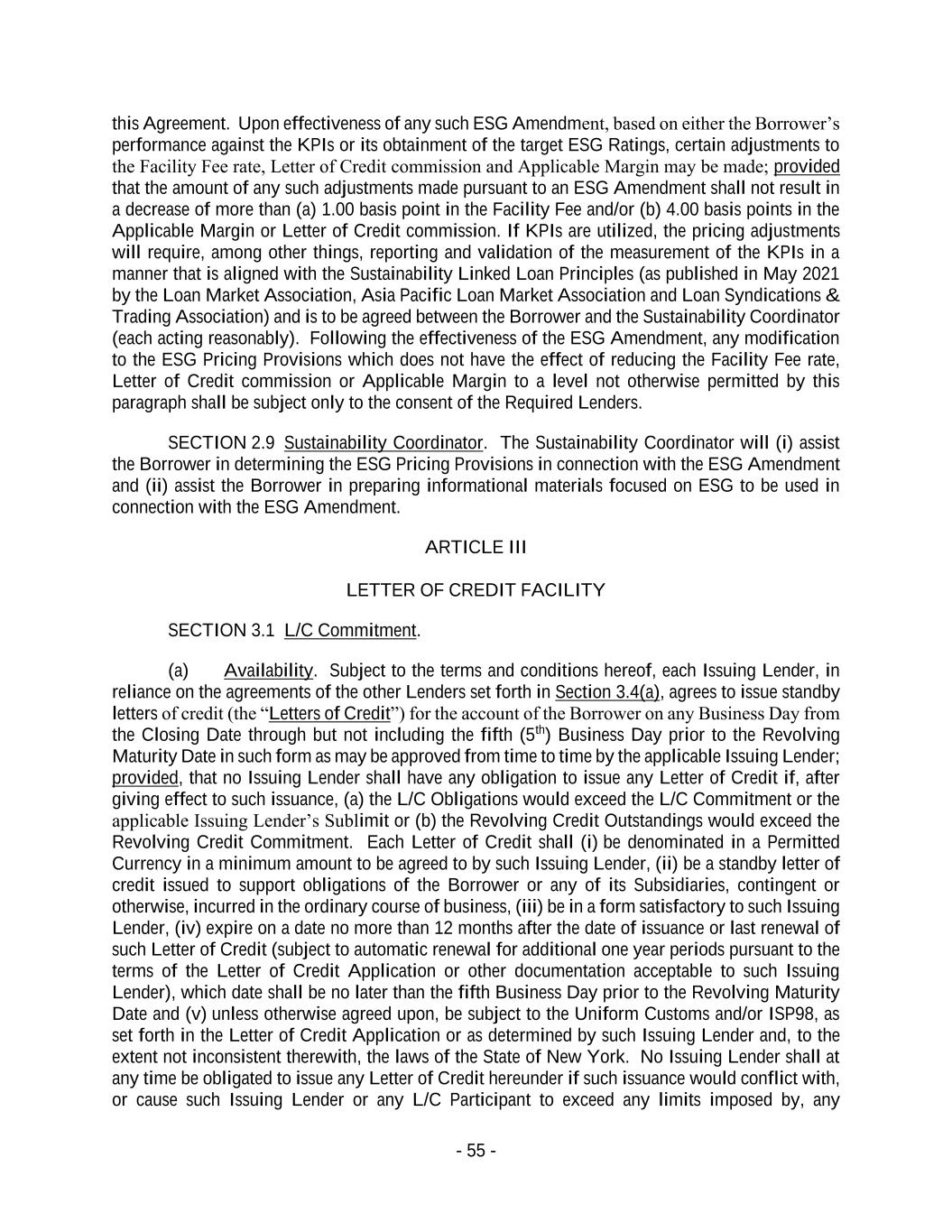 - 55 - this Agreement. Upon effectiveness of any such ESG Amendment, based on either the Borrower’s performance against the KPIs or its obtainment of the target ESG Ratings, certain adjustments to the Facility Fee rate, Letter of Credit commission and Applicable Margin may be made; provided that the amount of any such adjustments made pursuant to an ESG Amendment shall not result in a decrease of more than (a) 1.00 basis point in the Facility Fee and/or (b) 4.00 basis points in the Applicable Margin or Letter of Credit commission. If KPIs are utilized, the pricing adjustments will require, among other things, reporting and validation of the measurement of the KPIs in a manner that is aligned with the Sustainability Linked Loan Principles (as published in May 2021 by the Loan Market Association, Asia Pacific Loan Market Association and Loan Syndications & Trading Association) and is to be agreed between the Borrower and the Sustainability Coordinator (each acting reasonably). Following the effectiveness of the ESG Amendment, any modification to the ESG Pricing Provisions which does not have the effect of reducing the Facility Fee rate, Letter of Credit commission or Applicable Margin to a level not otherwise permitted by this paragraph shall be subject only to the consent of the Required Lenders. SECTION 2.9 Sustainability Coordinator. The Sustainability Coordinator will (i) assist the Borrower in determining the ESG Pricing Provisions in connection with the ESG Amendment and (ii) assist the Borrower in preparing informational materials focused on ESG to be used in connection with the ESG Amendment. ARTICLE III LETTER OF CREDIT FACILITY SECTION 3.1 L/C Commitment. (a) Availability. Subject to the terms and conditions hereof, each Issuing Lender, in reliance on the agreements of the other Lenders set forth in Section 3.4(a), agrees to issue standby letters of credit (the “Letters of Credit”) for the account of the Borrower on any Business Day from the Closing Date through but not including the fifth (5th) Business Day prior to the Revolving Maturity Date in such form as may be approved from time to time by the applicable Issuing Lender; provided, that no Issuing Lender shall have any obligation to issue any Letter of Credit if, after giving effect to such issuance, (a) the L/C Obligations would exceed the L/C Commitment or the applicable Issuing Lender’s Sublimit or (b) the Revolving Credit Outstandings would exceed the Revolving Credit Commitment. Each Letter of Credit shall (i) be denominated in a Permitted Currency in a minimum amount to be agreed to by such Issuing Lender, (ii) be a standby letter of credit issued to support obligations of the Borrower or any of its Subsidiaries, contingent or otherwise, incurred in the ordinary course of business, (iii) be in a form satisfactory to such Issuing Lender, (iv) expire on a date no more than 12 months after the date of issuance or last renewal of such Letter of Credit (subject to automatic renewal for additional one year periods pursuant to the terms of the Letter of Credit Application or other documentation acceptable to such Issuing Lender), which date shall be no later than the fifth Business Day prior to the Revolving Maturity Date and (v) unless otherwise agreed upon, be subject to the Uniform Customs and/or ISP98, as set forth in the Letter of Credit Application or as determined by such Issuing Lender and, to the extent not inconsistent therewith, the laws of the State of New York. No Issuing Lender shall at any time be obligated to issue any Letter of Credit hereunder if such issuance would conflict with, or cause such Issuing Lender or any L/C Participant to exceed any limits imposed by, any