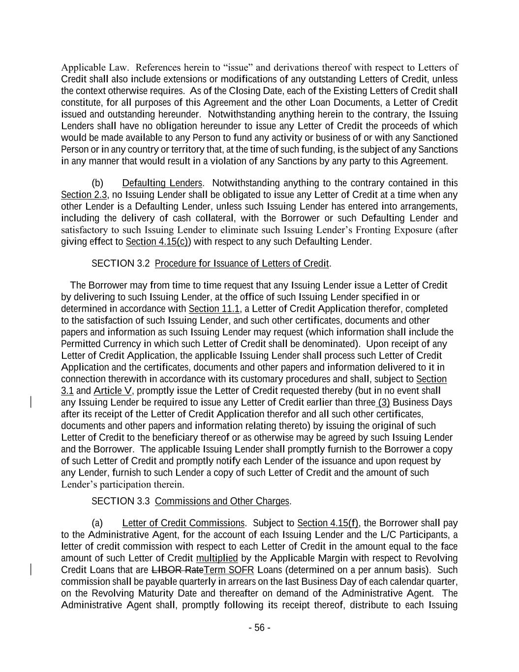 - 56 - Applicable Law. References herein to “issue” and derivations thereof with respect to Letters of Credit shall also include extensions or modifications of any outstanding Letters of Credit, unless the context otherwise requires. As of the Closing Date, each of the Existing Letters of Credit shall constitute, for all purposes of this Agreement and the other Loan Documents, a Letter of Credit issued and outstanding hereunder. Notwithstanding anything herein to the contrary, the Issuing Lenders shall have no obligation hereunder to issue any Letter of Credit the proceeds of which would be made available to any Person to fund any activity or business of or with any Sanctioned Person or in any country or territory that, at the time of such funding, is the subject of any Sanctions in any manner that would result in a violation of any Sanctions by any party to this Agreement. (b) Defaulting Lenders. Notwithstanding anything to the contrary contained in this Section 2.3, no Issuing Lender shall be obligated to issue any Letter of Credit at a time when any other Lender is a Defaulting Lender, unless such Issuing Lender has entered into arrangements, including the delivery of cash collateral, with the Borrower or such Defaulting Lender and satisfactory to such Issuing Lender to eliminate such Issuing Lender’s Fronting Exposure (after giving effect to Section 4.15(c)) with respect to any such Defaulting Lender. SECTION 3.2 Procedure for Issuance of Letters of Credit. The Borrower may from time to time request that any Issuing Lender issue a Letter of Credit by delivering to such Issuing Lender, at the office of such Issuing Lender specified in or determined in accordance with Section 11.1, a Letter of Credit Application therefor, completed to the satisfaction of such Issuing Lender, and such other certificates, documents and other papers and information as such Issuing Lender may request (which information shall include the Permitted Currency in which such Letter of Credit shall be denominated). Upon receipt of any Letter of Credit Application, the applicable Issuing Lender shall process such Letter of Credit Application and the certificates, documents and other papers and information delivered to it in connection therewith in accordance with its customary procedures and shall, subject to Section 3.1 and Article V, promptly issue the Letter of Credit requested thereby (but in no event shall any Issuing Lender be required to issue any Letter of Credit earlier than three (3) Business Days after its receipt of the Letter of Credit Application therefor and all such other certificates, documents and other papers and information relating thereto) by issuing the original of such Letter of Credit to the beneficiary thereof or as otherwise may be agreed by such Issuing Lender and the Borrower. The applicable Issuing Lender shall promptly furnish to the Borrower a copy of such Letter of Credit and promptly notify each Lender of the issuance and upon request by any Lender, furnish to such Lender a copy of such Letter of Credit and the amount of such Lender’s participation therein. SECTION 3.3 Commissions and Other Charges. (a) Letter of Credit Commissions. Subject to Section 4.15(f), the Borrower shall pay to the Administrative Agent, for the account of each Issuing Lender and the L/C Participants, a letter of credit commission with respect to each Letter of Credit in the amount equal to the face amount of such Letter of Credit multiplied by the Applicable Margin with respect to Revolving Credit Loans that are LIBOR RateTerm SOFR Loans (determined on a per annum basis). Such commission shall be payable quarterly in arrears on the last Business Day of each calendar quarter, on the Revolving Maturity Date and thereafter on demand of the Administrative Agent. The Administrative Agent shall, promptly following its receipt thereof, distribute to each Issuing