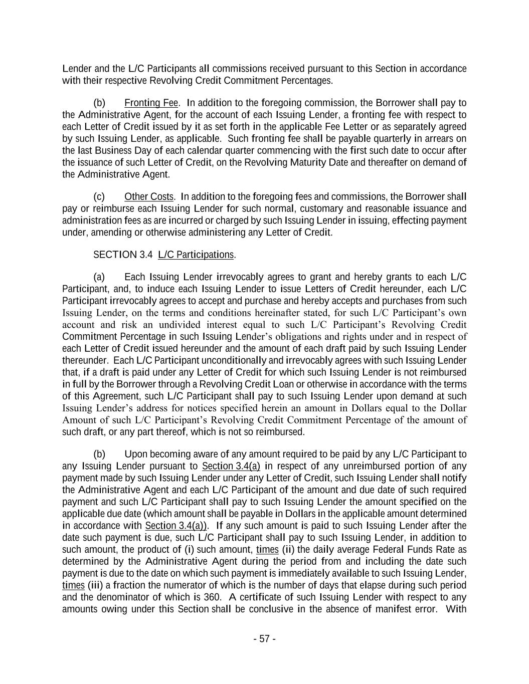 - 57 - Lender and the L/C Participants all commissions received pursuant to this Section in accordance with their respective Revolving Credit Commitment Percentages. (b) Fronting Fee. In addition to the foregoing commission, the Borrower shall pay to the Administrative Agent, for the account of each Issuing Lender, a fronting fee with respect to each Letter of Credit issued by it as set forth in the applicable Fee Letter or as separately agreed by such Issuing Lender, as applicable. Such fronting fee shall be payable quarterly in arrears on the last Business Day of each calendar quarter commencing with the first such date to occur after the issuance of such Letter of Credit, on the Revolving Maturity Date and thereafter on demand of the Administrative Agent. (c) Other Costs. In addition to the foregoing fees and commissions, the Borrower shall pay or reimburse each Issuing Lender for such normal, customary and reasonable issuance and administration fees as are incurred or charged by such Issuing Lender in issuing, effecting payment under, amending or otherwise administering any Letter of Credit. SECTION 3.4 L/C Participations. (a) Each Issuing Lender irrevocably agrees to grant and hereby grants to each L/C Participant, and, to induce each Issuing Lender to issue Letters of Credit hereunder, each L/C Participant irrevocably agrees to accept and purchase and hereby accepts and purchases from such Issuing Lender, on the terms and conditions hereinafter stated, for such L/C Participant’s own account and risk an undivided interest equal to such L/C Participant’s Revolving Credit Commitment Percentage in such Issuing Lender’s obligations and rights under and in respect of each Letter of Credit issued hereunder and the amount of each draft paid by such Issuing Lender thereunder. Each L/C Participant unconditionally and irrevocably agrees with such Issuing Lender that, if a draft is paid under any Letter of Credit for which such Issuing Lender is not reimbursed in full by the Borrower through a Revolving Credit Loan or otherwise in accordance with the terms of this Agreement, such L/C Participant shall pay to such Issuing Lender upon demand at such Issuing Lender’s address for notices specified herein an amount in Dollars equal to the Dollar Amount of such L/C Participant’s Revolving Credit Commitment Percentage of the amount of such draft, or any part thereof, which is not so reimbursed. (b) Upon becoming aware of any amount required to be paid by any L/C Participant to any Issuing Lender pursuant to Section 3.4(a) in respect of any unreimbursed portion of any payment made by such Issuing Lender under any Letter of Credit, such Issuing Lender shall notify the Administrative Agent and each L/C Participant of the amount and due date of such required payment and such L/C Participant shall pay to such Issuing Lender the amount specified on the applicable due date (which amount shall be payable in Dollars in the applicable amount determined in accordance with Section 3.4(a)). If any such amount is paid to such Issuing Lender after the date such payment is due, such L/C Participant shall pay to such Issuing Lender, in addition to such amount, the product of (i) such amount, times (ii) the daily average Federal Funds Rate as determined by the Administrative Agent during the period from and including the date such payment is due to the date on which such payment is immediately available to such Issuing Lender, times (iii) a fraction the numerator of which is the number of days that elapse during such period and the denominator of which is 360. A certificate of such Issuing Lender with respect to any amounts owing under this Section shall be conclusive in the absence of manifest error. With