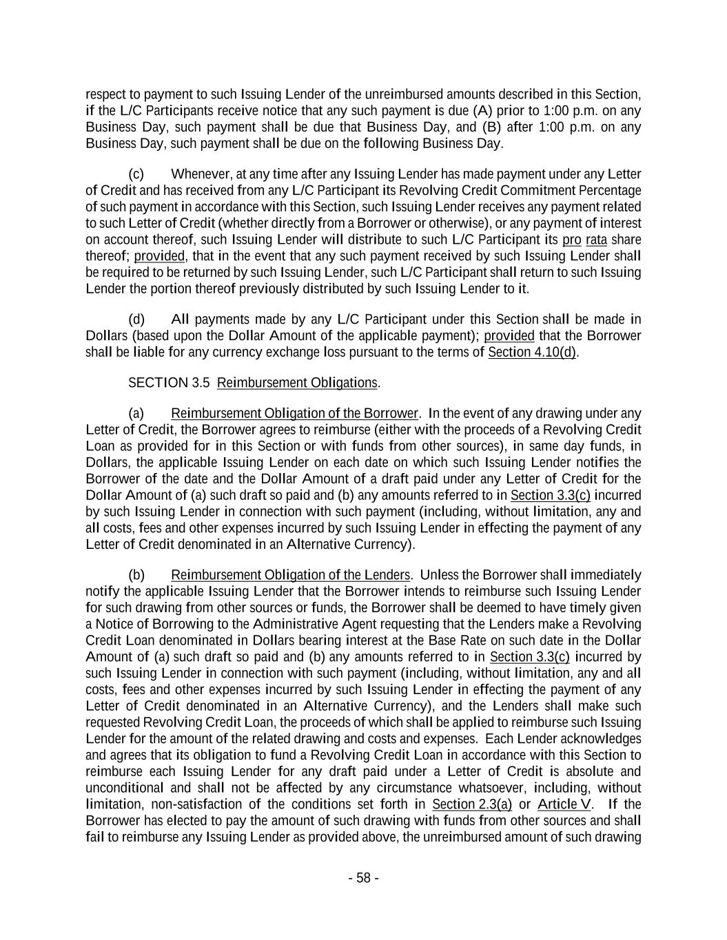 - 58 - respect to payment to such Issuing Lender of the unreimbursed amounts described in this Section, if the L/C Participants receive notice that any such payment is due (A) prior to 1:00 p.m. on any Business Day, such payment shall be due that Business Day, and (B) after 1:00 p.m. on any Business Day, such payment shall be due on the following Business Day. (c) Whenever, at any time after any Issuing Lender has made payment under any Letter of Credit and has received from any L/C Participant its Revolving Credit Commitment Percentage of such payment in accordance with this Section, such Issuing Lender receives any payment related to such Letter of Credit (whether directly from a Borrower or otherwise), or any payment of interest on account thereof, such Issuing Lender will distribute to such L/C Participant its pro rata share thereof; provided, that in the event that any such payment received by such Issuing Lender shall be required to be returned by such Issuing Lender, such L/C Participant shall return to such Issuing Lender the portion thereof previously distributed by such Issuing Lender to it. (d) All payments made by any L/C Participant under this Section shall be made in Dollars (based upon the Dollar Amount of the applicable payment); provided that the Borrower shall be liable for any currency exchange loss pursuant to the terms of Section 4.10(d). SECTION 3.5 Reimbursement Obligations. (a) Reimbursement Obligation of the Borrower. In the event of any drawing under any Letter of Credit, the Borrower agrees to reimburse (either with the proceeds of a Revolving Credit Loan as provided for in this Section or with funds from other sources), in same day funds, in Dollars, the applicable Issuing Lender on each date on which such Issuing Lender notifies the Borrower of the date and the Dollar Amount of a draft paid under any Letter of Credit for the Dollar Amount of (a) such draft so paid and (b) any amounts referred to in Section 3.3(c) incurred by such Issuing Lender in connection with such payment (including, without limitation, any and all costs, fees and other expenses incurred by such Issuing Lender in effecting the payment of any Letter of Credit denominated in an Alternative Currency). (b) Reimbursement Obligation of the Lenders. Unless the Borrower shall immediately notify the applicable Issuing Lender that the Borrower intends to reimburse such Issuing Lender for such drawing from other sources or funds, the Borrower shall be deemed to have timely given a Notice of Borrowing to the Administrative Agent requesting that the Lenders make a Revolving Credit Loan denominated in Dollars bearing interest at the Base Rate on such date in the Dollar Amount of (a) such draft so paid and (b) any amounts referred to in Section 3.3(c) incurred by such Issuing Lender in connection with such payment (including, without limitation, any and all costs, fees and other expenses incurred by such Issuing Lender in effecting the payment of any Letter of Credit denominated in an Alternative Currency), and the Lenders shall make such requested Revolving Credit Loan, the proceeds of which shall be applied to reimburse such Issuing Lender for the amount of the related drawing and costs and expenses. Each Lender acknowledges and agrees that its obligation to fund a Revolving Credit Loan in accordance with this Section to reimburse each Issuing Lender for any draft paid under a Letter of Credit is absolute and unconditional and shall not be affected by any circumstance whatsoever, including, without limitation, non-satisfaction of the conditions set forth in Section 2.3(a) or Article V. If the Borrower has elected to pay the amount of such drawing with funds from other sources and shall fail to reimburse any Issuing Lender as provided above, the unreimbursed amount of such drawing