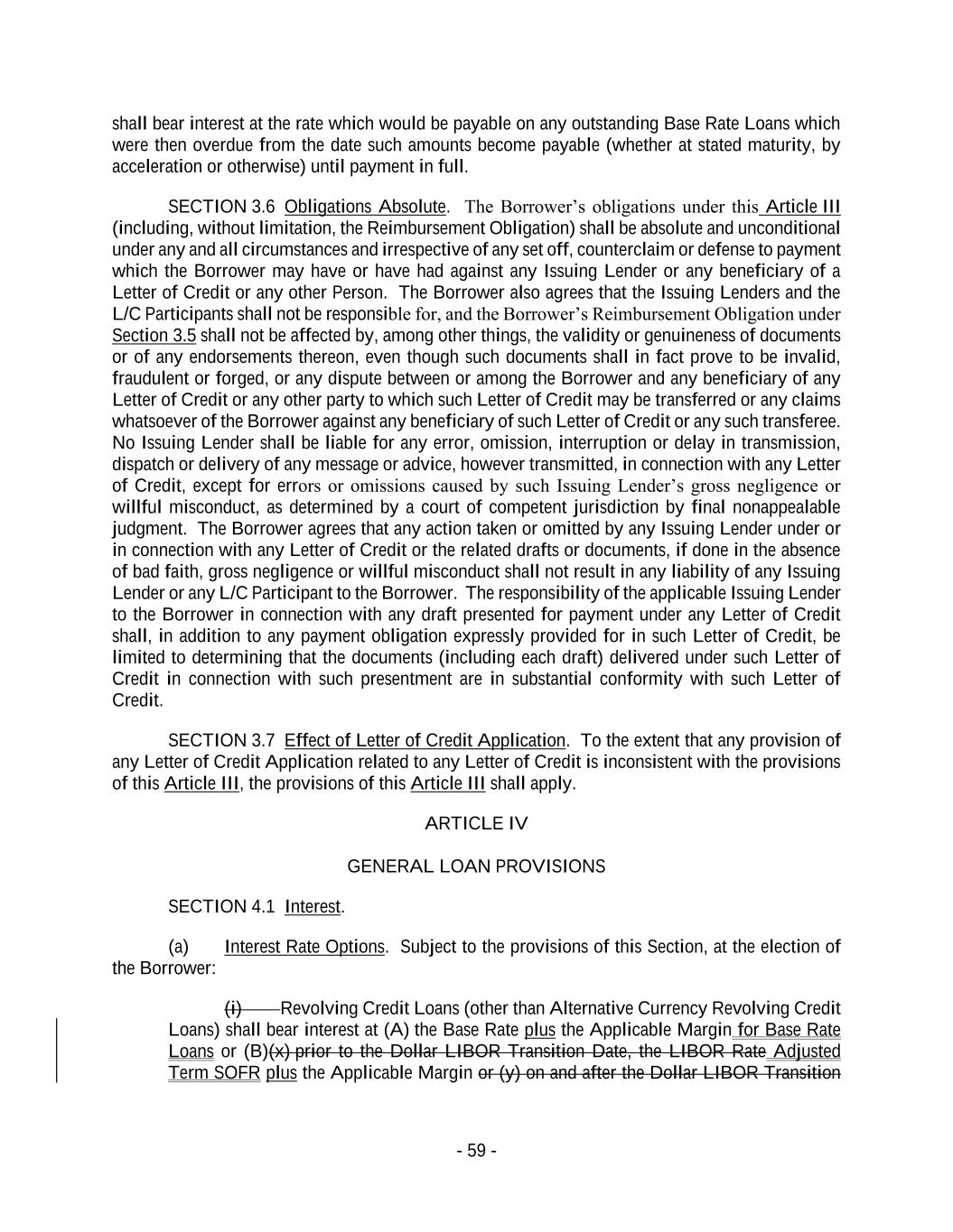 - 59 - shall bear interest at the rate which would be payable on any outstanding Base Rate Loans which were then overdue from the date such amounts become payable (whether at stated maturity, by acceleration or otherwise) until payment in full. SECTION 3.6 Obligations Absolute. The Borrower’s obligations under this Article III (including, without limitation, the Reimbursement Obligation) shall be absolute and unconditional under any and all circumstances and irrespective of any set off, counterclaim or defense to payment which the Borrower may have or have had against any Issuing Lender or any beneficiary of a Letter of Credit or any other Person. The Borrower also agrees that the Issuing Lenders and the L/C Participants shall not be responsible for, and the Borrower’s Reimbursement Obligation under Section 3.5 shall not be affected by, among other things, the validity or genuineness of documents or of any endorsements thereon, even though such documents shall in fact prove to be invalid, fraudulent or forged, or any dispute between or among the Borrower and any beneficiary of any Letter of Credit or any other party to which such Letter of Credit may be transferred or any claims whatsoever of the Borrower against any beneficiary of such Letter of Credit or any such transferee. No Issuing Lender shall be liable for any error, omission, interruption or delay in transmission, dispatch or delivery of any message or advice, however transmitted, in connection with any Letter of Credit, except for errors or omissions caused by such Issuing Lender’s gross negligence or willful misconduct, as determined by a court of competent jurisdiction by final nonappealable judgment. The Borrower agrees that any action taken or omitted by any Issuing Lender under or in connection with any Letter of Credit or the related drafts or documents, if done in the absence of bad faith, gross negligence or willful misconduct shall not result in any liability of any Issuing Lender or any L/C Participant to the Borrower. The responsibility of the applicable Issuing Lender to the Borrower in connection with any draft presented for payment under any Letter of Credit shall, in addition to any payment obligation expressly provided for in such Letter of Credit, be limited to determining that the documents (including each draft) delivered under such Letter of Credit in connection with such presentment are in substantial conformity with such Letter of Credit. SECTION 3.7 Effect of Letter of Credit Application. To the extent that any provision of any Letter of Credit Application related to any Letter of Credit is inconsistent with the provisions of this Article III, the provisions of this Article III shall apply. ARTICLE IV GENERAL LOAN PROVISIONS SECTION 4.1 Interest. (a) Interest Rate Options. Subject to the provisions of this Section, at the election of the Borrower: (i) Revolving Credit Loans (other than Alternative Currency Revolving Credit Loans) shall bear interest at (A) the Base Rate plus the Applicable Margin for Base Rate Loans or (B)(x) prior to the Dollar LIBOR Transition Date, the LIBOR Rate Adjusted Term SOFR plus the Applicable Margin or (y) on and after the Dollar LIBOR Transition