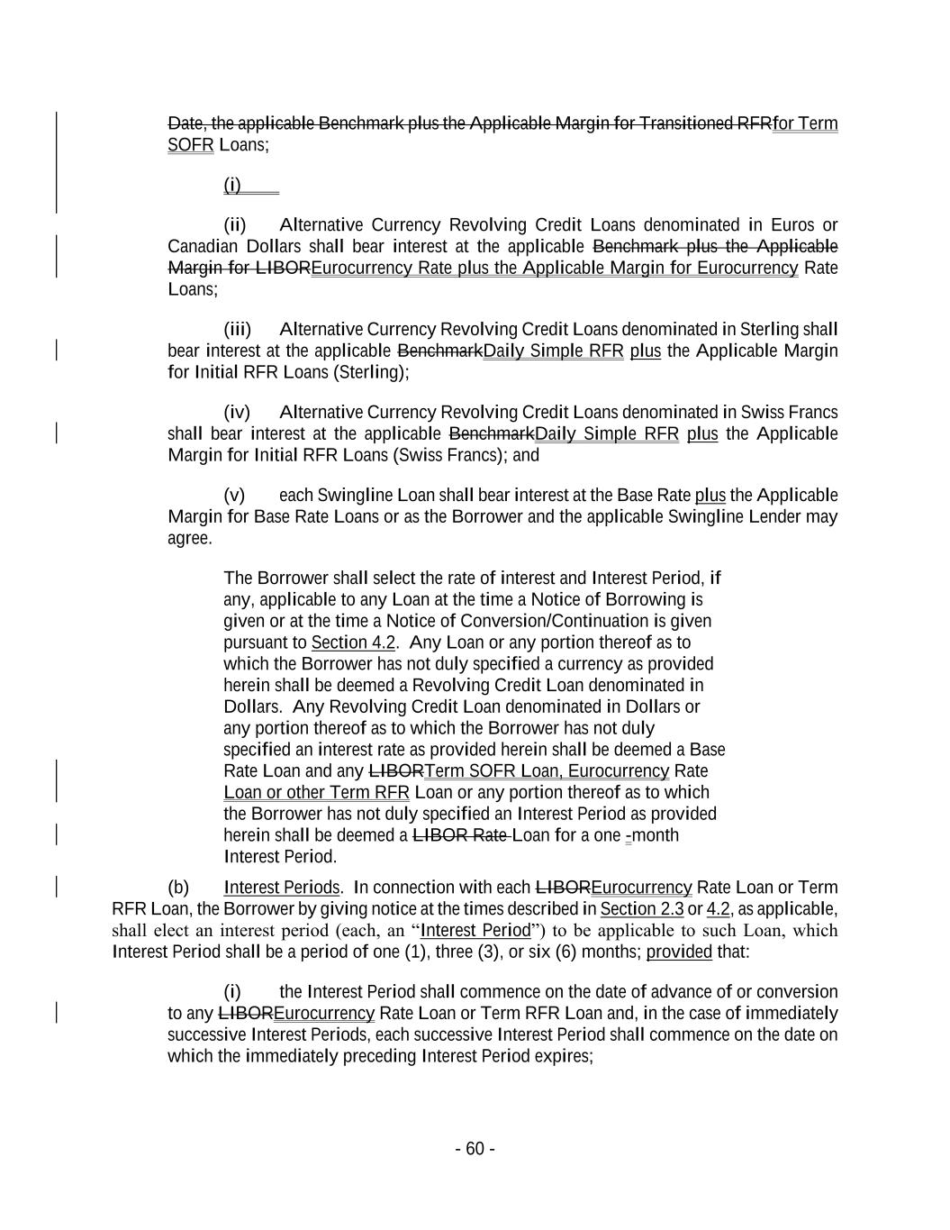 - 60 - Date, the applicable Benchmark plus the Applicable Margin for Transitioned RFRfor Term SOFR Loans; (i) (ii) Alternative Currency Revolving Credit Loans denominated in Euros or Canadian Dollars shall bear interest at the applicable Benchmark plus the Applicable Margin for LIBOREurocurrency Rate plus the Applicable Margin for Eurocurrency Rate Loans; (iii) Alternative Currency Revolving Credit Loans denominated in Sterling shall bear interest at the applicable BenchmarkDaily Simple RFR plus the Applicable Margin for Initial RFR Loans (Sterling); (iv) Alternative Currency Revolving Credit Loans denominated in Swiss Francs shall bear interest at the applicable BenchmarkDaily Simple RFR plus the Applicable Margin for Initial RFR Loans (Swiss Francs); and (v) each Swingline Loan shall bear interest at the Base Rate plus the Applicable Margin for Base Rate Loans or as the Borrower and the applicable Swingline Lender may agree. The Borrower shall select the rate of interest and Interest Period, if any, applicable to any Loan at the time a Notice of Borrowing is given or at the time a Notice of Conversion/Continuation is given pursuant to Section 4.2. Any Loan or any portion thereof as to which the Borrower has not duly specified a currency as provided herein shall be deemed a Revolving Credit Loan denominated in Dollars. Any Revolving Credit Loan denominated in Dollars or any portion thereof as to which the Borrower has not duly specified an interest rate as provided herein shall be deemed a Base Rate Loan and any LIBORTerm SOFR Loan, Eurocurrency Rate Loan or other Term RFR Loan or any portion thereof as to which the Borrower has not duly specified an Interest Period as provided herein shall be deemed a LIBOR Rate Loan for a one -month Interest Period. (b) Interest Periods. In connection with each LIBOREurocurrency Rate Loan or Term RFR Loan, the Borrower by giving notice at the times described in Section 2.3 or 4.2, as applicable, shall elect an interest period (each, an “Interest Period”) to be applicable to such Loan, which Interest Period shall be a period of one (1), three (3), or six (6) months; provided that: (i) the Interest Period shall commence on the date of advance of or conversion to any LIBOREurocurrency Rate Loan or Term RFR Loan and, in the case of immediately successive Interest Periods, each successive Interest Period shall commence on the date on which the immediately preceding Interest Period expires;