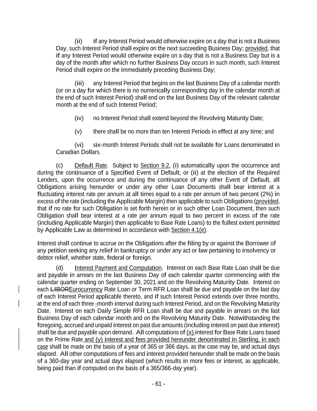 - 61 - (ii) if any Interest Period would otherwise expire on a day that is not a Business Day, such Interest Period shall expire on the next succeeding Business Day; provided, that if any Interest Period would otherwise expire on a day that is not a Business Day but is a day of the month after which no further Business Day occurs in such month, such Interest Period shall expire on the immediately preceding Business Day; (iii) any Interest Period that begins on the last Business Day of a calendar month (or on a day for which there is no numerically corresponding day in the calendar month at the end of such Interest Period) shall end on the last Business Day of the relevant calendar month at the end of such Interest Period; (iv) no Interest Period shall extend beyond the Revolving Maturity Date; (v) there shall be no more than ten Interest Periods in effect at any time; and (vi) six-month Interest Periods shall not be available for Loans denominated in Canadian Dollars. (c) Default Rate. Subject to Section 9.2, (i) automatically upon the occurrence and during the continuance of a Specified Event of Default, or (ii) at the election of the Required Lenders, upon the occurrence and during the continuance of any other Event of Default, all Obligations arising hereunder or under any other Loan Documents shall bear interest at a fluctuating interest rate per annum at all times equal to a rate per annum of two percent (2%) in excess of the rate (including the Applicable Margin) then applicable to such Obligations (provided, that if no rate for such Obligation is set forth herein or in such other Loan Document, then such Obligation shall bear interest at a rate per annum equal to two percent in excess of the rate (including Applicable Margin) then applicable to Base Rate Loans) to the fullest extent permitted by Applicable Law as determined in accordance with Section 4.1(e). Interest shall continue to accrue on the Obligations after the filing by or against the Borrower of any petition seeking any relief in bankruptcy or under any act or law pertaining to insolvency or debtor relief, whether state, federal or foreign. (d) Interest Payment and Computation. Interest on each Base Rate Loan shall be due and payable in arrears on the last Business Day of each calendar quarter commencing with the calendar quarter ending on September 30, 2021 and on the Revolving Maturity Date. Interest on each LIBOREurocurrency Rate Loan or Term RFR Loan shall be due and payable on the last day of each Interest Period applicable thereto, and if such Interest Period extends over three months, at the end of each three -month interval during such Interest Period, and on the Revolving Maturity Date. Interest on each Daily Simple RFR Loan shall be due and payable in arrears on the last Business Day of each calendar month and on the Revolving Maturity Date. Notwithstanding the foregoing, accrued and unpaid interest on past due amounts (including interest on past due interest) shall be due and payable upon demand. All computations of (x) interest for Base Rate Loans based on the Prime Rate and (y) interest and fees provided hereunder denominated in Sterling, in each case shall be made on the basis of a year of 365 or 366 days, as the case may be, and actual days elapsed. All other computations of fees and interest provided hereunder shall be made on the basis of a 360-day year and actual days elapsed (which results in more fees or interest, as applicable, being paid than if computed on the basis of a 365/366-day year).