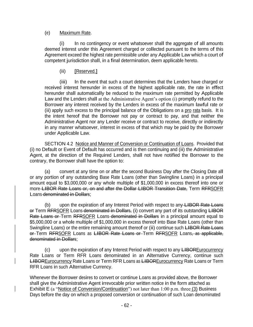 - 62 - (e) Maximum Rate. (i) In no contingency or event whatsoever shall the aggregate of all amounts deemed interest under this Agreement charged or collected pursuant to the terms of this Agreement exceed the highest rate permissible under any Applicable Law which a court of competent jurisdiction shall, in a final determination, deem applicable hereto. (ii) [Reserved.] (iii) In the event that such a court determines that the Lenders have charged or received interest hereunder in excess of the highest applicable rate, the rate in effect hereunder shall automatically be reduced to the maximum rate permitted by Applicable Law and the Lenders shall at the Administrative Agent’s option (i) promptly refund to the Borrower any interest received by the Lenders in excess of the maximum lawful rate or (ii) apply such excess to the principal balance of the Obligations on a pro rata basis. It is the intent hereof that the Borrower not pay or contract to pay, and that neither the Administrative Agent nor any Lender receive or contract to receive, directly or indirectly in any manner whatsoever, interest in excess of that which may be paid by the Borrower under Applicable Law. SECTION 4.2 Notice and Manner of Conversion or Continuation of Loans. Provided that (i) no Default or Event of Default has occurred and is then continuing and (ii) the Administrative Agent, at the direction of the Required Lenders, shall not have notified the Borrower to the contrary, the Borrower shall have the option to: (a) convert at any time on or after the second Business Day after the Closing Date all or any portion of any outstanding Base Rate Loans (other than Swingline Loans) in a principal amount equal to $3,000,000 or any whole multiple of $1,000,000 in excess thereof into one or more LIBOR Rate Loans or, on and after the Dollar LIBOR Transition Date, Term RFRSOFR Loans denominated in Dollars; (b) upon the expiration of any Interest Period with respect to any LIBOR Rate Loans or Term RFRSOFR Loans denominated in Dollars, (i) convert any part of its outstanding LIBOR Rate Loans or Term RFRSOFR Loans denominated in Dollars in a principal amount equal to $5,000,000 or a whole multiple of $1,000,000 in excess thereof into Base Rate Loans (other than Swingline Loans) or the entire remaining amount thereof or (ii) continue such LIBOR Rate Loans or Term RFRSOFR Loans as LIBOR Rate Loans or Term RFRSOFR Loans, as applicable, denominated in Dollars; (c) upon the expiration of any Interest Period with respect to any LIBOREurocurrency Rate Loans or Term RFR Loans denominated in an Alternative Currency, continue such LIBOREurocurrency Rate Loans or Term RFR Loans as LIBOREurocurrency Rate Loans or Term RFR Loans in such Alternative Currency. Whenever the Borrower desires to convert or continue Loans as provided above, the Borrower shall give the Administrative Agent irrevocable prior written notice in the form attached as Exhibit E (a “Notice of Conversion/Continuation”) not later than 1:00 p.m. three (3) Business Days before the day on which a proposed conversion or continuation of such Loan denominated