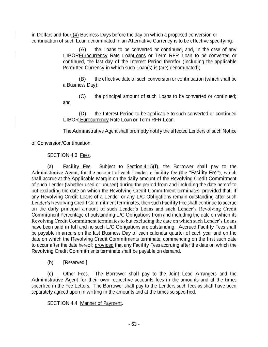 - 63 - in Dollars and four (4) Business Days before the day on which a proposed conversion or continuation of such Loan denominated in an Alternative Currency is to be effective specifying: (A) the Loans to be converted or continued, and, in the case of any LIBOREurocurrency Rate LoanLoans or Term RFR Loan to be converted or continued, the last day of the Interest Period therefor (including the applicable Permitted Currency in which such Loan(s) is (are) denominated); (B) the effective date of such conversion or continuation (which shall be a Business Day); (C) the principal amount of such Loans to be converted or continued; and (D) the Interest Period to be applicable to such converted or continued LIBOR Eurocurrency Rate Loan or Term RFR Loan. The Administrative Agent shall promptly notify the affected Lenders of such Notice of Conversion/Continuation. SECTION 4.3 Fees. (a) Facility Fee. Subject to Section 4.15(f), the Borrower shall pay to the Administrative Agent, for the account of each Lender, a facility fee (the “Facility Fee”), which shall accrue at the Applicable Margin on the daily amount of the Revolving Credit Commitment of such Lender (whether used or unused) during the period from and including the date hereof to but excluding the date on which the Revolving Credit Commitment terminates; provided that, if any Revolving Credit Loans of a Lender or any L/C Obligations remain outstanding after such Lender’s Revolving Credit Commitment terminates, then such Facility Fee shall continue to accrue on the daily principal amount of such Lender’s Loans and such Lender’s Revolving Credit Commitment Percentage of outstanding L/C Obligations from and including the date on which its Revolving Credit Commitment terminates to but excluding the date on which such Lender’s Loans have been paid in full and no such L/C Obligations are outstanding. Accrued Facility Fees shall be payable in arrears on the last Business Day of each calendar quarter of each year and on the date on which the Revolving Credit Commitments terminate, commencing on the first such date to occur after the date hereof; provided that any Facility Fees accruing after the date on which the Revolving Credit Commitments terminate shall be payable on demand. (b) [Reserved.] (c) Other Fees. The Borrower shall pay to the Joint Lead Arrangers and the Administrative Agent for their own respective accounts fees in the amounts and at the times specified in the Fee Letters. The Borrower shall pay to the Lenders such fees as shall have been separately agreed upon in writing in the amounts and at the times so specified. SECTION 4.4 Manner of Payment.