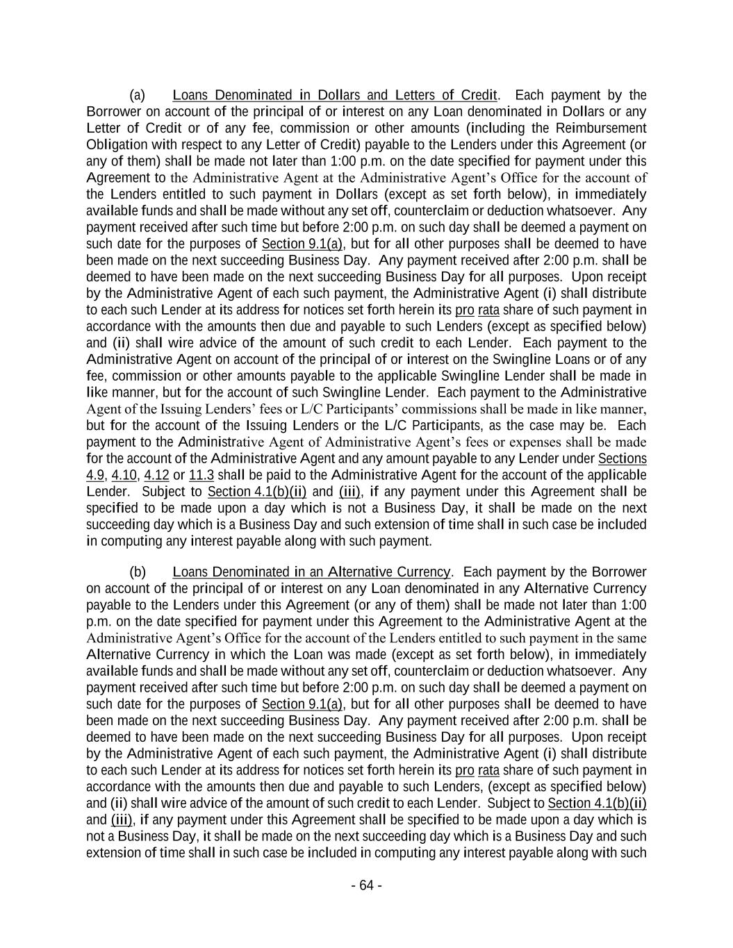 - 64 - (a) Loans Denominated in Dollars and Letters of Credit. Each payment by the Borrower on account of the principal of or interest on any Loan denominated in Dollars or any Letter of Credit or of any fee, commission or other amounts (including the Reimbursement Obligation with respect to any Letter of Credit) payable to the Lenders under this Agreement (or any of them) shall be made not later than 1:00 p.m. on the date specified for payment under this Agreement to the Administrative Agent at the Administrative Agent’s Office for the account of the Lenders entitled to such payment in Dollars (except as set forth below), in immediately available funds and shall be made without any set off, counterclaim or deduction whatsoever. Any payment received after such time but before 2:00 p.m. on such day shall be deemed a payment on such date for the purposes of Section 9.1(a), but for all other purposes shall be deemed to have been made on the next succeeding Business Day. Any payment received after 2:00 p.m. shall be deemed to have been made on the next succeeding Business Day for all purposes. Upon receipt by the Administrative Agent of each such payment, the Administrative Agent (i) shall distribute to each such Lender at its address for notices set forth herein its pro rata share of such payment in accordance with the amounts then due and payable to such Lenders (except as specified below) and (ii) shall wire advice of the amount of such credit to each Lender. Each payment to the Administrative Agent on account of the principal of or interest on the Swingline Loans or of any fee, commission or other amounts payable to the applicable Swingline Lender shall be made in like manner, but for the account of such Swingline Lender. Each payment to the Administrative Agent of the Issuing Lenders’ fees or L/C Participants’ commissions shall be made in like manner, but for the account of the Issuing Lenders or the L/C Participants, as the case may be. Each payment to the Administrative Agent of Administrative Agent’s fees or expenses shall be made for the account of the Administrative Agent and any amount payable to any Lender under Sections 4.9, 4.10, 4.12 or 11.3 shall be paid to the Administrative Agent for the account of the applicable Lender. Subject to Section 4.1(b)(ii) and (iii), if any payment under this Agreement shall be specified to be made upon a day which is not a Business Day, it shall be made on the next succeeding day which is a Business Day and such extension of time shall in such case be included in computing any interest payable along with such payment. (b) Loans Denominated in an Alternative Currency. Each payment by the Borrower on account of the principal of or interest on any Loan denominated in any Alternative Currency payable to the Lenders under this Agreement (or any of them) shall be made not later than 1:00 p.m. on the date specified for payment under this Agreement to the Administrative Agent at the Administrative Agent’s Office for the account of the Lenders entitled to such payment in the same Alternative Currency in which the Loan was made (except as set forth below), in immediately available funds and shall be made without any set off, counterclaim or deduction whatsoever. Any payment received after such time but before 2:00 p.m. on such day shall be deemed a payment on such date for the purposes of Section 9.1(a), but for all other purposes shall be deemed to have been made on the next succeeding Business Day. Any payment received after 2:00 p.m. shall be deemed to have been made on the next succeeding Business Day for all purposes. Upon receipt by the Administrative Agent of each such payment, the Administrative Agent (i) shall distribute to each such Lender at its address for notices set forth herein its pro rata share of such payment in accordance with the amounts then due and payable to such Lenders, (except as specified below) and (ii) shall wire advice of the amount of such credit to each Lender. Subject to Section 4.1(b)(ii) and (iii), if any payment under this Agreement shall be specified to be made upon a day which is not a Business Day, it shall be made on the next succeeding day which is a Business Day and such extension of time shall in such case be included in computing any interest payable along with such