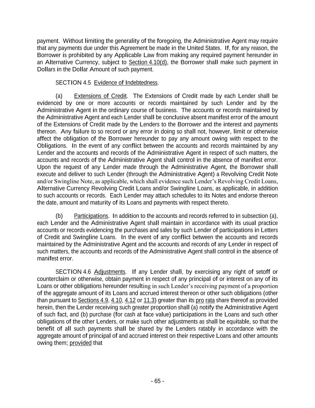 - 65 - payment. Without limiting the generality of the foregoing, the Administrative Agent may require that any payments due under this Agreement be made in the United States. If, for any reason, the Borrower is prohibited by any Applicable Law from making any required payment hereunder in an Alternative Currency, subject to Section 4.10(d), the Borrower shall make such payment in Dollars in the Dollar Amount of such payment. SECTION 4.5 Evidence of Indebtedness. (a) Extensions of Credit. The Extensions of Credit made by each Lender shall be evidenced by one or more accounts or records maintained by such Lender and by the Administrative Agent in the ordinary course of business. The accounts or records maintained by the Administrative Agent and each Lender shall be conclusive absent manifest error of the amount of the Extensions of Credit made by the Lenders to the Borrower and the interest and payments thereon. Any failure to so record or any error in doing so shall not, however, limit or otherwise affect the obligation of the Borrower hereunder to pay any amount owing with respect to the Obligations. In the event of any conflict between the accounts and records maintained by any Lender and the accounts and records of the Administrative Agent in respect of such matters, the accounts and records of the Administrative Agent shall control in the absence of manifest error. Upon the request of any Lender made through the Administrative Agent, the Borrower shall execute and deliver to such Lender (through the Administrative Agent) a Revolving Credit Note and/or Swingline Note, as applicable, which shall evidence such Lender’s Revolving Credit Loans, Alternative Currency Revolving Credit Loans and/or Swingline Loans, as applicable, in addition to such accounts or records. Each Lender may attach schedules to its Notes and endorse thereon the date, amount and maturity of its Loans and payments with respect thereto. (b) Participations. In addition to the accounts and records referred to in subsection (a), each Lender and the Administrative Agent shall maintain in accordance with its usual practice accounts or records evidencing the purchases and sales by such Lender of participations in Letters of Credit and Swingline Loans. In the event of any conflict between the accounts and records maintained by the Administrative Agent and the accounts and records of any Lender in respect of such matters, the accounts and records of the Administrative Agent shall control in the absence of manifest error. SECTION 4.6 Adjustments. If any Lender shall, by exercising any right of setoff or counterclaim or otherwise, obtain payment in respect of any principal of or interest on any of its Loans or other obligations hereunder resulting in such Lender’s receiving payment of a proportion of the aggregate amount of its Loans and accrued interest thereon or other such obligations (other than pursuant to Sections 4.9, 4.10, 4.12 or 11.3) greater than its pro rata share thereof as provided herein, then the Lender receiving such greater proportion shall (a) notify the Administrative Agent of such fact, and (b) purchase (for cash at face value) participations in the Loans and such other obligations of the other Lenders, or make such other adjustments as shall be equitable, so that the benefit of all such payments shall be shared by the Lenders ratably in accordance with the aggregate amount of principal of and accrued interest on their respective Loans and other amounts owing them; provided that