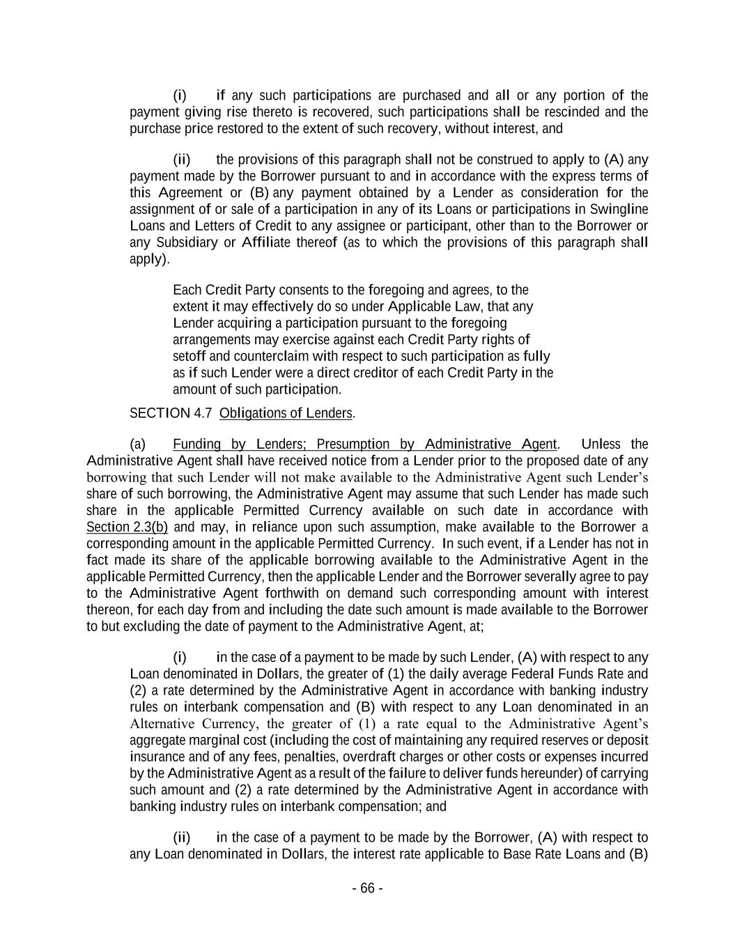 - 66 - (i) if any such participations are purchased and all or any portion of the payment giving rise thereto is recovered, such participations shall be rescinded and the purchase price restored to the extent of such recovery, without interest, and (ii) the provisions of this paragraph shall not be construed to apply to (A) any payment made by the Borrower pursuant to and in accordance with the express terms of this Agreement or (B) any payment obtained by a Lender as consideration for the assignment of or sale of a participation in any of its Loans or participations in Swingline Loans and Letters of Credit to any assignee or participant, other than to the Borrower or any Subsidiary or Affiliate thereof (as to which the provisions of this paragraph shall apply). Each Credit Party consents to the foregoing and agrees, to the extent it may effectively do so under Applicable Law, that any Lender acquiring a participation pursuant to the foregoing arrangements may exercise against each Credit Party rights of setoff and counterclaim with respect to such participation as fully as if such Lender were a direct creditor of each Credit Party in the amount of such participation. SECTION 4.7 Obligations of Lenders. (a) Funding by Lenders; Presumption by Administrative Agent. Unless the Administrative Agent shall have received notice from a Lender prior to the proposed date of any borrowing that such Lender will not make available to the Administrative Agent such Lender’s share of such borrowing, the Administrative Agent may assume that such Lender has made such share in the applicable Permitted Currency available on such date in accordance with Section 2.3(b) and may, in reliance upon such assumption, make available to the Borrower a corresponding amount in the applicable Permitted Currency. In such event, if a Lender has not in fact made its share of the applicable borrowing available to the Administrative Agent in the applicable Permitted Currency, then the applicable Lender and the Borrower severally agree to pay to the Administrative Agent forthwith on demand such corresponding amount with interest thereon, for each day from and including the date such amount is made available to the Borrower to but excluding the date of payment to the Administrative Agent, at; (i) in the case of a payment to be made by such Lender, (A) with respect to any Loan denominated in Dollars, the greater of (1) the daily average Federal Funds Rate and (2) a rate determined by the Administrative Agent in accordance with banking industry rules on interbank compensation and (B) with respect to any Loan denominated in an Alternative Currency, the greater of (1) a rate equal to the Administrative Agent’s aggregate marginal cost (including the cost of maintaining any required reserves or deposit insurance and of any fees, penalties, overdraft charges or other costs or expenses incurred by the Administrative Agent as a result of the failure to deliver funds hereunder) of carrying such amount and (2) a rate determined by the Administrative Agent in accordance with banking industry rules on interbank compensation; and (ii) in the case of a payment to be made by the Borrower, (A) with respect to any Loan denominated in Dollars, the interest rate applicable to Base Rate Loans and (B)