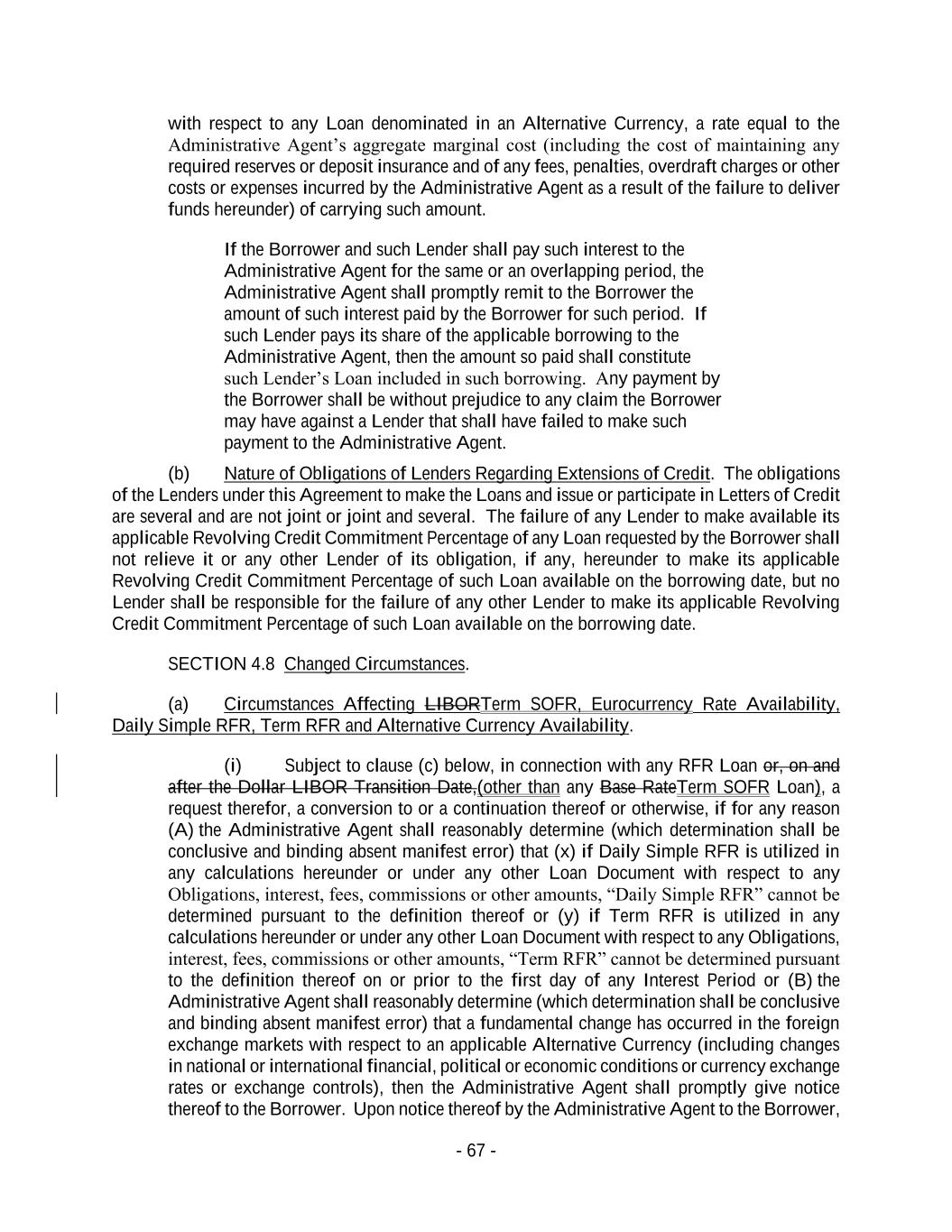 - 67 - with respect to any Loan denominated in an Alternative Currency, a rate equal to the Administrative Agent’s aggregate marginal cost (including the cost of maintaining any required reserves or deposit insurance and of any fees, penalties, overdraft charges or other costs or expenses incurred by the Administrative Agent as a result of the failure to deliver funds hereunder) of carrying such amount. If the Borrower and such Lender shall pay such interest to the Administrative Agent for the same or an overlapping period, the Administrative Agent shall promptly remit to the Borrower the amount of such interest paid by the Borrower for such period. If such Lender pays its share of the applicable borrowing to the Administrative Agent, then the amount so paid shall constitute such Lender’s Loan included in such borrowing. Any payment by the Borrower shall be without prejudice to any claim the Borrower may have against a Lender that shall have failed to make such payment to the Administrative Agent. (b) Nature of Obligations of Lenders Regarding Extensions of Credit. The obligations of the Lenders under this Agreement to make the Loans and issue or participate in Letters of Credit are several and are not joint or joint and several. The failure of any Lender to make available its applicable Revolving Credit Commitment Percentage of any Loan requested by the Borrower shall not relieve it or any other Lender of its obligation, if any, hereunder to make its applicable Revolving Credit Commitment Percentage of such Loan available on the borrowing date, but no Lender shall be responsible for the failure of any other Lender to make its applicable Revolving Credit Commitment Percentage of such Loan available on the borrowing date. SECTION 4.8 Changed Circumstances. (a) Circumstances Affecting LIBORTerm SOFR, Eurocurrency Rate Availability, Daily Simple RFR, Term RFR and Alternative Currency Availability. (i) Subject to clause (c) below, in connection with any RFR Loan or, on and after the Dollar LIBOR Transition Date,(other than any Base RateTerm SOFR Loan), a request therefor, a conversion to or a continuation thereof or otherwise, if for any reason (A) the Administrative Agent shall reasonably determine (which determination shall be conclusive and binding absent manifest error) that (x) if Daily Simple RFR is utilized in any calculations hereunder or under any other Loan Document with respect to any Obligations, interest, fees, commissions or other amounts, “Daily Simple RFR” cannot be determined pursuant to the definition thereof or (y) if Term RFR is utilized in any calculations hereunder or under any other Loan Document with respect to any Obligations, interest, fees, commissions or other amounts, “Term RFR” cannot be determined pursuant to the definition thereof on or prior to the first day of any Interest Period or (B) the Administrative Agent shall reasonably determine (which determination shall be conclusive and binding absent manifest error) that a fundamental change has occurred in the foreign exchange markets with respect to an applicable Alternative Currency (including changes in national or international financial, political or economic conditions or currency exchange rates or exchange controls), then the Administrative Agent shall promptly give notice thereof to the Borrower. Upon notice thereof by the Administrative Agent to the Borrower,