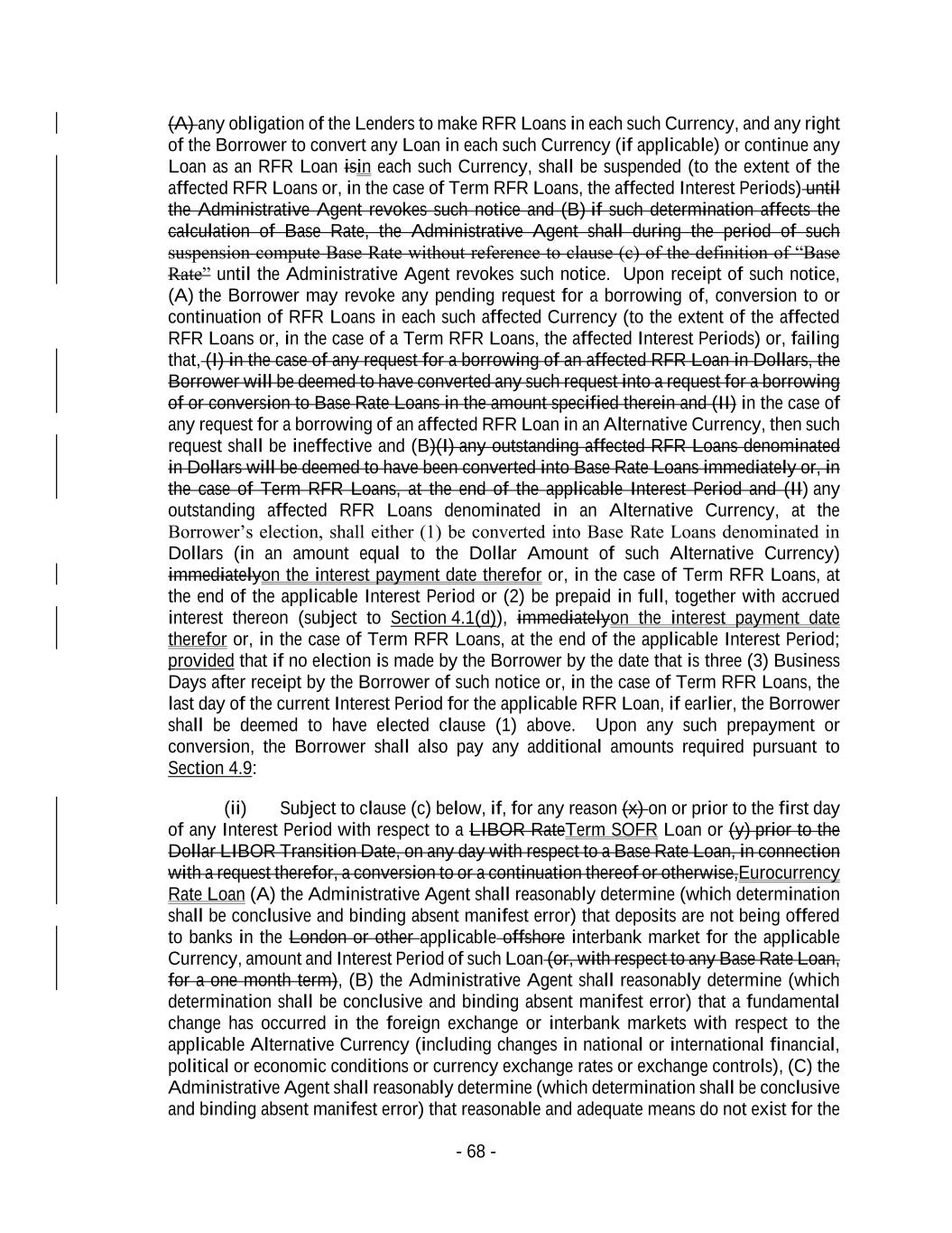 - 68 - (A) any obligation of the Lenders to make RFR Loans in each such Currency, and any right of the Borrower to convert any Loan in each such Currency (if applicable) or continue any Loan as an RFR Loan isin each such Currency, shall be suspended (to the extent of the affected RFR Loans or, in the case of Term RFR Loans, the affected Interest Periods) until the Administrative Agent revokes such notice and (B) if such determination affects the calculation of Base Rate, the Administrative Agent shall during the period of such suspension compute Base Rate without reference to clause (c) of the definition of “Base Rate” until the Administrative Agent revokes such notice. Upon receipt of such notice, (A) the Borrower may revoke any pending request for a borrowing of, conversion to or continuation of RFR Loans in each such affected Currency (to the extent of the affected RFR Loans or, in the case of a Term RFR Loans, the affected Interest Periods) or, failing that, (I) in the case of any request for a borrowing of an affected RFR Loan in Dollars, the Borrower will be deemed to have converted any such request into a request for a borrowing of or conversion to Base Rate Loans in the amount specified therein and (II) in the case of any request for a borrowing of an affected RFR Loan in an Alternative Currency, then such request shall be ineffective and (B)(I) any outstanding affected RFR Loans denominated in Dollars will be deemed to have been converted into Base Rate Loans immediately or, in the case of Term RFR Loans, at the end of the applicable Interest Period and (II) any outstanding affected RFR Loans denominated in an Alternative Currency, at the Borrower’s election, shall either (1) be converted into Base Rate Loans denominated in Dollars (in an amount equal to the Dollar Amount of such Alternative Currency) immediatelyon the interest payment date therefor or, in the case of Term RFR Loans, at the end of the applicable Interest Period or (2) be prepaid in full, together with accrued interest thereon (subject to Section 4.1(d)), immediatelyon the interest payment date therefor or, in the case of Term RFR Loans, at the end of the applicable Interest Period; provided that if no election is made by the Borrower by the date that is three (3) Business Days after receipt by the Borrower of such notice or, in the case of Term RFR Loans, the last day of the current Interest Period for the applicable RFR Loan, if earlier, the Borrower shall be deemed to have elected clause (1) above. Upon any such prepayment or conversion, the Borrower shall also pay any additional amounts required pursuant to Section 4.9: (ii) Subject to clause (c) below, if, for any reason (x) on or prior to the first day of any Interest Period with respect to a LIBOR RateTerm SOFR Loan or (y) prior to the Dollar LIBOR Transition Date, on any day with respect to a Base Rate Loan, in connection with a request therefor, a conversion to or a continuation thereof or otherwise,Eurocurrency Rate Loan (A) the Administrative Agent shall reasonably determine (which determination shall be conclusive and binding absent manifest error) that deposits are not being offered to banks in the London or other applicable offshore interbank market for the applicable Currency, amount and Interest Period of such Loan (or, with respect to any Base Rate Loan, for a one month term), (B) the Administrative Agent shall reasonably determine (which determination shall be conclusive and binding absent manifest error) that a fundamental change has occurred in the foreign exchange or interbank markets with respect to the applicable Alternative Currency (including changes in national or international financial, political or economic conditions or currency exchange rates or exchange controls), (C) the Administrative Agent shall reasonably determine (which determination shall be conclusive and binding absent manifest error) that reasonable and adequate means do not exist for the