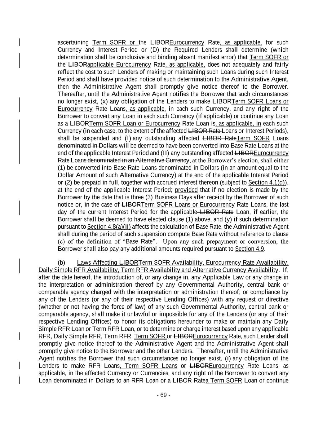 - 69 - ascertaining Term SOFR or the LIBOREurocurrency Rate, as applicable, for such Currency and Interest Period or (D) the Required Lenders shall determine (which determination shall be conclusive and binding absent manifest error) that Term SOFR or the LIBORapplicable Eurocurrency Rate, as applicable, does not adequately and fairly reflect the cost to such Lenders of making or maintaining such Loans during such Interest Period and shall have provided notice of such determination to the Administrative Agent, then the Administrative Agent shall promptly give notice thereof to the Borrower. Thereafter, until the Administrative Agent notifies the Borrower that such circumstances no longer exist, (x) any obligation of the Lenders to make LIBORTerm SOFR Loans or Eurocurrency Rate Loans, as applicable, in each such Currency, and any right of the Borrower to convert any Loan in each such Currency (if applicable) or continue any Loan as a LIBORTerm SOFR Loan or Eurocurrency Rate Loan is, as applicable, in each such Currency (in each case, to the extent of the affected LIBOR Rate Loans or Interest Periods), shall be suspended and (I) any outstanding affected LIBOR RateTerm SOFR Loans denominated in Dollars will be deemed to have been converted into Base Rate Loans at the end of the applicable Interest Period and (II) any outstanding affected LIBOREurocurrency Rate Loans denominated in an Alternative Currency, at the Borrower’s election, shall either (1) be converted into Base Rate Loans denominated in Dollars (in an amount equal to the Dollar Amount of such Alternative Currency) at the end of the applicable Interest Period or (2) be prepaid in full, together with accrued interest thereon (subject to Section 4.1(d)), at the end of the applicable Interest Period; provided that if no election is made by the Borrower by the date that is three (3) Business Days after receipt by the Borrower of such notice or, in the case of LIBORTerm SOFR Loans or Eurocurrency Rate Loans, the last day of the current Interest Period for the applicable LIBOR Rate Loan, if earlier, the Borrower shall be deemed to have elected clause (1) above, and (y) if such determination pursuant to Section 4.8(a)(ii) affects the calculation of Base Rate, the Administrative Agent shall during the period of such suspension compute Base Rate without reference to clause (c) of the definition of “Base Rate”. Upon any such prepayment or conversion, the Borrower shall also pay any additional amounts required pursuant to Section 4.9. (b) Laws Affecting LIBORTerm SOFR Availability, Eurocurrency Rate Availability, Daily Simple RFR Availability, Term RFR Availability and Alternative Currency Availability. If, after the date hereof, the introduction of, or any change in, any Applicable Law or any change in the interpretation or administration thereof by any Governmental Authority, central bank or comparable agency charged with the interpretation or administration thereof, or compliance by any of the Lenders (or any of their respective Lending Offices) with any request or directive (whether or not having the force of law) of any such Governmental Authority, central bank or comparable agency, shall make it unlawful or impossible for any of the Lenders (or any of their respective Lending Offices) to honor its obligations hereunder to make or maintain any Daily Simple RFR Loan or Term RFR Loan, or to determine or charge interest based upon any applicable RFR, Daily Simple RFR, Term RFR, Term SOFR or LIBOREurocurrency Rate, such Lender shall promptly give notice thereof to the Administrative Agent and the Administrative Agent shall promptly give notice to the Borrower and the other Lenders. Thereafter, until the Administrative Agent notifies the Borrower that such circumstances no longer exist, (i) any obligation of the Lenders to make RFR Loans, Term SOFR Loans or LIBOREurocurrency Rate Loans, as applicable, in the affected Currency or Currencies, and any right of the Borrower to convert any Loan denominated in Dollars to an RFR Loan or a LIBOR Ratea Term SOFR Loan or continue