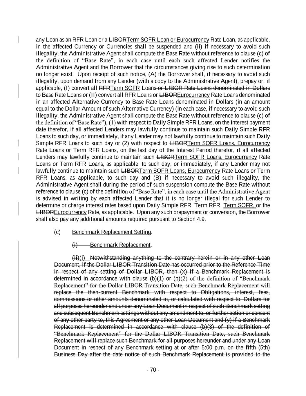 - 70 - any Loan as an RFR Loan or a LIBORTerm SOFR Loan or Eurocurrency Rate Loan, as applicable, in the affected Currency or Currencies shall be suspended and (ii) if necessary to avoid such illegality, the Administrative Agent shall compute the Base Rate without reference to clause (c) of the definition of “Base Rate”, in each case until each such affected Lender notifies the Administrative Agent and the Borrower that the circumstances giving rise to such determination no longer exist. Upon receipt of such notice, (A) the Borrower shall, if necessary to avoid such illegality, upon demand from any Lender (with a copy to the Administrative Agent), prepay or, if applicable, (I) convert all RFRTerm SOFR Loans or LIBOR Rate Loans denominated in Dollars to Base Rate Loans or (II) convert all RFR Loans or LIBOREurocurrency Rate Loans denominated in an affected Alternative Currency to Base Rate Loans denominated in Dollars (in an amount equal to the Dollar Amount of such Alternative Currency) (in each case, if necessary to avoid such illegality, the Administrative Agent shall compute the Base Rate without reference to clause (c) of the definition of “Base Rate”), (1) with respect to Daily Simple RFR Loans, on the interest payment date therefor, if all affected Lenders may lawfully continue to maintain such Daily Simple RFR Loans to such day, or immediately, if any Lender may not lawfully continue to maintain such Daily Simple RFR Loans to such day or (2) with respect to LIBORTerm SOFR Loans, Eurocurrency Rate Loans or Term RFR Loans, on the last day of the Interest Period therefor, if all affected Lenders may lawfully continue to maintain such LIBORTerm SOFR Loans, Eurocurrency Rate Loans or Term RFR Loans, as applicable, to such day, or immediately, if any Lender may not lawfully continue to maintain such LIBORTerm SOFR Loans, Eurocurrency Rate Loans or Term RFR Loans, as applicable, to such day and (B) if necessary to avoid such illegality, the Administrative Agent shall during the period of such suspension compute the Base Rate without reference to clause (c) of the definition of “Base Rate”, in each case until the Administrative Agent is advised in writing by each affected Lender that it is no longer illegal for such Lender to determine or charge interest rates based upon Daily Simple RFR, Term RFR, Term SOFR, or the LIBOREurocurrency Rate, as applicable. Upon any such prepayment or conversion, the Borrower shall also pay any additional amounts required pursuant to Section 4.9. (c) Benchmark Replacement Setting. (i) Benchmark Replacement. (ii)(i) Notwithstanding anything to the contrary herein or in any other Loan Document, if the Dollar LIBOR Transition Date has occurred prior to the Reference Time in respect of any setting of Dollar LIBOR, then (x) if a Benchmark Replacement is determined in accordance with clause (b)(1) or (b)(2) of the definition of “Benchmark Replacement” for the Dollar LIBOR Transition Date, such Benchmark Replacement will replace the then-current Benchmark with respect to Obligations, interest, fees, commissions or other amounts denominated in, or calculated with respect to, Dollars for all purposes hereunder and under any Loan Document in respect of such Benchmark setting and subsequent Benchmark settings without any amendment to, or further action or consent of any other party to, this Agreement or any other Loan Document and (y) if a Benchmark Replacement is determined in accordance with clause (b)(3) of the definition of “Benchmark Replacement” for the Dollar LIBOR Transition Date, such Benchmark Replacement will replace such Benchmark for all purposes hereunder and under any Loan Document in respect of any Benchmark setting at or after 5:00 p.m. on the fifth (5th) Business Day after the date notice of such Benchmark Replacement is provided to the