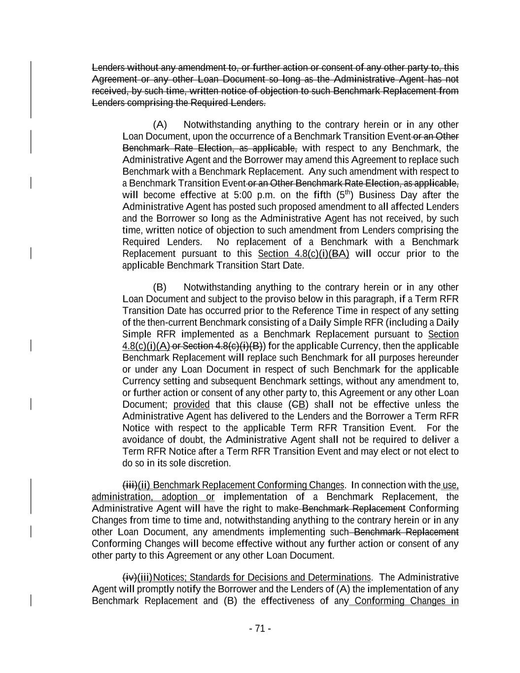 - 71 - Lenders without any amendment to, or further action or consent of any other party to, this Agreement or any other Loan Document so long as the Administrative Agent has not received, by such time, written notice of objection to such Benchmark Replacement from Lenders comprising the Required Lenders. (A) Notwithstanding anything to the contrary herein or in any other Loan Document, upon the occurrence of a Benchmark Transition Event or an Other Benchmark Rate Election, as applicable, with respect to any Benchmark, the Administrative Agent and the Borrower may amend this Agreement to replace such Benchmark with a Benchmark Replacement. Any such amendment with respect to a Benchmark Transition Event or an Other Benchmark Rate Election, as applicable, will become effective at 5:00 p.m. on the fifth (5th) Business Day after the Administrative Agent has posted such proposed amendment to all affected Lenders and the Borrower so long as the Administrative Agent has not received, by such time, written notice of objection to such amendment from Lenders comprising the Required Lenders. No replacement of a Benchmark with a Benchmark Replacement pursuant to this Section 4.8(c)(i)(BA) will occur prior to the applicable Benchmark Transition Start Date. (B) Notwithstanding anything to the contrary herein or in any other Loan Document and subject to the proviso below in this paragraph, if a Term RFR Transition Date has occurred prior to the Reference Time in respect of any setting of the then-current Benchmark consisting of a Daily Simple RFR (including a Daily Simple RFR implemented as a Benchmark Replacement pursuant to Section 4.8(c)(i)(A) or Section 4.8(c)(i)(B)) for the applicable Currency, then the applicable Benchmark Replacement will replace such Benchmark for all purposes hereunder or under any Loan Document in respect of such Benchmark for the applicable Currency setting and subsequent Benchmark settings, without any amendment to, or further action or consent of any other party to, this Agreement or any other Loan Document; provided that this clause (CB) shall not be effective unless the Administrative Agent has delivered to the Lenders and the Borrower a Term RFR Notice with respect to the applicable Term RFR Transition Event. For the avoidance of doubt, the Administrative Agent shall not be required to deliver a Term RFR Notice after a Term RFR Transition Event and may elect or not elect to do so in its sole discretion. (iii)(ii) Benchmark Replacement Conforming Changes. In connection with the use, administration, adoption or implementation of a Benchmark Replacement, the Administrative Agent will have the right to make Benchmark Replacement Conforming Changes from time to time and, notwithstanding anything to the contrary herein or in any other Loan Document, any amendments implementing such Benchmark Replacement Conforming Changes will become effective without any further action or consent of any other party to this Agreement or any other Loan Document. (iv)(iii) Notices; Standards for Decisions and Determinations. The Administrative Agent will promptly notify the Borrower and the Lenders of (A) the implementation of any Benchmark Replacement and (B) the effectiveness of any Conforming Changes in