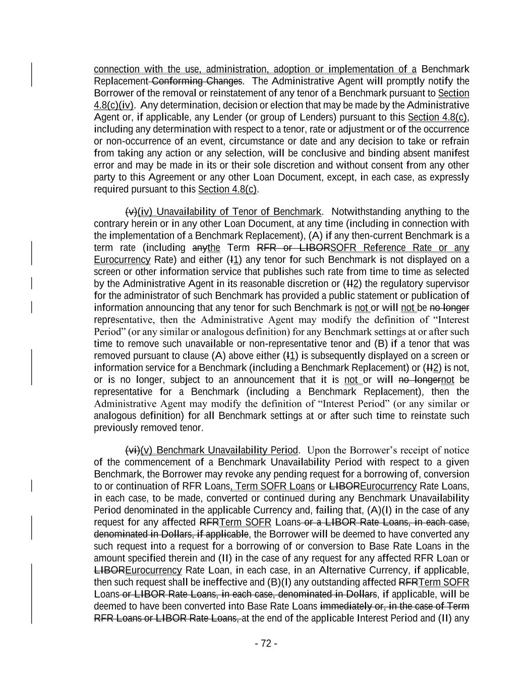 - 72 - connection with the use, administration, adoption or implementation of a Benchmark Replacement Conforming Changes. The Administrative Agent will promptly notify the Borrower of the removal or reinstatement of any tenor of a Benchmark pursuant to Section 4.8(c)(iv). Any determination, decision or election that may be made by the Administrative Agent or, if applicable, any Lender (or group of Lenders) pursuant to this Section 4.8(c), including any determination with respect to a tenor, rate or adjustment or of the occurrence or non-occurrence of an event, circumstance or date and any decision to take or refrain from taking any action or any selection, will be conclusive and binding absent manifest error and may be made in its or their sole discretion and without consent from any other party to this Agreement or any other Loan Document, except, in each case, as expressly required pursuant to this Section 4.8(c). (v)(iv) Unavailability of Tenor of Benchmark. Notwithstanding anything to the contrary herein or in any other Loan Document, at any time (including in connection with the implementation of a Benchmark Replacement), (A) if any then-current Benchmark is a term rate (including anythe Term RFR or LIBORSOFR Reference Rate or any Eurocurrency Rate) and either (I1) any tenor for such Benchmark is not displayed on a screen or other information service that publishes such rate from time to time as selected by the Administrative Agent in its reasonable discretion or (II2) the regulatory supervisor for the administrator of such Benchmark has provided a public statement or publication of information announcing that any tenor for such Benchmark is not or will not be no longer representative, then the Administrative Agent may modify the definition of “Interest Period” (or any similar or analogous definition) for any Benchmark settings at or after such time to remove such unavailable or non-representative tenor and (B) if a tenor that was removed pursuant to clause (A) above either (I1) is subsequently displayed on a screen or information service for a Benchmark (including a Benchmark Replacement) or (II2) is not, or is no longer, subject to an announcement that it is not or will no longernot be representative for a Benchmark (including a Benchmark Replacement), then the Administrative Agent may modify the definition of “Interest Period” (or any similar or analogous definition) for all Benchmark settings at or after such time to reinstate such previously removed tenor. (vi)(v) Benchmark Unavailability Period. Upon the Borrower’s receipt of notice of the commencement of a Benchmark Unavailability Period with respect to a given Benchmark, the Borrower may revoke any pending request for a borrowing of, conversion to or continuation of RFR Loans, Term SOFR Loans or LIBOREurocurrency Rate Loans, in each case, to be made, converted or continued during any Benchmark Unavailability Period denominated in the applicable Currency and, failing that, (A)(I) in the case of any request for any affected RFRTerm SOFR Loans or a LIBOR Rate Loans, in each case, denominated in Dollars, if applicable, the Borrower will be deemed to have converted any such request into a request for a borrowing of or conversion to Base Rate Loans in the amount specified therein and (II) in the case of any request for any affected RFR Loan or LIBOREurocurrency Rate Loan, in each case, in an Alternative Currency, if applicable, then such request shall be ineffective and (B)(I) any outstanding affected RFRTerm SOFR Loans or LIBOR Rate Loans, in each case, denominated in Dollars, if applicable, will be deemed to have been converted into Base Rate Loans immediately or, in the case of Term RFR Loans or LIBOR Rate Loans, at the end of the applicable Interest Period and (II) any