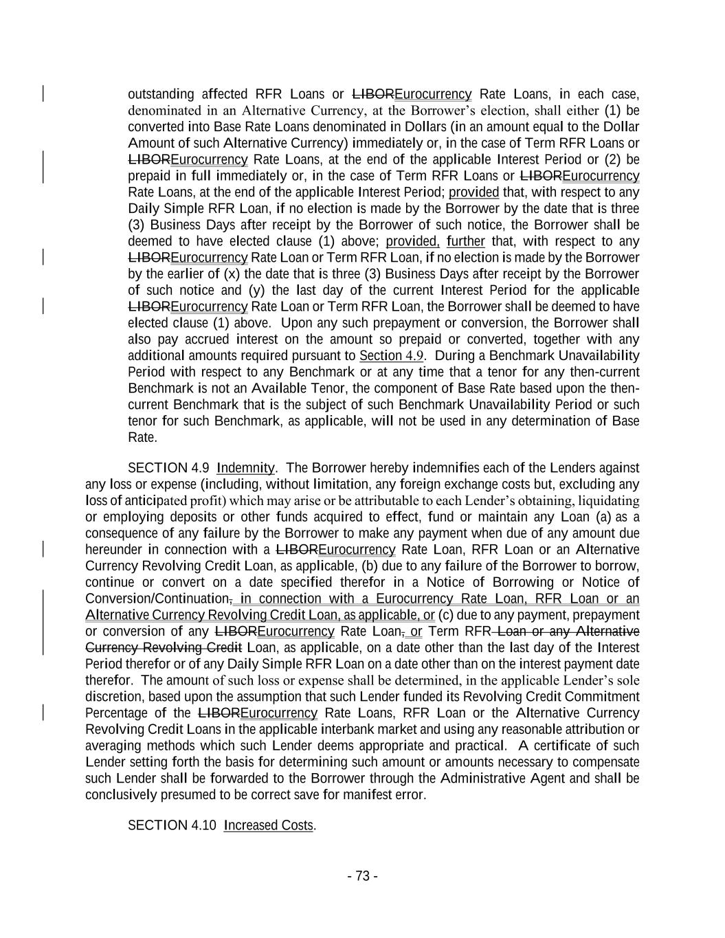 - 73 - outstanding affected RFR Loans or LIBOREurocurrency Rate Loans, in each case, denominated in an Alternative Currency, at the Borrower’s election, shall either (1) be converted into Base Rate Loans denominated in Dollars (in an amount equal to the Dollar Amount of such Alternative Currency) immediately or, in the case of Term RFR Loans or LIBOREurocurrency Rate Loans, at the end of the applicable Interest Period or (2) be prepaid in full immediately or, in the case of Term RFR Loans or LIBOREurocurrency Rate Loans, at the end of the applicable Interest Period; provided that, with respect to any Daily Simple RFR Loan, if no election is made by the Borrower by the date that is three (3) Business Days after receipt by the Borrower of such notice, the Borrower shall be deemed to have elected clause (1) above; provided, further that, with respect to any LIBOREurocurrency Rate Loan or Term RFR Loan, if no election is made by the Borrower by the earlier of (x) the date that is three (3) Business Days after receipt by the Borrower of such notice and (y) the last day of the current Interest Period for the applicable LIBOREurocurrency Rate Loan or Term RFR Loan, the Borrower shall be deemed to have elected clause (1) above. Upon any such prepayment or conversion, the Borrower shall also pay accrued interest on the amount so prepaid or converted, together with any additional amounts required pursuant to Section 4.9. During a Benchmark Unavailability Period with respect to any Benchmark or at any time that a tenor for any then-current Benchmark is not an Available Tenor, the component of Base Rate based upon the then- current Benchmark that is the subject of such Benchmark Unavailability Period or such tenor for such Benchmark, as applicable, will not be used in any determination of Base Rate. SECTION 4.9 Indemnity. The Borrower hereby indemnifies each of the Lenders against any loss or expense (including, without limitation, any foreign exchange costs but, excluding any loss of anticipated profit) which may arise or be attributable to each Lender’s obtaining, liquidating or employing deposits or other funds acquired to effect, fund or maintain any Loan (a) as a consequence of any failure by the Borrower to make any payment when due of any amount due hereunder in connection with a LIBOREurocurrency Rate Loan, RFR Loan or an Alternative Currency Revolving Credit Loan, as applicable, (b) due to any failure of the Borrower to borrow, continue or convert on a date specified therefor in a Notice of Borrowing or Notice of Conversion/Continuation, in connection with a Eurocurrency Rate Loan, RFR Loan or an Alternative Currency Revolving Credit Loan, as applicable, or (c) due to any payment, prepayment or conversion of any LIBOREurocurrency Rate Loan, or Term RFR Loan or any Alternative Currency Revolving Credit Loan, as applicable, on a date other than the last day of the Interest Period therefor or of any Daily Simple RFR Loan on a date other than on the interest payment date therefor. The amount of such loss or expense shall be determined, in the applicable Lender’s sole discretion, based upon the assumption that such Lender funded its Revolving Credit Commitment Percentage of the LIBOREurocurrency Rate Loans, RFR Loan or the Alternative Currency Revolving Credit Loans in the applicable interbank market and using any reasonable attribution or averaging methods which such Lender deems appropriate and practical. A certificate of such Lender setting forth the basis for determining such amount or amounts necessary to compensate such Lender shall be forwarded to the Borrower through the Administrative Agent and shall be conclusively presumed to be correct save for manifest error. SECTION 4.10 Increased Costs.