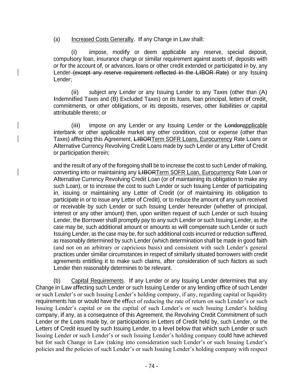 - 74 - (a) Increased Costs Generally. If any Change in Law shall: (i) impose, modify or deem applicable any reserve, special deposit, compulsory loan, insurance charge or similar requirement against assets of, deposits with or for the account of, or advances, loans or other credit extended or participated in by, any Lender (except any reserve requirement reflected in the LIBOR Rate) or any Issuing Lender; (ii) subject any Lender or any Issuing Lender to any Taxes (other than (A) Indemnified Taxes and (B) Excluded Taxes) on its loans, loan principal, letters of credit, commitments, or other obligations, or its deposits, reserves, other liabilities or capital attributable thereto; or (iii) impose on any Lender or any Issuing Lender or the Londonapplicable interbank or other applicable market any other condition, cost or expense (other than Taxes) affecting this Agreement, LIBORTerm SOFR Loans, Eurocurrency Rate Loans or Alternative Currency Revolving Credit Loans made by such Lender or any Letter of Credit or participation therein; and the result of any of the foregoing shall be to increase the cost to such Lender of making, converting into or maintaining any LIBORTerm SOFR Loan, Eurocurrency Rate Loan or Alternative Currency Revolving Credit Loan (or of maintaining its obligation to make any such Loan), or to increase the cost to such Lender or such Issuing Lender of participating in, issuing or maintaining any Letter of Credit (or of maintaining its obligation to participate in or to issue any Letter of Credit), or to reduce the amount of any sum received or receivable by such Lender or such Issuing Lender hereunder (whether of principal, interest or any other amount) then, upon written request of such Lender or such Issuing Lender, the Borrower shall promptly pay to any such Lender or such Issuing Lender, as the case may be, such additional amount or amounts as will compensate such Lender or such Issuing Lender, as the case may be, for such additional costs incurred or reduction suffered, as reasonably determined by such Lender (which determination shall be made in good faith (and not on an arbitrary or capricious basis) and consistent with such Lender’s general practices under similar circumstances in respect of similarly situated borrowers with credit agreements entitling it to make such claims, after consideration of such factors as such Lender then reasonably determines to be relevant. (b) Capital Requirements. If any Lender or any Issuing Lender determines that any Change in Law affecting such Lender or such Issuing Lender or any lending office of such Lender or such Lender’s or such Issuing Lender’s holding company, if any, regarding capital or liquidity requirements has or would have the effect of reducing the rate of return on such Lender’s or such Issuing Lender’s capital or on the capital of such Lender’s or such Issuing Lender’s holding company, if any, as a consequence of this Agreement, the Revolving Credit Commitment of such Lender or the Loans made by, or participations in Letters of Credit held by, such Lender, or the Letters of Credit issued by such Issuing Lender, to a level below that which such Lender or such Issuing Lender or such Lender’s or such Issuing Lender’s holding company could have achieved but for such Change in Law (taking into consideration such Lender’s or such Issuing Lender’s policies and the policies of such Lender’s or such Issuing Lender’s holding company with respect
