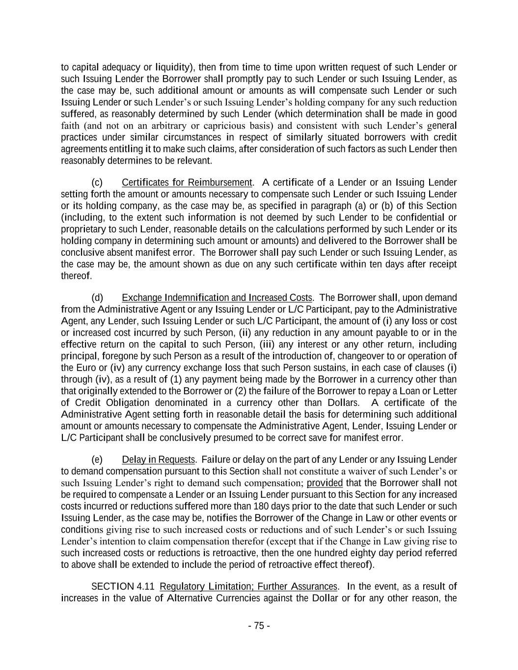 - 75 - to capital adequacy or liquidity), then from time to time upon written request of such Lender or such Issuing Lender the Borrower shall promptly pay to such Lender or such Issuing Lender, as the case may be, such additional amount or amounts as will compensate such Lender or such Issuing Lender or such Lender’s or such Issuing Lender’s holding company for any such reduction suffered, as reasonably determined by such Lender (which determination shall be made in good faith (and not on an arbitrary or capricious basis) and consistent with such Lender’s general practices under similar circumstances in respect of similarly situated borrowers with credit agreements entitling it to make such claims, after consideration of such factors as such Lender then reasonably determines to be relevant. (c) Certificates for Reimbursement. A certificate of a Lender or an Issuing Lender setting forth the amount or amounts necessary to compensate such Lender or such Issuing Lender or its holding company, as the case may be, as specified in paragraph (a) or (b) of this Section (including, to the extent such information is not deemed by such Lender to be confidential or proprietary to such Lender, reasonable details on the calculations performed by such Lender or its holding company in determining such amount or amounts) and delivered to the Borrower shall be conclusive absent manifest error. The Borrower shall pay such Lender or such Issuing Lender, as the case may be, the amount shown as due on any such certificate within ten days after receipt thereof. (d) Exchange Indemnification and Increased Costs. The Borrower shall, upon demand from the Administrative Agent or any Issuing Lender or L/C Participant, pay to the Administrative Agent, any Lender, such Issuing Lender or such L/C Participant, the amount of (i) any loss or cost or increased cost incurred by such Person, (ii) any reduction in any amount payable to or in the effective return on the capital to such Person, (iii) any interest or any other return, including principal, foregone by such Person as a result of the introduction of, changeover to or operation of the Euro or (iv) any currency exchange loss that such Person sustains, in each case of clauses (i) through (iv), as a result of (1) any payment being made by the Borrower in a currency other than that originally extended to the Borrower or (2) the failure of the Borrower to repay a Loan or Letter of Credit Obligation denominated in a currency other than Dollars. A certificate of the Administrative Agent setting forth in reasonable detail the basis for determining such additional amount or amounts necessary to compensate the Administrative Agent, Lender, Issuing Lender or L/C Participant shall be conclusively presumed to be correct save for manifest error. (e) Delay in Requests. Failure or delay on the part of any Lender or any Issuing Lender to demand compensation pursuant to this Section shall not constitute a waiver of such Lender’s or such Issuing Lender’s right to demand such compensation; provided that the Borrower shall not be required to compensate a Lender or an Issuing Lender pursuant to this Section for any increased costs incurred or reductions suffered more than 180 days prior to the date that such Lender or such Issuing Lender, as the case may be, notifies the Borrower of the Change in Law or other events or conditions giving rise to such increased costs or reductions and of such Lender’s or such Issuing Lender’s intention to claim compensation therefor (except that if the Change in Law giving rise to such increased costs or reductions is retroactive, then the one hundred eighty day period referred to above shall be extended to include the period of retroactive effect thereof). SECTION 4.11 Regulatory Limitation; Further Assurances. In the event, as a result of increases in the value of Alternative Currencies against the Dollar or for any other reason, the