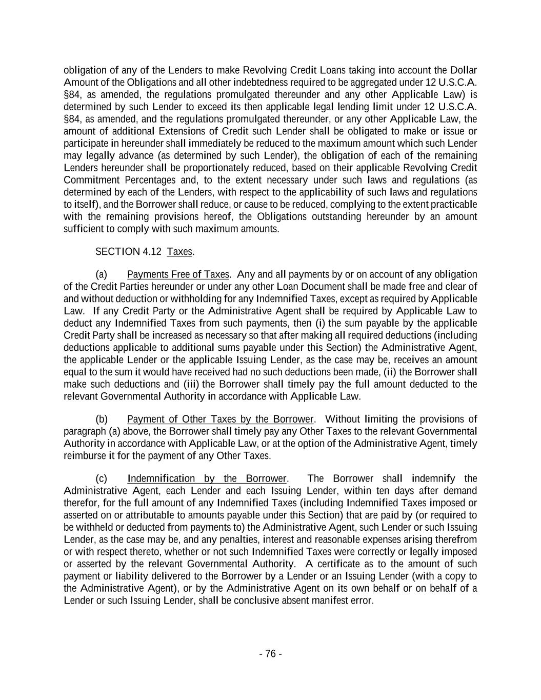 - 76 - obligation of any of the Lenders to make Revolving Credit Loans taking into account the Dollar Amount of the Obligations and all other indebtedness required to be aggregated under 12 U.S.C.A. §84, as amended, the regulations promulgated thereunder and any other Applicable Law) is determined by such Lender to exceed its then applicable legal lending limit under 12 U.S.C.A. §84, as amended, and the regulations promulgated thereunder, or any other Applicable Law, the amount of additional Extensions of Credit such Lender shall be obligated to make or issue or participate in hereunder shall immediately be reduced to the maximum amount which such Lender may legally advance (as determined by such Lender), the obligation of each of the remaining Lenders hereunder shall be proportionately reduced, based on their applicable Revolving Credit Commitment Percentages and, to the extent necessary under such laws and regulations (as determined by each of the Lenders, with respect to the applicability of such laws and regulations to itself), and the Borrower shall reduce, or cause to be reduced, complying to the extent practicable with the remaining provisions hereof, the Obligations outstanding hereunder by an amount sufficient to comply with such maximum amounts. SECTION 4.12 Taxes. (a) Payments Free of Taxes. Any and all payments by or on account of any obligation of the Credit Parties hereunder or under any other Loan Document shall be made free and clear of and without deduction or withholding for any Indemnified Taxes, except as required by Applicable Law. If any Credit Party or the Administrative Agent shall be required by Applicable Law to deduct any Indemnified Taxes from such payments, then (i) the sum payable by the applicable Credit Party shall be increased as necessary so that after making all required deductions (including deductions applicable to additional sums payable under this Section) the Administrative Agent, the applicable Lender or the applicable Issuing Lender, as the case may be, receives an amount equal to the sum it would have received had no such deductions been made, (ii) the Borrower shall make such deductions and (iii) the Borrower shall timely pay the full amount deducted to the relevant Governmental Authority in accordance with Applicable Law. (b) Payment of Other Taxes by the Borrower. Without limiting the provisions of paragraph (a) above, the Borrower shall timely pay any Other Taxes to the relevant Governmental Authority in accordance with Applicable Law, or at the option of the Administrative Agent, timely reimburse it for the payment of any Other Taxes. (c) Indemnification by the Borrower. The Borrower shall indemnify the Administrative Agent, each Lender and each Issuing Lender, within ten days after demand therefor, for the full amount of any Indemnified Taxes (including Indemnified Taxes imposed or asserted on or attributable to amounts payable under this Section) that are paid by (or required to be withheld or deducted from payments to) the Administrative Agent, such Lender or such Issuing Lender, as the case may be, and any penalties, interest and reasonable expenses arising therefrom or with respect thereto, whether or not such Indemnified Taxes were correctly or legally imposed or asserted by the relevant Governmental Authority. A certificate as to the amount of such payment or liability delivered to the Borrower by a Lender or an Issuing Lender (with a copy to the Administrative Agent), or by the Administrative Agent on its own behalf or on behalf of a Lender or such Issuing Lender, shall be conclusive absent manifest error.