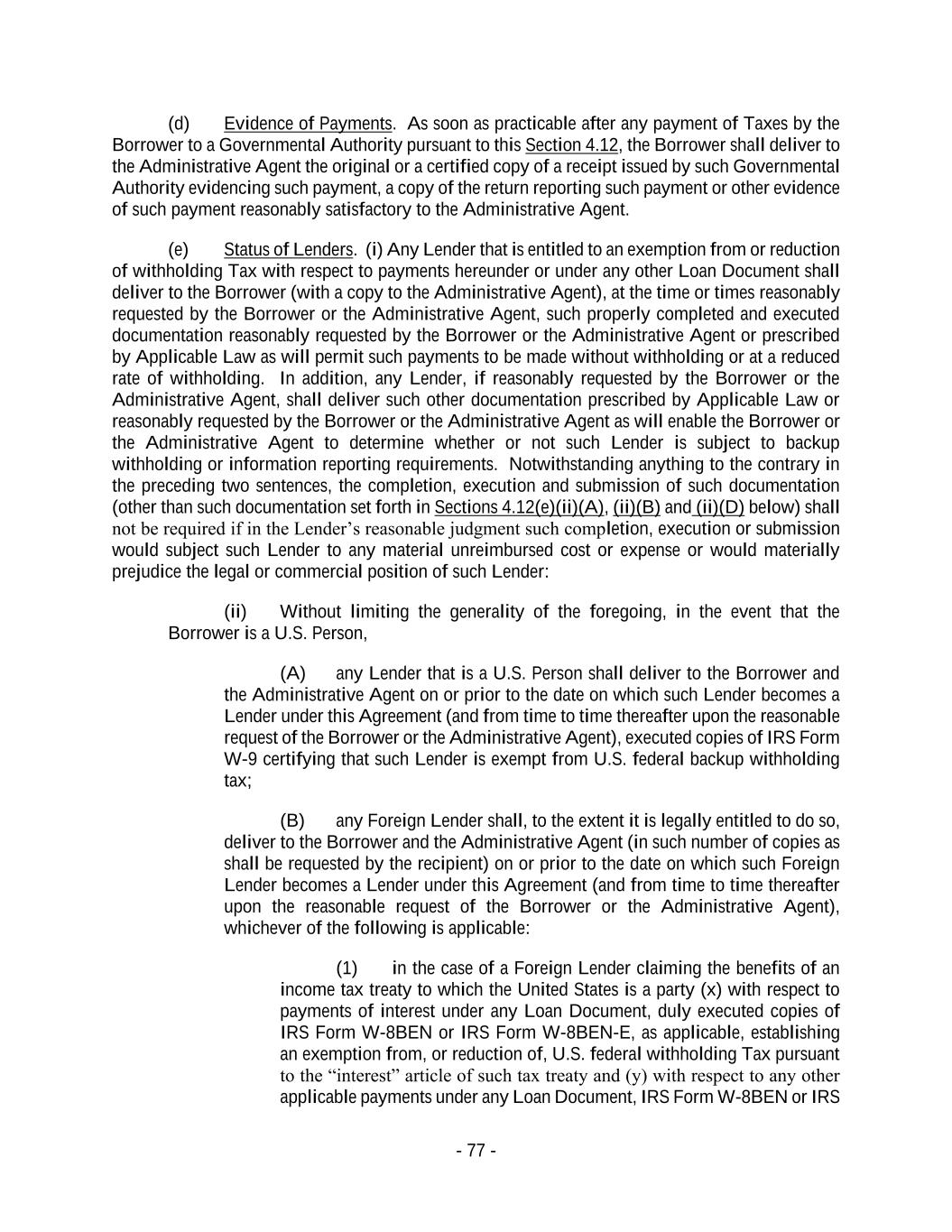 - 77 - (d) Evidence of Payments. As soon as practicable after any payment of Taxes by the Borrower to a Governmental Authority pursuant to this Section 4.12, the Borrower shall deliver to the Administrative Agent the original or a certified copy of a receipt issued by such Governmental Authority evidencing such payment, a copy of the return reporting such payment or other evidence of such payment reasonably satisfactory to the Administrative Agent. (e) Status of Lenders. (i) Any Lender that is entitled to an exemption from or reduction of withholding Tax with respect to payments hereunder or under any other Loan Document shall deliver to the Borrower (with a copy to the Administrative Agent), at the time or times reasonably requested by the Borrower or the Administrative Agent, such properly completed and executed documentation reasonably requested by the Borrower or the Administrative Agent or prescribed by Applicable Law as will permit such payments to be made without withholding or at a reduced rate of withholding. In addition, any Lender, if reasonably requested by the Borrower or the Administrative Agent, shall deliver such other documentation prescribed by Applicable Law or reasonably requested by the Borrower or the Administrative Agent as will enable the Borrower or the Administrative Agent to determine whether or not such Lender is subject to backup withholding or information reporting requirements. Notwithstanding anything to the contrary in the preceding two sentences, the completion, execution and submission of such documentation (other than such documentation set forth in Sections 4.12(e)(ii)(A), (ii)(B) and (ii)(D) below) shall not be required if in the Lender’s reasonable judgment such completion, execution or submission would subject such Lender to any material unreimbursed cost or expense or would materially prejudice the legal or commercial position of such Lender: (ii) Without limiting the generality of the foregoing, in the event that the Borrower is a U.S. Person, (A) any Lender that is a U.S. Person shall deliver to the Borrower and the Administrative Agent on or prior to the date on which such Lender becomes a Lender under this Agreement (and from time to time thereafter upon the reasonable request of the Borrower or the Administrative Agent), executed copies of IRS Form W-9 certifying that such Lender is exempt from U.S. federal backup withholding tax; (B) any Foreign Lender shall, to the extent it is legally entitled to do so, deliver to the Borrower and the Administrative Agent (in such number of copies as shall be requested by the recipient) on or prior to the date on which such Foreign Lender becomes a Lender under this Agreement (and from time to time thereafter upon the reasonable request of the Borrower or the Administrative Agent), whichever of the following is applicable: (1) in the case of a Foreign Lender claiming the benefits of an income tax treaty to which the United States is a party (x) with respect to payments of interest under any Loan Document, duly executed copies of IRS Form W-8BEN or IRS Form W-8BEN-E, as applicable, establishing an exemption from, or reduction of, U.S. federal withholding Tax pursuant to the “interest” article of such tax treaty and (y) with respect to any other applicable payments under any Loan Document, IRS Form W-8BEN or IRS
