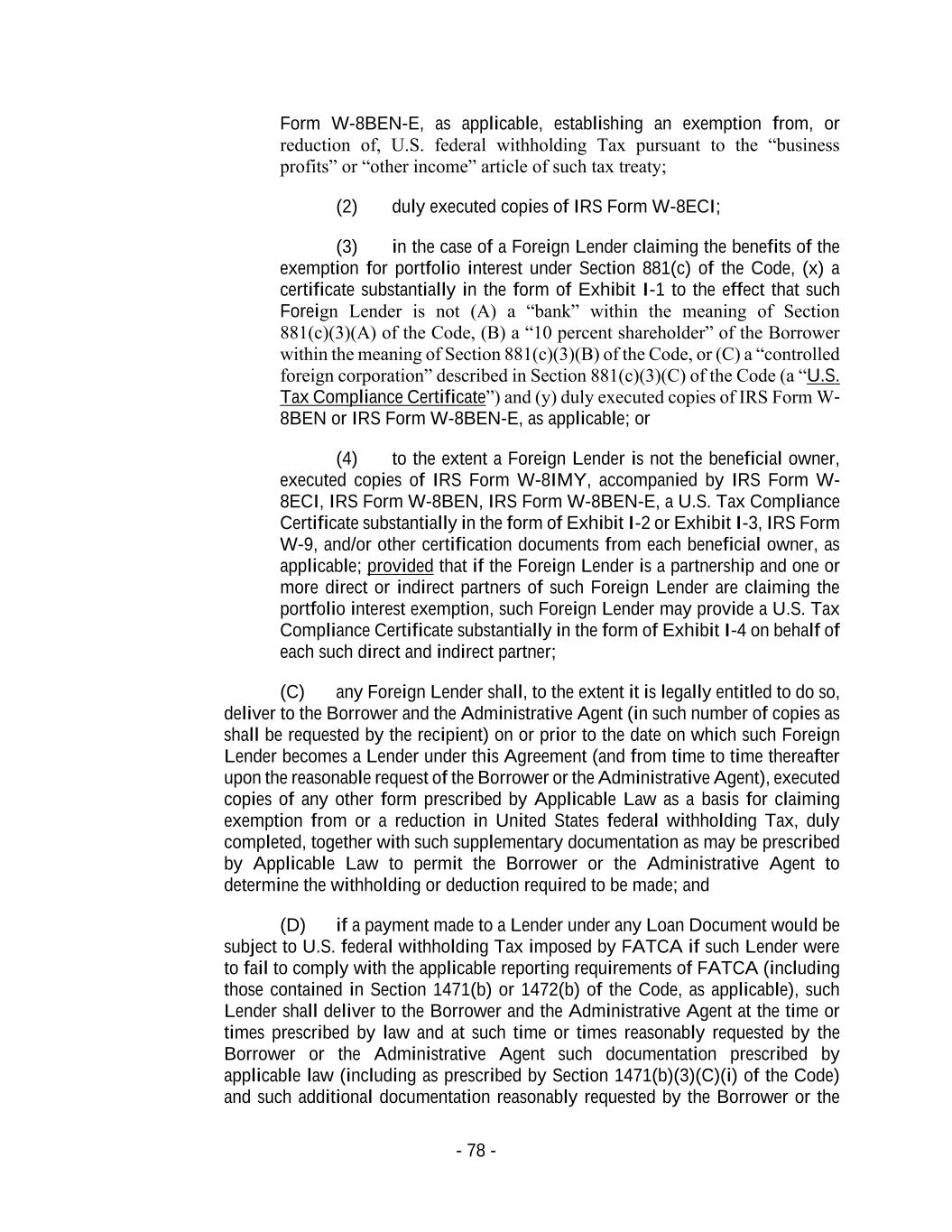 - 78 - Form W-8BEN-E, as applicable, establishing an exemption from, or reduction of, U.S. federal withholding Tax pursuant to the “business profits” or “other income” article of such tax treaty; (2) duly executed copies of IRS Form W-8ECI; (3) in the case of a Foreign Lender claiming the benefits of the exemption for portfolio interest under Section 881(c) of the Code, (x) a certificate substantially in the form of Exhibit I-1 to the effect that such Foreign Lender is not (A) a “bank” within the meaning of Section 881(c)(3)(A) of the Code, (B) a “10 percent shareholder” of the Borrower within the meaning of Section 881(c)(3)(B) of the Code, or (C) a “controlled foreign corporation” described in Section 881(c)(3)(C) of the Code (a “U.S. Tax Compliance Certificate”) and (y) duly executed copies of IRS Form W- 8BEN or IRS Form W-8BEN-E, as applicable; or (4) to the extent a Foreign Lender is not the beneficial owner, executed copies of IRS Form W-8IMY, accompanied by IRS Form W- 8ECI, IRS Form W-8BEN, IRS Form W-8BEN-E, a U.S. Tax Compliance Certificate substantially in the form of Exhibit I-2 or Exhibit I-3, IRS Form W-9, and/or other certification documents from each beneficial owner, as applicable; provided that if the Foreign Lender is a partnership and one or more direct or indirect partners of such Foreign Lender are claiming the portfolio interest exemption, such Foreign Lender may provide a U.S. Tax Compliance Certificate substantially in the form of Exhibit I-4 on behalf of each such direct and indirect partner; (C) any Foreign Lender shall, to the extent it is legally entitled to do so, deliver to the Borrower and the Administrative Agent (in such number of copies as shall be requested by the recipient) on or prior to the date on which such Foreign Lender becomes a Lender under this Agreement (and from time to time thereafter upon the reasonable request of the Borrower or the Administrative Agent), executed copies of any other form prescribed by Applicable Law as a basis for claiming exemption from or a reduction in United States federal withholding Tax, duly completed, together with such supplementary documentation as may be prescribed by Applicable Law to permit the Borrower or the Administrative Agent to determine the withholding or deduction required to be made; and (D) if a payment made to a Lender under any Loan Document would be subject to U.S. federal withholding Tax imposed by FATCA if such Lender were to fail to comply with the applicable reporting requirements of FATCA (including those contained in Section 1471(b) or 1472(b) of the Code, as applicable), such Lender shall deliver to the Borrower and the Administrative Agent at the time or times prescribed by law and at such time or times reasonably requested by the Borrower or the Administrative Agent such documentation prescribed by applicable law (including as prescribed by Section 1471(b)(3)(C)(i) of the Code) and such additional documentation reasonably requested by the Borrower or the