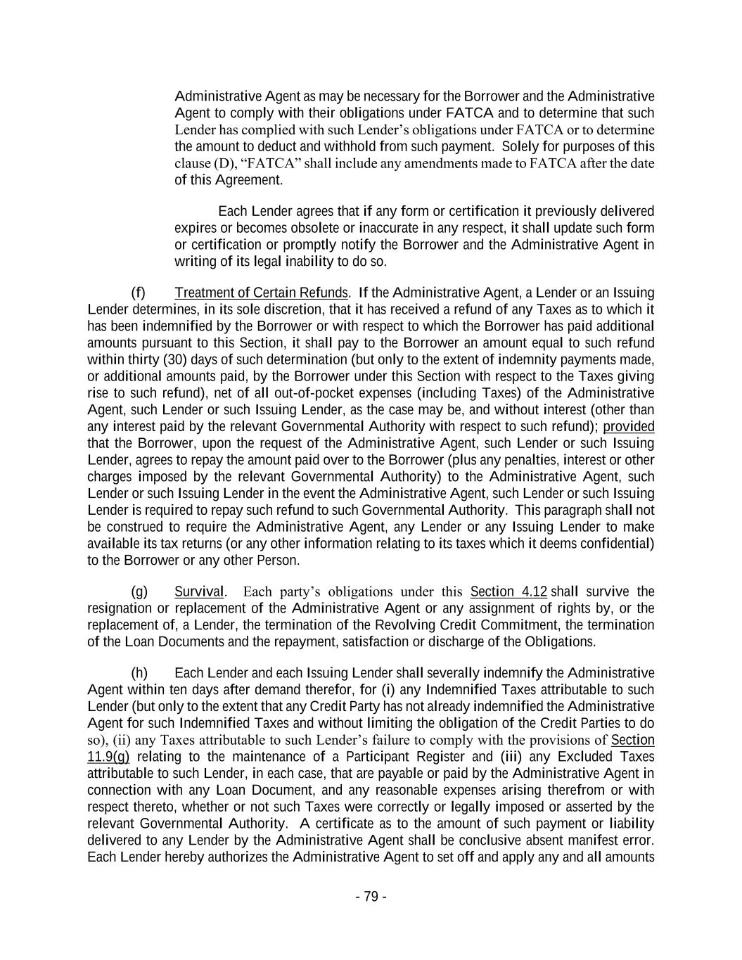 - 79 - Administrative Agent as may be necessary for the Borrower and the Administrative Agent to comply with their obligations under FATCA and to determine that such Lender has complied with such Lender’s obligations under FATCA or to determine the amount to deduct and withhold from such payment. Solely for purposes of this clause (D), “FATCA” shall include any amendments made to FATCA after the date of this Agreement. Each Lender agrees that if any form or certification it previously delivered expires or becomes obsolete or inaccurate in any respect, it shall update such form or certification or promptly notify the Borrower and the Administrative Agent in writing of its legal inability to do so. (f) Treatment of Certain Refunds. If the Administrative Agent, a Lender or an Issuing Lender determines, in its sole discretion, that it has received a refund of any Taxes as to which it has been indemnified by the Borrower or with respect to which the Borrower has paid additional amounts pursuant to this Section, it shall pay to the Borrower an amount equal to such refund within thirty (30) days of such determination (but only to the extent of indemnity payments made, or additional amounts paid, by the Borrower under this Section with respect to the Taxes giving rise to such refund), net of all out-of-pocket expenses (including Taxes) of the Administrative Agent, such Lender or such Issuing Lender, as the case may be, and without interest (other than any interest paid by the relevant Governmental Authority with respect to such refund); provided that the Borrower, upon the request of the Administrative Agent, such Lender or such Issuing Lender, agrees to repay the amount paid over to the Borrower (plus any penalties, interest or other charges imposed by the relevant Governmental Authority) to the Administrative Agent, such Lender or such Issuing Lender in the event the Administrative Agent, such Lender or such Issuing Lender is required to repay such refund to such Governmental Authority. This paragraph shall not be construed to require the Administrative Agent, any Lender or any Issuing Lender to make available its tax returns (or any other information relating to its taxes which it deems confidential) to the Borrower or any other Person. (g) Survival. Each party’s obligations under this Section 4.12 shall survive the resignation or replacement of the Administrative Agent or any assignment of rights by, or the replacement of, a Lender, the termination of the Revolving Credit Commitment, the termination of the Loan Documents and the repayment, satisfaction or discharge of the Obligations. (h) Each Lender and each Issuing Lender shall severally indemnify the Administrative Agent within ten days after demand therefor, for (i) any Indemnified Taxes attributable to such Lender (but only to the extent that any Credit Party has not already indemnified the Administrative Agent for such Indemnified Taxes and without limiting the obligation of the Credit Parties to do so), (ii) any Taxes attributable to such Lender’s failure to comply with the provisions of Section 11.9(g) relating to the maintenance of a Participant Register and (iii) any Excluded Taxes attributable to such Lender, in each case, that are payable or paid by the Administrative Agent in connection with any Loan Document, and any reasonable expenses arising therefrom or with respect thereto, whether or not such Taxes were correctly or legally imposed or asserted by the relevant Governmental Authority. A certificate as to the amount of such payment or liability delivered to any Lender by the Administrative Agent shall be conclusive absent manifest error. Each Lender hereby authorizes the Administrative Agent to set off and apply any and all amounts