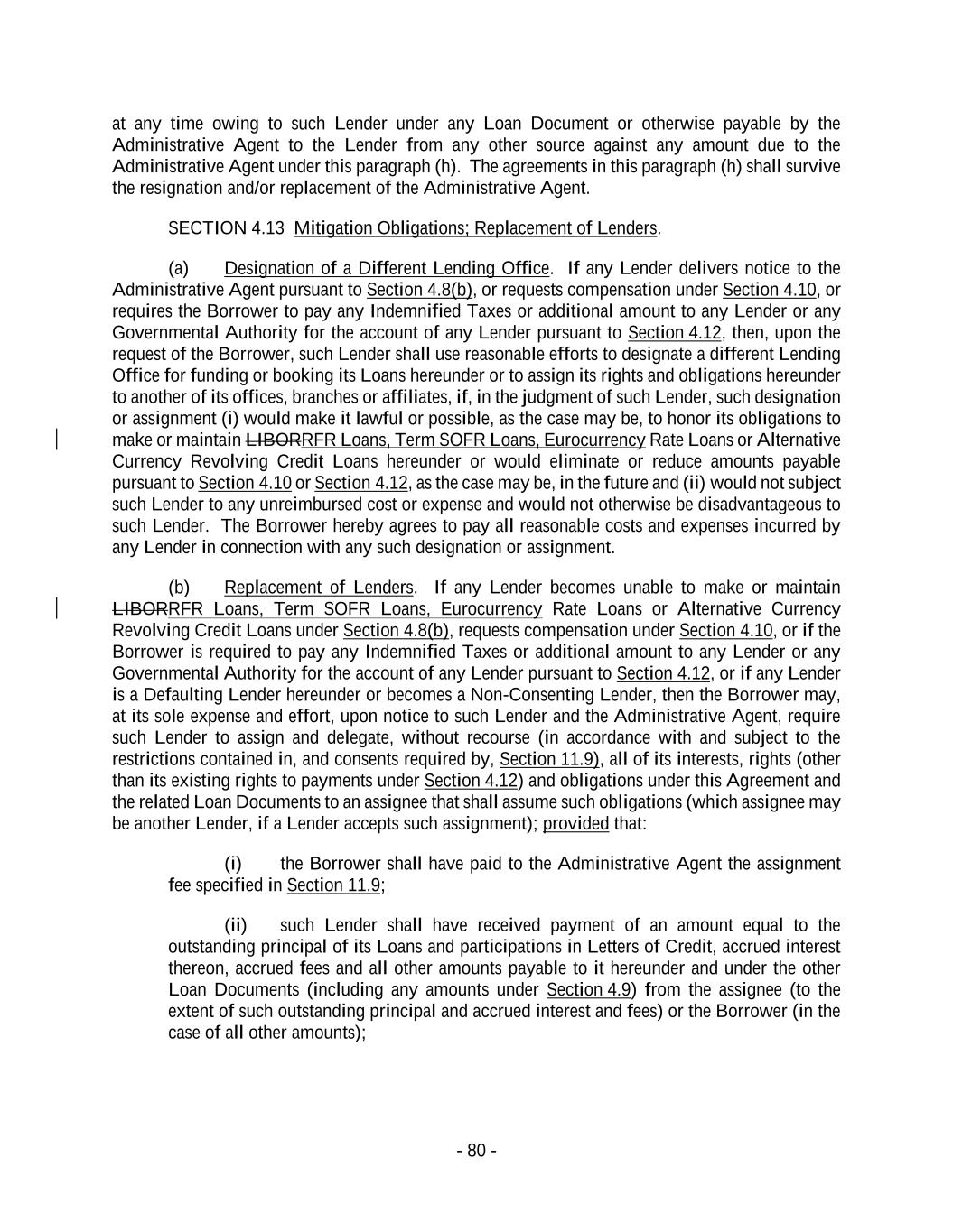 - 80 - at any time owing to such Lender under any Loan Document or otherwise payable by the Administrative Agent to the Lender from any other source against any amount due to the Administrative Agent under this paragraph (h). The agreements in this paragraph (h) shall survive the resignation and/or replacement of the Administrative Agent. SECTION 4.13 Mitigation Obligations; Replacement of Lenders. (a) Designation of a Different Lending Office. If any Lender delivers notice to the Administrative Agent pursuant to Section 4.8(b), or requests compensation under Section 4.10, or requires the Borrower to pay any Indemnified Taxes or additional amount to any Lender or any Governmental Authority for the account of any Lender pursuant to Section 4.12, then, upon the request of the Borrower, such Lender shall use reasonable efforts to designate a different Lending Office for funding or booking its Loans hereunder or to assign its rights and obligations hereunder to another of its offices, branches or affiliates, if, in the judgment of such Lender, such designation or assignment (i) would make it lawful or possible, as the case may be, to honor its obligations to make or maintain LIBORRFR Loans, Term SOFR Loans, Eurocurrency Rate Loans or Alternative Currency Revolving Credit Loans hereunder or would eliminate or reduce amounts payable pursuant to Section 4.10 or Section 4.12, as the case may be, in the future and (ii) would not subject such Lender to any unreimbursed cost or expense and would not otherwise be disadvantageous to such Lender. The Borrower hereby agrees to pay all reasonable costs and expenses incurred by any Lender in connection with any such designation or assignment. (b) Replacement of Lenders. If any Lender becomes unable to make or maintain LIBORRFR Loans, Term SOFR Loans, Eurocurrency Rate Loans or Alternative Currency Revolving Credit Loans under Section 4.8(b), requests compensation under Section 4.10, or if the Borrower is required to pay any Indemnified Taxes or additional amount to any Lender or any Governmental Authority for the account of any Lender pursuant to Section 4.12, or if any Lender is a Defaulting Lender hereunder or becomes a Non-Consenting Lender, then the Borrower may, at its sole expense and effort, upon notice to such Lender and the Administrative Agent, require such Lender to assign and delegate, without recourse (in accordance with and subject to the restrictions contained in, and consents required by, Section 11.9), all of its interests, rights (other than its existing rights to payments under Section 4.12) and obligations under this Agreement and the related Loan Documents to an assignee that shall assume such obligations (which assignee may be another Lender, if a Lender accepts such assignment); provided that: (i) the Borrower shall have paid to the Administrative Agent the assignment fee specified in Section 11.9; (ii) such Lender shall have received payment of an amount equal to the outstanding principal of its Loans and participations in Letters of Credit, accrued interest thereon, accrued fees and all other amounts payable to it hereunder and under the other Loan Documents (including any amounts under Section 4.9) from the assignee (to the extent of such outstanding principal and accrued interest and fees) or the Borrower (in the case of all other amounts);