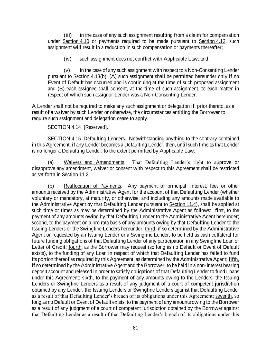 - 81 - (iii) in the case of any such assignment resulting from a claim for compensation under Section 4.10 or payments required to be made pursuant to Section 4.12, such assignment will result in a reduction in such compensation or payments thereafter; (iv) such assignment does not conflict with Applicable Law; and (v) in the case of any such assignment with respect to a Non-Consenting Lender pursuant to Section 4.13(b), (A) such assignment shall be permitted hereunder only if no Event of Default has occurred and is continuing at the time of such proposed assignment and (B) each assignee shall consent, at the time of such assignment, to each matter in respect of which such assignor Lender was a Non-Consenting Lender. A Lender shall not be required to make any such assignment or delegation if, prior thereto, as a result of a waiver by such Lender or otherwise, the circumstances entitling the Borrower to require such assignment and delegation cease to apply. SECTION 4.14 [Reserved]. SECTION 4.15 Defaulting Lenders. Notwithstanding anything to the contrary contained in this Agreement, if any Lender becomes a Defaulting Lender, then, until such time as that Lender is no longer a Defaulting Lender, to the extent permitted by Applicable Law: (a) Waivers and Amendments. That Defaulting Lender’s right to approve or disapprove any amendment, waiver or consent with respect to this Agreement shall be restricted as set forth in Section 11.2. (b) Reallocation of Payments. Any payment of principal, interest, fees or other amounts received by the Administrative Agent for the account of that Defaulting Lender (whether voluntary or mandatory, at maturity, or otherwise, and including any amounts made available to the Administrative Agent by that Defaulting Lender pursuant to Section 11.4), shall be applied at such time or times as may be determined by the Administrative Agent as follows: first, to the payment of any amounts owing by that Defaulting Lender to the Administrative Agent hereunder; second, to the payment on a pro rata basis of any amounts owing by that Defaulting Lender to the Issuing Lenders or the Swingline Lenders hereunder; third, if so determined by the Administrative Agent or requested by an Issuing Lender or a Swingline Lender, to be held as cash collateral for future funding obligations of that Defaulting Lender of any participation in any Swingline Loan or Letter of Credit; fourth, as the Borrower may request (so long as no Default or Event of Default exists), to the funding of any Loan in respect of which that Defaulting Lender has failed to fund its portion thereof as required by this Agreement, as determined by the Administrative Agent; fifth, if so determined by the Administrative Agent and the Borrower, to be held in a non-interest bearing deposit account and released in order to satisfy obligations of that Defaulting Lender to fund Loans under this Agreement; sixth, to the payment of any amounts owing to the Lenders, the Issuing Lenders or Swingline Lenders as a result of any judgment of a court of competent jurisdiction obtained by any Lender, the Issuing Lenders or Swingline Lenders against that Defaulting Lender as a result of that Defaulting Lender’s breach of its obligations under this Agreement; seventh, so long as no Default or Event of Default exists, to the payment of any amounts owing to the Borrower as a result of any judgment of a court of competent jurisdiction obtained by the Borrower against that Defaulting Lender as a result of that Defaulting Lender’s breach of its obligations under this