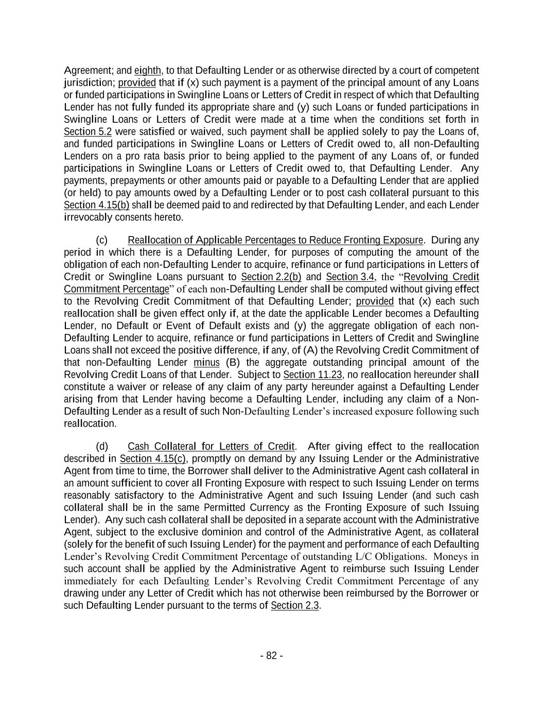 - 82 - Agreement; and eighth, to that Defaulting Lender or as otherwise directed by a court of competent jurisdiction; provided that if (x) such payment is a payment of the principal amount of any Loans or funded participations in Swingline Loans or Letters of Credit in respect of which that Defaulting Lender has not fully funded its appropriate share and (y) such Loans or funded participations in Swingline Loans or Letters of Credit were made at a time when the conditions set forth in Section 5.2 were satisfied or waived, such payment shall be applied solely to pay the Loans of, and funded participations in Swingline Loans or Letters of Credit owed to, all non-Defaulting Lenders on a pro rata basis prior to being applied to the payment of any Loans of, or funded participations in Swingline Loans or Letters of Credit owed to, that Defaulting Lender. Any payments, prepayments or other amounts paid or payable to a Defaulting Lender that are applied (or held) to pay amounts owed by a Defaulting Lender or to post cash collateral pursuant to this Section 4.15(b) shall be deemed paid to and redirected by that Defaulting Lender, and each Lender irrevocably consents hereto. (c) Reallocation of Applicable Percentages to Reduce Fronting Exposure. During any period in which there is a Defaulting Lender, for purposes of computing the amount of the obligation of each non-Defaulting Lender to acquire, refinance or fund participations in Letters of Credit or Swingline Loans pursuant to Section 2.2(b) and Section 3.4, the “Revolving Credit Commitment Percentage” of each non-Defaulting Lender shall be computed without giving effect to the Revolving Credit Commitment of that Defaulting Lender; provided that (x) each such reallocation shall be given effect only if, at the date the applicable Lender becomes a Defaulting Lender, no Default or Event of Default exists and (y) the aggregate obligation of each non- Defaulting Lender to acquire, refinance or fund participations in Letters of Credit and Swingline Loans shall not exceed the positive difference, if any, of (A) the Revolving Credit Commitment of that non-Defaulting Lender minus (B) the aggregate outstanding principal amount of the Revolving Credit Loans of that Lender. Subject to Section 11.23, no reallocation hereunder shall constitute a waiver or release of any claim of any party hereunder against a Defaulting Lender arising from that Lender having become a Defaulting Lender, including any claim of a Non- Defaulting Lender as a result of such Non-Defaulting Lender’s increased exposure following such reallocation. (d) Cash Collateral for Letters of Credit. After giving effect to the reallocation described in Section 4.15(c), promptly on demand by any Issuing Lender or the Administrative Agent from time to time, the Borrower shall deliver to the Administrative Agent cash collateral in an amount sufficient to cover all Fronting Exposure with respect to such Issuing Lender on terms reasonably satisfactory to the Administrative Agent and such Issuing Lender (and such cash collateral shall be in the same Permitted Currency as the Fronting Exposure of such Issuing Lender). Any such cash collateral shall be deposited in a separate account with the Administrative Agent, subject to the exclusive dominion and control of the Administrative Agent, as collateral (solely for the benefit of such Issuing Lender) for the payment and performance of each Defaulting Lender’s Revolving Credit Commitment Percentage of outstanding L/C Obligations. Moneys in such account shall be applied by the Administrative Agent to reimburse such Issuing Lender immediately for each Defaulting Lender’s Revolving Credit Commitment Percentage of any drawing under any Letter of Credit which has not otherwise been reimbursed by the Borrower or such Defaulting Lender pursuant to the terms of Section 2.3.