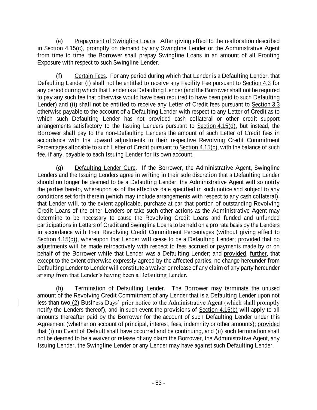- 83 - (e) Prepayment of Swingline Loans. After giving effect to the reallocation described in Section 4.15(c), promptly on demand by any Swingline Lender or the Administrative Agent from time to time, the Borrower shall prepay Swingline Loans in an amount of all Fronting Exposure with respect to such Swingline Lender. (f) Certain Fees. For any period during which that Lender is a Defaulting Lender, that Defaulting Lender (i) shall not be entitled to receive any Facility Fee pursuant to Section 4.3 for any period during which that Lender is a Defaulting Lender (and the Borrower shall not be required to pay any such fee that otherwise would have been required to have been paid to such Defaulting Lender) and (ii) shall not be entitled to receive any Letter of Credit fees pursuant to Section 3.3 otherwise payable to the account of a Defaulting Lender with respect to any Letter of Credit as to which such Defaulting Lender has not provided cash collateral or other credit support arrangements satisfactory to the Issuing Lenders pursuant to Section 4.15(d), but instead, the Borrower shall pay to the non-Defaulting Lenders the amount of such Letter of Credit fees in accordance with the upward adjustments in their respective Revolving Credit Commitment Percentages allocable to such Letter of Credit pursuant to Section 4.15(c), with the balance of such fee, if any, payable to each Issuing Lender for its own account. (g) Defaulting Lender Cure. If the Borrower, the Administrative Agent, Swingline Lenders and the Issuing Lenders agree in writing in their sole discretion that a Defaulting Lender should no longer be deemed to be a Defaulting Lender, the Administrative Agent will so notify the parties hereto, whereupon as of the effective date specified in such notice and subject to any conditions set forth therein (which may include arrangements with respect to any cash collateral), that Lender will, to the extent applicable, purchase at par that portion of outstanding Revolving Credit Loans of the other Lenders or take such other actions as the Administrative Agent may determine to be necessary to cause the Revolving Credit Loans and funded and unfunded participations in Letters of Credit and Swingline Loans to be held on a pro rata basis by the Lenders in accordance with their Revolving Credit Commitment Percentages (without giving effect to Section 4.15(c)), whereupon that Lender will cease to be a Defaulting Lender; provided that no adjustments will be made retroactively with respect to fees accrued or payments made by or on behalf of the Borrower while that Lender was a Defaulting Lender; and provided, further, that except to the extent otherwise expressly agreed by the affected parties, no change hereunder from Defaulting Lender to Lender will constitute a waiver or release of any claim of any party hereunder arising from that Lender’s having been a Defaulting Lender. (h) Termination of Defaulting Lender. The Borrower may terminate the unused amount of the Revolving Credit Commitment of any Lender that is a Defaulting Lender upon not less than two (2) Business Days’ prior notice to the Administrative Agent (which shall promptly notify the Lenders thereof), and in such event the provisions of Section 4.15(b) will apply to all amounts thereafter paid by the Borrower for the account of such Defaulting Lender under this Agreement (whether on account of principal, interest, fees, indemnity or other amounts); provided that (i) no Event of Default shall have occurred and be continuing, and (ii) such termination shall not be deemed to be a waiver or release of any claim the Borrower, the Administrative Agent, any Issuing Lender, the Swingline Lender or any Lender may have against such Defaulting Lender.
