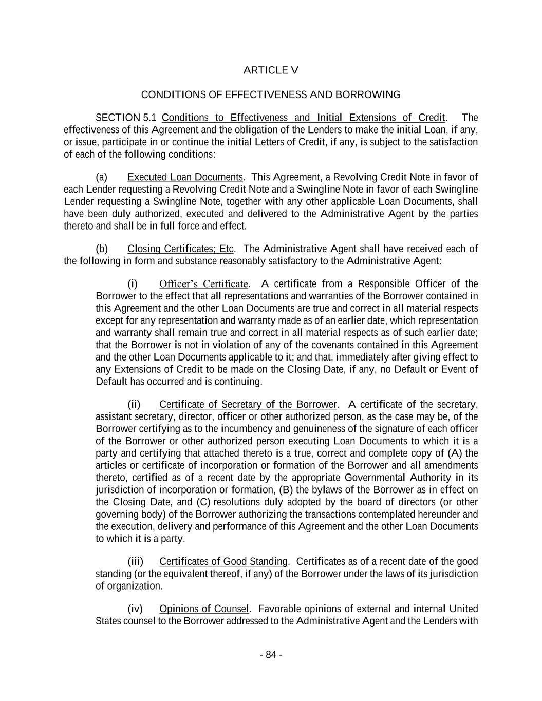 - 84 - ARTICLE V CONDITIONS OF EFFECTIVENESS AND BORROWING SECTION 5.1 Conditions to Effectiveness and Initial Extensions of Credit. The effectiveness of this Agreement and the obligation of the Lenders to make the initial Loan, if any, or issue, participate in or continue the initial Letters of Credit, if any, is subject to the satisfaction of each of the following conditions: (a) Executed Loan Documents. This Agreement, a Revolving Credit Note in favor of each Lender requesting a Revolving Credit Note and a Swingline Note in favor of each Swingline Lender requesting a Swingline Note, together with any other applicable Loan Documents, shall have been duly authorized, executed and delivered to the Administrative Agent by the parties thereto and shall be in full force and effect. (b) Closing Certificates; Etc. The Administrative Agent shall have received each of the following in form and substance reasonably satisfactory to the Administrative Agent: (i) Officer’s Certificate. A certificate from a Responsible Officer of the Borrower to the effect that all representations and warranties of the Borrower contained in this Agreement and the other Loan Documents are true and correct in all material respects except for any representation and warranty made as of an earlier date, which representation and warranty shall remain true and correct in all material respects as of such earlier date; that the Borrower is not in violation of any of the covenants contained in this Agreement and the other Loan Documents applicable to it; and that, immediately after giving effect to any Extensions of Credit to be made on the Closing Date, if any, no Default or Event of Default has occurred and is continuing. (ii) Certificate of Secretary of the Borrower. A certificate of the secretary, assistant secretary, director, officer or other authorized person, as the case may be, of the Borrower certifying as to the incumbency and genuineness of the signature of each officer of the Borrower or other authorized person executing Loan Documents to which it is a party and certifying that attached thereto is a true, correct and complete copy of (A) the articles or certificate of incorporation or formation of the Borrower and all amendments thereto, certified as of a recent date by the appropriate Governmental Authority in its jurisdiction of incorporation or formation, (B) the bylaws of the Borrower as in effect on the Closing Date, and (C) resolutions duly adopted by the board of directors (or other governing body) of the Borrower authorizing the transactions contemplated hereunder and the execution, delivery and performance of this Agreement and the other Loan Documents to which it is a party. (iii) Certificates of Good Standing. Certificates as of a recent date of the good standing (or the equivalent thereof, if any) of the Borrower under the laws of its jurisdiction of organization. (iv) Opinions of Counsel. Favorable opinions of external and internal United States counsel to the Borrower addressed to the Administrative Agent and the Lenders with