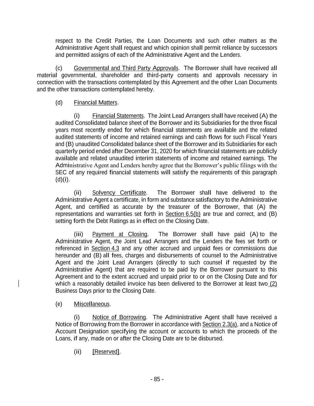 - 85 - respect to the Credit Parties, the Loan Documents and such other matters as the Administrative Agent shall request and which opinion shall permit reliance by successors and permitted assigns of each of the Administrative Agent and the Lenders. (c) Governmental and Third Party Approvals. The Borrower shall have received all material governmental, shareholder and third-party consents and approvals necessary in connection with the transactions contemplated by this Agreement and the other Loan Documents and the other transactions contemplated hereby. (d) Financial Matters. (i) Financial Statements. The Joint Lead Arrangers shall have received (A) the audited Consolidated balance sheet of the Borrower and its Subsidiaries for the three fiscal years most recently ended for which financial statements are available and the related audited statements of income and retained earnings and cash flows for such Fiscal Years and (B) unaudited Consolidated balance sheet of the Borrower and its Subsidiaries for each quarterly period ended after December 31, 2020 for which financial statements are publicly available and related unaudited interim statements of income and retained earnings. The Administrative Agent and Lenders hereby agree that the Borrower’s public filings with the SEC of any required financial statements will satisfy the requirements of this paragraph (d)(i). (ii) Solvency Certificate. The Borrower shall have delivered to the Administrative Agent a certificate, in form and substance satisfactory to the Administrative Agent, and certified as accurate by the treasurer of the Borrower, that (A) the representations and warranties set forth in Section 6.5(b) are true and correct, and (B) setting forth the Debt Ratings as in effect on the Closing Date. (iii) Payment at Closing. The Borrower shall have paid (A) to the Administrative Agent, the Joint Lead Arrangers and the Lenders the fees set forth or referenced in Section 4.3 and any other accrued and unpaid fees or commissions due hereunder and (B) all fees, charges and disbursements of counsel to the Administrative Agent and the Joint Lead Arrangers (directly to such counsel if requested by the Administrative Agent) that are required to be paid by the Borrower pursuant to this Agreement and to the extent accrued and unpaid prior to or on the Closing Date and for which a reasonably detailed invoice has been delivered to the Borrower at least two (2) Business Days prior to the Closing Date. (e) Miscellaneous. (i) Notice of Borrowing. The Administrative Agent shall have received a Notice of Borrowing from the Borrower in accordance with Section 2.3(a), and a Notice of Account Designation specifying the account or accounts to which the proceeds of the Loans, if any, made on or after the Closing Date are to be disbursed. (ii) [Reserved].