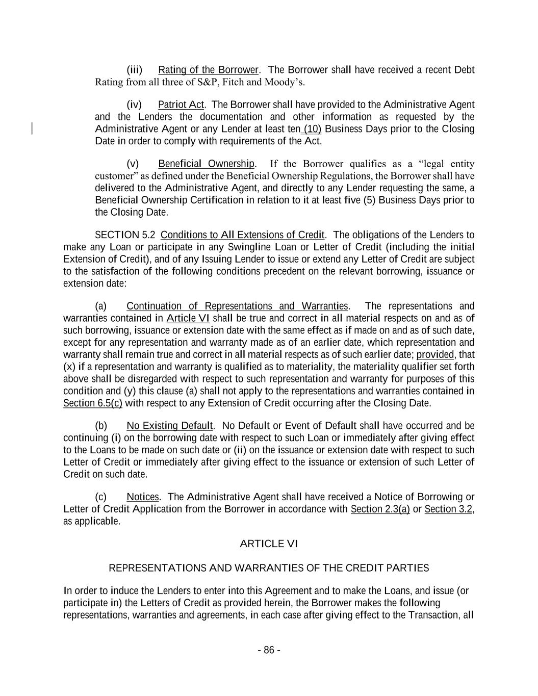 - 86 - (iii) Rating of the Borrower. The Borrower shall have received a recent Debt Rating from all three of S&P, Fitch and Moody’s. (iv) Patriot Act. The Borrower shall have provided to the Administrative Agent and the Lenders the documentation and other information as requested by the Administrative Agent or any Lender at least ten (10) Business Days prior to the Closing Date in order to comply with requirements of the Act. (v) Beneficial Ownership. If the Borrower qualifies as a “legal entity customer” as defined under the Beneficial Ownership Regulations, the Borrower shall have delivered to the Administrative Agent, and directly to any Lender requesting the same, a Beneficial Ownership Certification in relation to it at least five (5) Business Days prior to the Closing Date. SECTION 5.2 Conditions to All Extensions of Credit. The obligations of the Lenders to make any Loan or participate in any Swingline Loan or Letter of Credit (including the initial Extension of Credit), and of any Issuing Lender to issue or extend any Letter of Credit are subject to the satisfaction of the following conditions precedent on the relevant borrowing, issuance or extension date: (a) Continuation of Representations and Warranties. The representations and warranties contained in Article VI shall be true and correct in all material respects on and as of such borrowing, issuance or extension date with the same effect as if made on and as of such date, except for any representation and warranty made as of an earlier date, which representation and warranty shall remain true and correct in all material respects as of such earlier date; provided, that (x) if a representation and warranty is qualified as to materiality, the materiality qualifier set forth above shall be disregarded with respect to such representation and warranty for purposes of this condition and (y) this clause (a) shall not apply to the representations and warranties contained in Section 6.5(c) with respect to any Extension of Credit occurring after the Closing Date. (b) No Existing Default. No Default or Event of Default shall have occurred and be continuing (i) on the borrowing date with respect to such Loan or immediately after giving effect to the Loans to be made on such date or (ii) on the issuance or extension date with respect to such Letter of Credit or immediately after giving effect to the issuance or extension of such Letter of Credit on such date. (c) Notices. The Administrative Agent shall have received a Notice of Borrowing or Letter of Credit Application from the Borrower in accordance with Section 2.3(a) or Section 3.2, as applicable. ARTICLE VI REPRESENTATIONS AND WARRANTIES OF THE CREDIT PARTIES In order to induce the Lenders to enter into this Agreement and to make the Loans, and issue (or participate in) the Letters of Credit as provided herein, the Borrower makes the following representations, warranties and agreements, in each case after giving effect to the Transaction, all