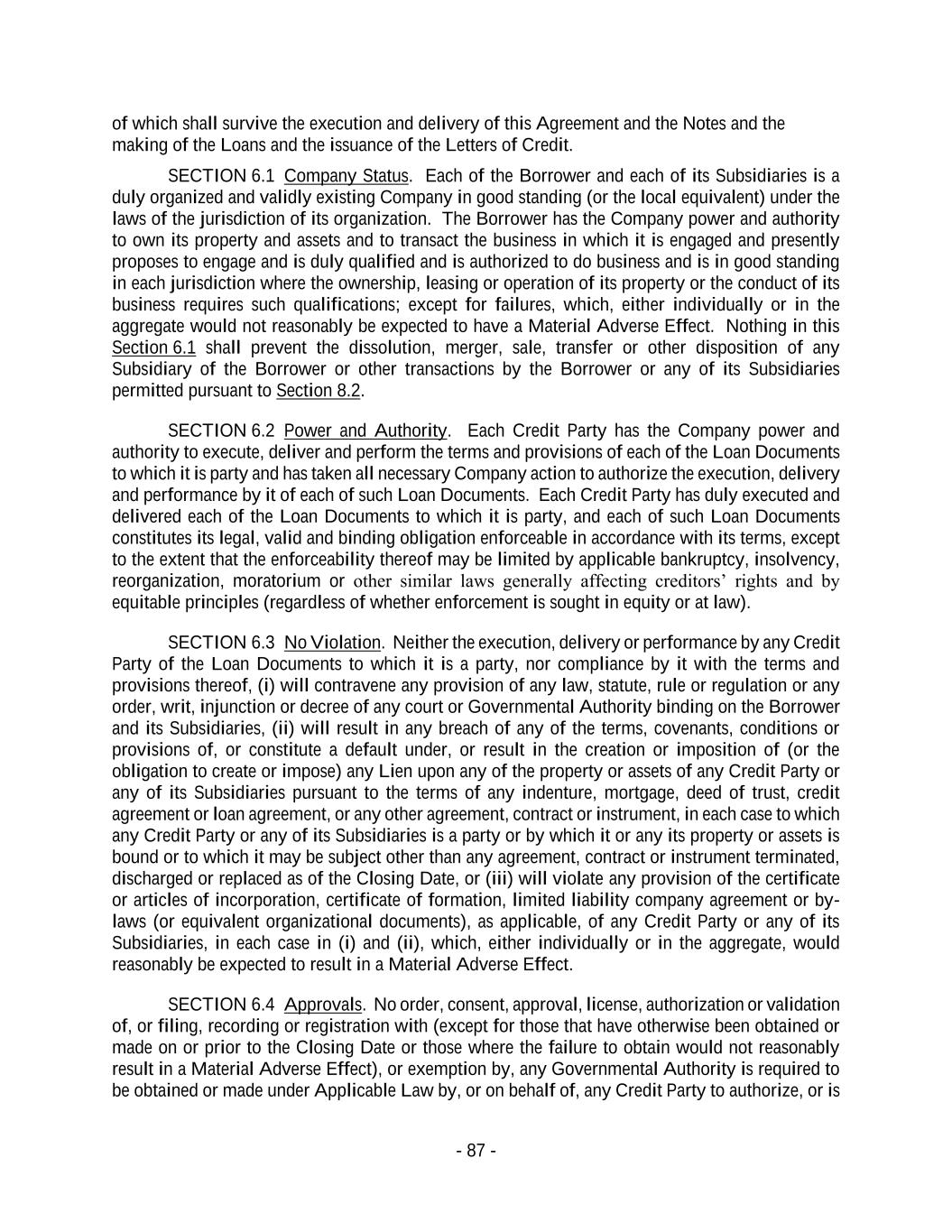 - 87 - of which shall survive the execution and delivery of this Agreement and the Notes and the making of the Loans and the issuance of the Letters of Credit. SECTION 6.1 Company Status. Each of the Borrower and each of its Subsidiaries is a duly organized and validly existing Company in good standing (or the local equivalent) under the laws of the jurisdiction of its organization. The Borrower has the Company power and authority to own its property and assets and to transact the business in which it is engaged and presently proposes to engage and is duly qualified and is authorized to do business and is in good standing in each jurisdiction where the ownership, leasing or operation of its property or the conduct of its business requires such qualifications; except for failures, which, either individually or in the aggregate would not reasonably be expected to have a Material Adverse Effect. Nothing in this Section 6.1 shall prevent the dissolution, merger, sale, transfer or other disposition of any Subsidiary of the Borrower or other transactions by the Borrower or any of its Subsidiaries permitted pursuant to Section 8.2. SECTION 6.2 Power and Authority. Each Credit Party has the Company power and authority to execute, deliver and perform the terms and provisions of each of the Loan Documents to which it is party and has taken all necessary Company action to authorize the execution, delivery and performance by it of each of such Loan Documents. Each Credit Party has duly executed and delivered each of the Loan Documents to which it is party, and each of such Loan Documents constitutes its legal, valid and binding obligation enforceable in accordance with its terms, except to the extent that the enforceability thereof may be limited by applicable bankruptcy, insolvency, reorganization, moratorium or other similar laws generally affecting creditors’ rights and by equitable principles (regardless of whether enforcement is sought in equity or at law). SECTION 6.3 No Violation. Neither the execution, delivery or performance by any Credit Party of the Loan Documents to which it is a party, nor compliance by it with the terms and provisions thereof, (i) will contravene any provision of any law, statute, rule or regulation or any order, writ, injunction or decree of any court or Governmental Authority binding on the Borrower and its Subsidiaries, (ii) will result in any breach of any of the terms, covenants, conditions or provisions of, or constitute a default under, or result in the creation or imposition of (or the obligation to create or impose) any Lien upon any of the property or assets of any Credit Party or any of its Subsidiaries pursuant to the terms of any indenture, mortgage, deed of trust, credit agreement or loan agreement, or any other agreement, contract or instrument, in each case to which any Credit Party or any of its Subsidiaries is a party or by which it or any its property or assets is bound or to which it may be subject other than any agreement, contract or instrument terminated, discharged or replaced as of the Closing Date, or (iii) will violate any provision of the certificate or articles of incorporation, certificate of formation, limited liability company agreement or by- laws (or equivalent organizational documents), as applicable, of any Credit Party or any of its Subsidiaries, in each case in (i) and (ii), which, either individually or in the aggregate, would reasonably be expected to result in a Material Adverse Effect. SECTION 6.4 Approvals. No order, consent, approval, license, authorization or validation of, or filing, recording or registration with (except for those that have otherwise been obtained or made on or prior to the Closing Date or those where the failure to obtain would not reasonably result in a Material Adverse Effect), or exemption by, any Governmental Authority is required to be obtained or made under Applicable Law by, or on behalf of, any Credit Party to authorize, or is