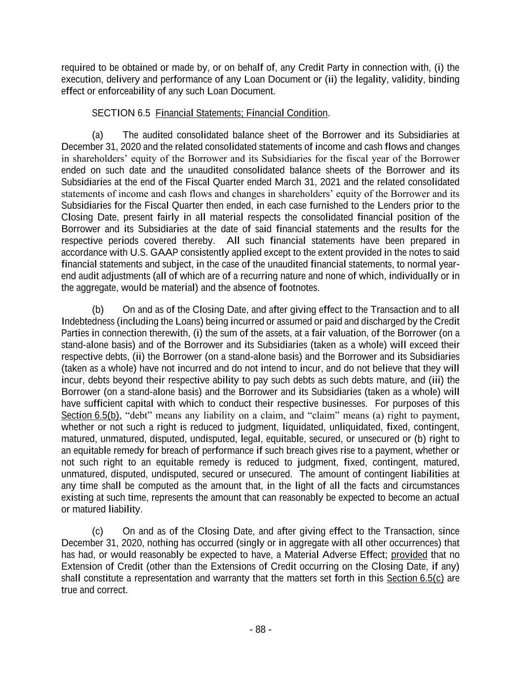 - 88 - required to be obtained or made by, or on behalf of, any Credit Party in connection with, (i) the execution, delivery and performance of any Loan Document or (ii) the legality, validity, binding effect or enforceability of any such Loan Document. SECTION 6.5 Financial Statements; Financial Condition. (a) The audited consolidated balance sheet of the Borrower and its Subsidiaries at December 31, 2020 and the related consolidated statements of income and cash flows and changes in shareholders’ equity of the Borrower and its Subsidiaries for the fiscal year of the Borrower ended on such date and the unaudited consolidated balance sheets of the Borrower and its Subsidiaries at the end of the Fiscal Quarter ended March 31, 2021 and the related consolidated statements of income and cash flows and changes in shareholders’ equity of the Borrower and its Subsidiaries for the Fiscal Quarter then ended, in each case furnished to the Lenders prior to the Closing Date, present fairly in all material respects the consolidated financial position of the Borrower and its Subsidiaries at the date of said financial statements and the results for the respective periods covered thereby. All such financial statements have been prepared in accordance with U.S. GAAP consistently applied except to the extent provided in the notes to said financial statements and subject, in the case of the unaudited financial statements, to normal year- end audit adjustments (all of which are of a recurring nature and none of which, individually or in the aggregate, would be material) and the absence of footnotes. (b) On and as of the Closing Date, and after giving effect to the Transaction and to all Indebtedness (including the Loans) being incurred or assumed or paid and discharged by the Credit Parties in connection therewith, (i) the sum of the assets, at a fair valuation, of the Borrower (on a stand-alone basis) and of the Borrower and its Subsidiaries (taken as a whole) will exceed their respective debts, (ii) the Borrower (on a stand-alone basis) and the Borrower and its Subsidiaries (taken as a whole) have not incurred and do not intend to incur, and do not believe that they will incur, debts beyond their respective ability to pay such debts as such debts mature, and (iii) the Borrower (on a stand-alone basis) and the Borrower and its Subsidiaries (taken as a whole) will have sufficient capital with which to conduct their respective businesses. For purposes of this Section 6.5(b), “debt” means any liability on a claim, and “claim” means (a) right to payment, whether or not such a right is reduced to judgment, liquidated, unliquidated, fixed, contingent, matured, unmatured, disputed, undisputed, legal, equitable, secured, or unsecured or (b) right to an equitable remedy for breach of performance if such breach gives rise to a payment, whether or not such right to an equitable remedy is reduced to judgment, fixed, contingent, matured, unmatured, disputed, undisputed, secured or unsecured. The amount of contingent liabilities at any time shall be computed as the amount that, in the light of all the facts and circumstances existing at such time, represents the amount that can reasonably be expected to become an actual or matured liability. (c) On and as of the Closing Date, and after giving effect to the Transaction, since December 31, 2020, nothing has occurred (singly or in aggregate with all other occurrences) that has had, or would reasonably be expected to have, a Material Adverse Effect; provided that no Extension of Credit (other than the Extensions of Credit occurring on the Closing Date, if any) shall constitute a representation and warranty that the matters set forth in this Section 6.5(c) are true and correct.