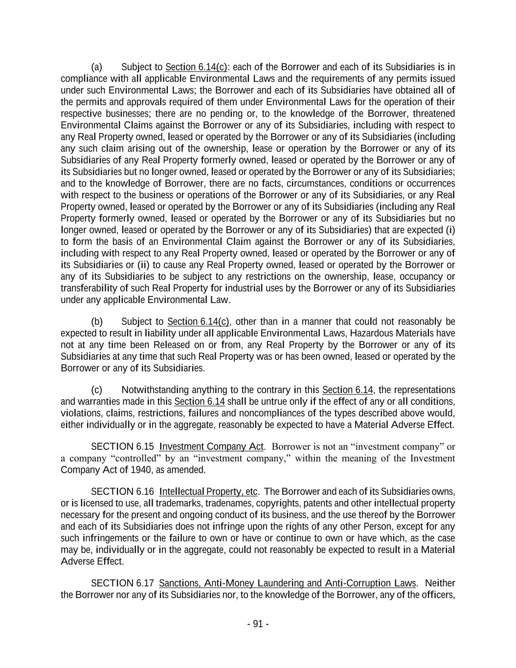 - 91 - (a) Subject to Section 6.14(c): each of the Borrower and each of its Subsidiaries is in compliance with all applicable Environmental Laws and the requirements of any permits issued under such Environmental Laws; the Borrower and each of its Subsidiaries have obtained all of the permits and approvals required of them under Environmental Laws for the operation of their respective businesses; there are no pending or, to the knowledge of the Borrower, threatened Environmental Claims against the Borrower or any of its Subsidiaries, including with respect to any Real Property owned, leased or operated by the Borrower or any of its Subsidiaries (including any such claim arising out of the ownership, lease or operation by the Borrower or any of its Subsidiaries of any Real Property formerly owned, leased or operated by the Borrower or any of its Subsidiaries but no longer owned, leased or operated by the Borrower or any of its Subsidiaries; and to the knowledge of Borrower, there are no facts, circumstances, conditions or occurrences with respect to the business or operations of the Borrower or any of its Subsidiaries, or any Real Property owned, leased or operated by the Borrower or any of its Subsidiaries (including any Real Property formerly owned, leased or operated by the Borrower or any of its Subsidiaries but no longer owned, leased or operated by the Borrower or any of its Subsidiaries) that are expected (i) to form the basis of an Environmental Claim against the Borrower or any of its Subsidiaries, including with respect to any Real Property owned, leased or operated by the Borrower or any of its Subsidiaries or (ii) to cause any Real Property owned, leased or operated by the Borrower or any of its Subsidiaries to be subject to any restrictions on the ownership, lease, occupancy or transferability of such Real Property for industrial uses by the Borrower or any of its Subsidiaries under any applicable Environmental Law. (b) Subject to Section 6.14(c), other than in a manner that could not reasonably be expected to result in liability under all applicable Environmental Laws, Hazardous Materials have not at any time been Released on or from, any Real Property by the Borrower or any of its Subsidiaries at any time that such Real Property was or has been owned, leased or operated by the Borrower or any of its Subsidiaries. (c) Notwithstanding anything to the contrary in this Section 6.14, the representations and warranties made in this Section 6.14 shall be untrue only if the effect of any or all conditions, violations, claims, restrictions, failures and noncompliances of the types described above would, either individually or in the aggregate, reasonably be expected to have a Material Adverse Effect. SECTION 6.15 Investment Company Act. Borrower is not an “investment company” or a company “controlled” by an “investment company,” within the meaning of the Investment Company Act of 1940, as amended. SECTION 6.16 Intellectual Property, etc. The Borrower and each of its Subsidiaries owns, or is licensed to use, all trademarks, tradenames, copyrights, patents and other intellectual property necessary for the present and ongoing conduct of its business, and the use thereof by the Borrower and each of its Subsidiaries does not infringe upon the rights of any other Person, except for any such infringements or the failure to own or have or continue to own or have which, as the case may be, individually or in the aggregate, could not reasonably be expected to result in a Material Adverse Effect. SECTION 6.17 Sanctions, Anti-Money Laundering and Anti-Corruption Laws. Neither the Borrower nor any of its Subsidiaries nor, to the knowledge of the Borrower, any of the officers,