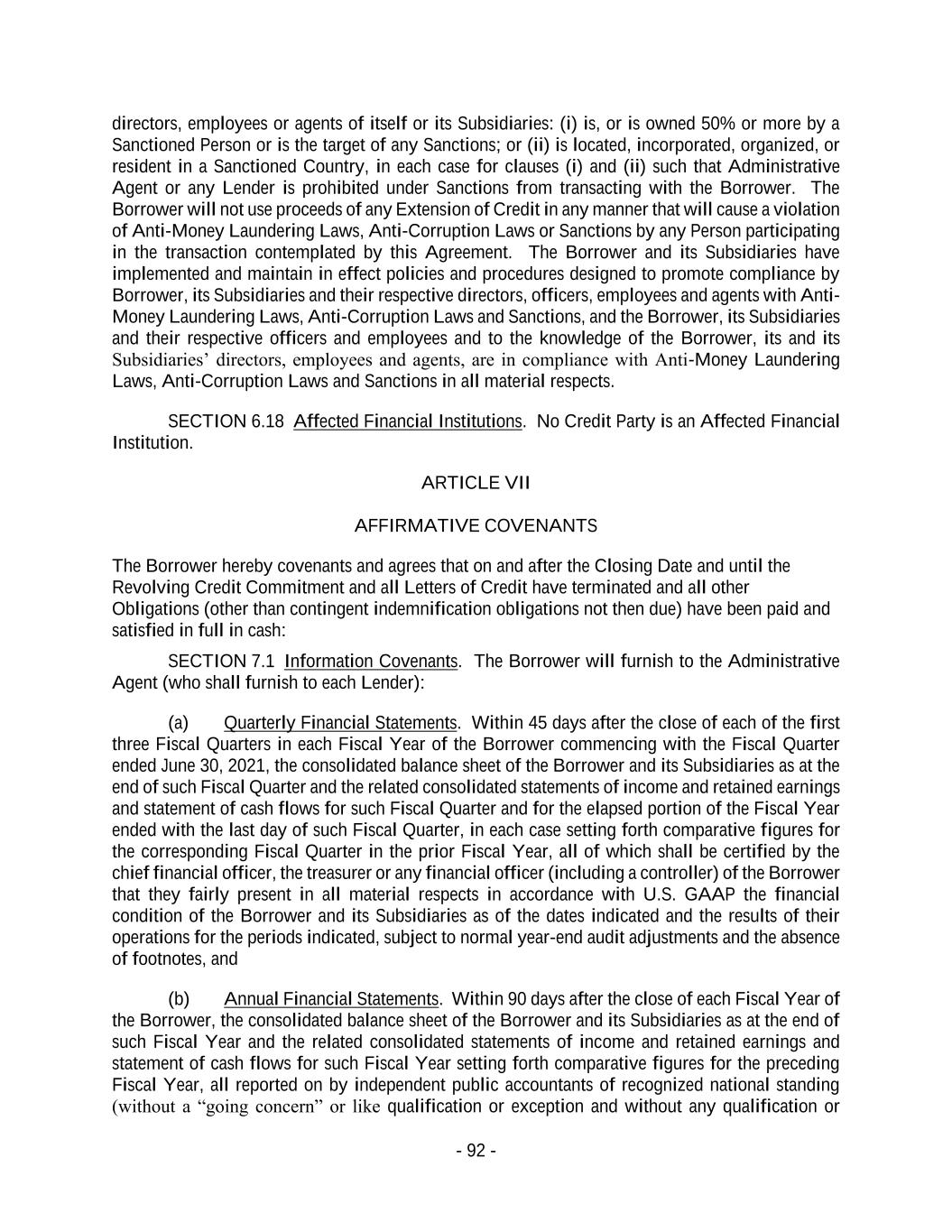 - 92 - directors, employees or agents of itself or its Subsidiaries: (i) is, or is owned 50% or more by a Sanctioned Person or is the target of any Sanctions; or (ii) is located, incorporated, organized, or resident in a Sanctioned Country, in each case for clauses (i) and (ii) such that Administrative Agent or any Lender is prohibited under Sanctions from transacting with the Borrower. The Borrower will not use proceeds of any Extension of Credit in any manner that will cause a violation of Anti-Money Laundering Laws, Anti-Corruption Laws or Sanctions by any Person participating in the transaction contemplated by this Agreement. The Borrower and its Subsidiaries have implemented and maintain in effect policies and procedures designed to promote compliance by Borrower, its Subsidiaries and their respective directors, officers, employees and agents with Anti- Money Laundering Laws, Anti-Corruption Laws and Sanctions, and the Borrower, its Subsidiaries and their respective officers and employees and to the knowledge of the Borrower, its and its Subsidiaries’ directors, employees and agents, are in compliance with Anti-Money Laundering Laws, Anti-Corruption Laws and Sanctions in all material respects. SECTION 6.18 Affected Financial Institutions. No Credit Party is an Affected Financial Institution. ARTICLE VII AFFIRMATIVE COVENANTS The Borrower hereby covenants and agrees that on and after the Closing Date and until the Revolving Credit Commitment and all Letters of Credit have terminated and all other Obligations (other than contingent indemnification obligations not then due) have been paid and satisfied in full in cash: SECTION 7.1 Information Covenants. The Borrower will furnish to the Administrative Agent (who shall furnish to each Lender): (a) Quarterly Financial Statements. Within 45 days after the close of each of the first three Fiscal Quarters in each Fiscal Year of the Borrower commencing with the Fiscal Quarter ended June 30, 2021, the consolidated balance sheet of the Borrower and its Subsidiaries as at the end of such Fiscal Quarter and the related consolidated statements of income and retained earnings and statement of cash flows for such Fiscal Quarter and for the elapsed portion of the Fiscal Year ended with the last day of such Fiscal Quarter, in each case setting forth comparative figures for the corresponding Fiscal Quarter in the prior Fiscal Year, all of which shall be certified by the chief financial officer, the treasurer or any financial officer (including a controller) of the Borrower that they fairly present in all material respects in accordance with U.S. GAAP the financial condition of the Borrower and its Subsidiaries as of the dates indicated and the results of their operations for the periods indicated, subject to normal year-end audit adjustments and the absence of footnotes, and (b) Annual Financial Statements. Within 90 days after the close of each Fiscal Year of the Borrower, the consolidated balance sheet of the Borrower and its Subsidiaries as at the end of such Fiscal Year and the related consolidated statements of income and retained earnings and statement of cash flows for such Fiscal Year setting forth comparative figures for the preceding Fiscal Year, all reported on by independent public accountants of recognized national standing (without a “going concern” or like qualification or exception and without any qualification or